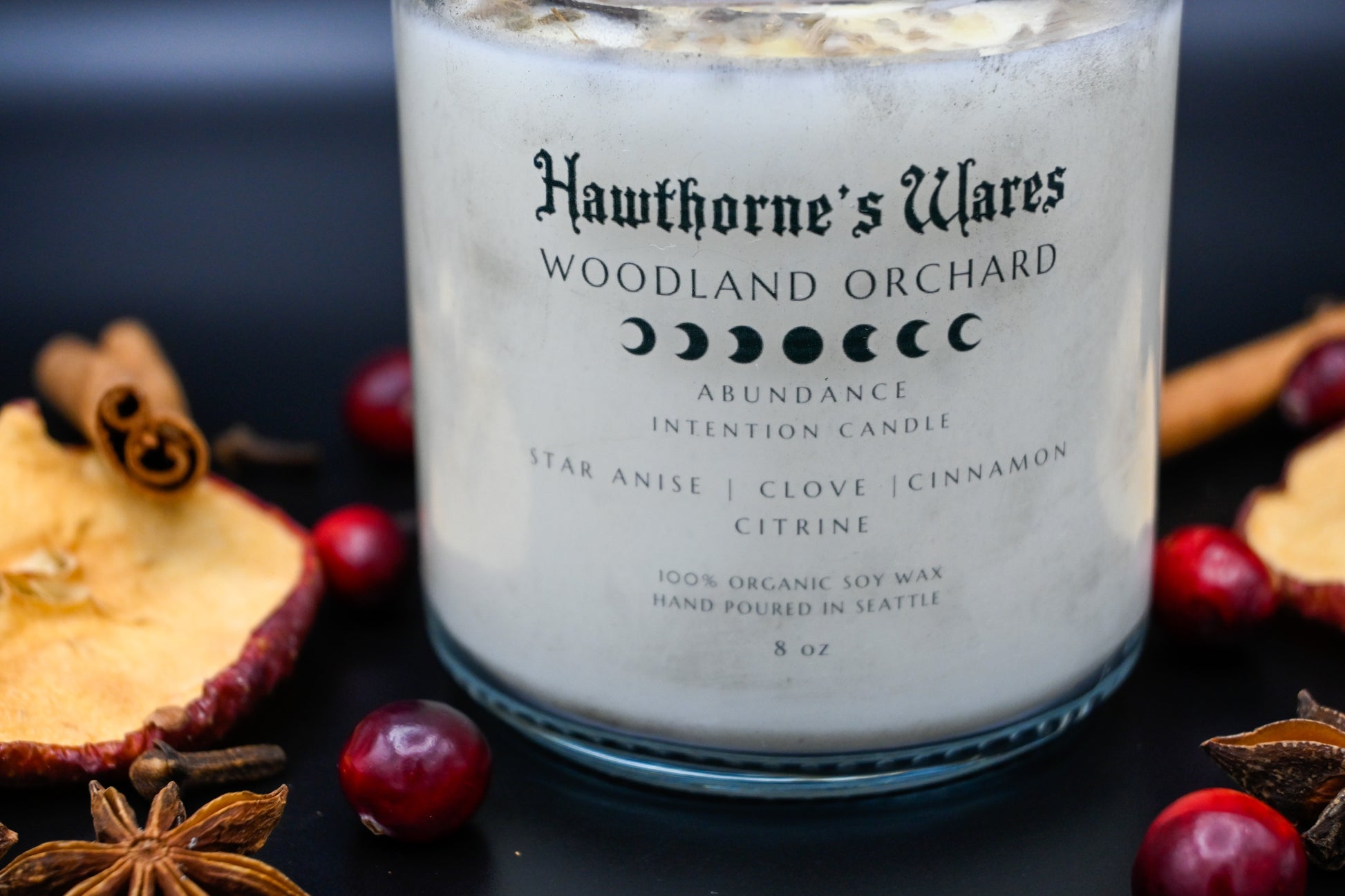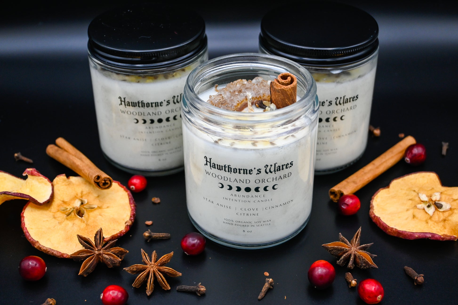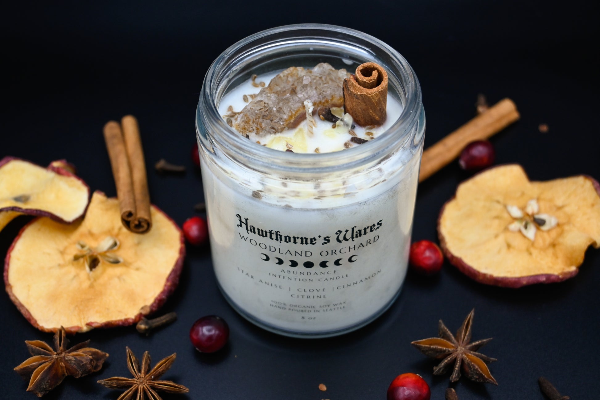 Bring all of the things you want into your life, be abundant in all you do and all you receive, feel abundant in all things you do and are in life. When lighting your new intention candle, simply clear your mind and imagine all the things you want in life coming to you with ease. Everything you desire, flowing into your life and manifesting into reality. Take a nice deep breath, feel the calming aromas of our pine, cranberry and apple orchards fill your senses, exhale deeply and feel negativity flow out of your life. Feel yourself in a forest of inspiration, sprinkled with clove, cinnamon, and strategically placed star anise and cinnamon sticks to promote abundance of riches and and positivity. Each candle comes with a beautiful raw citrine for you to keep and enjoy.