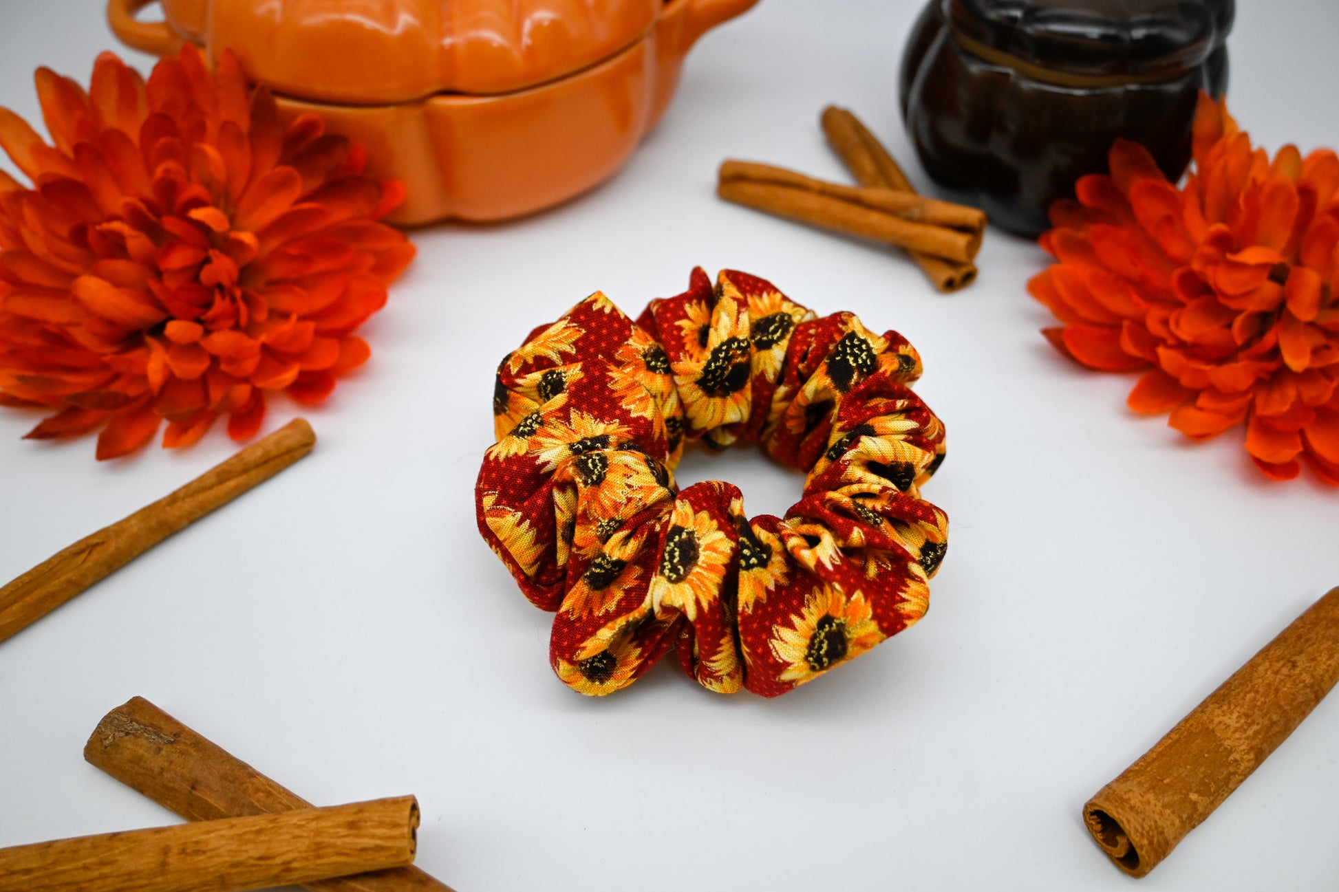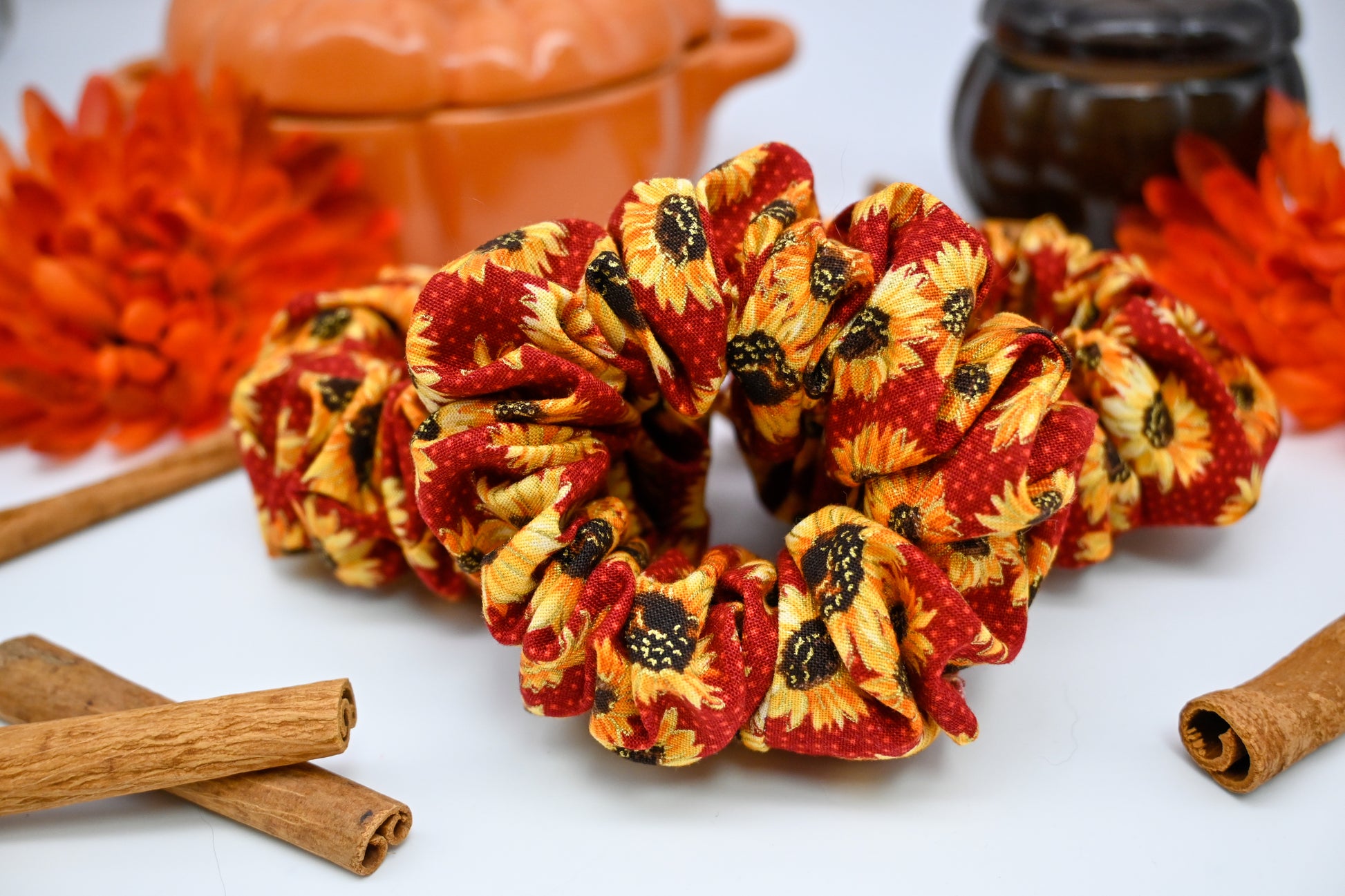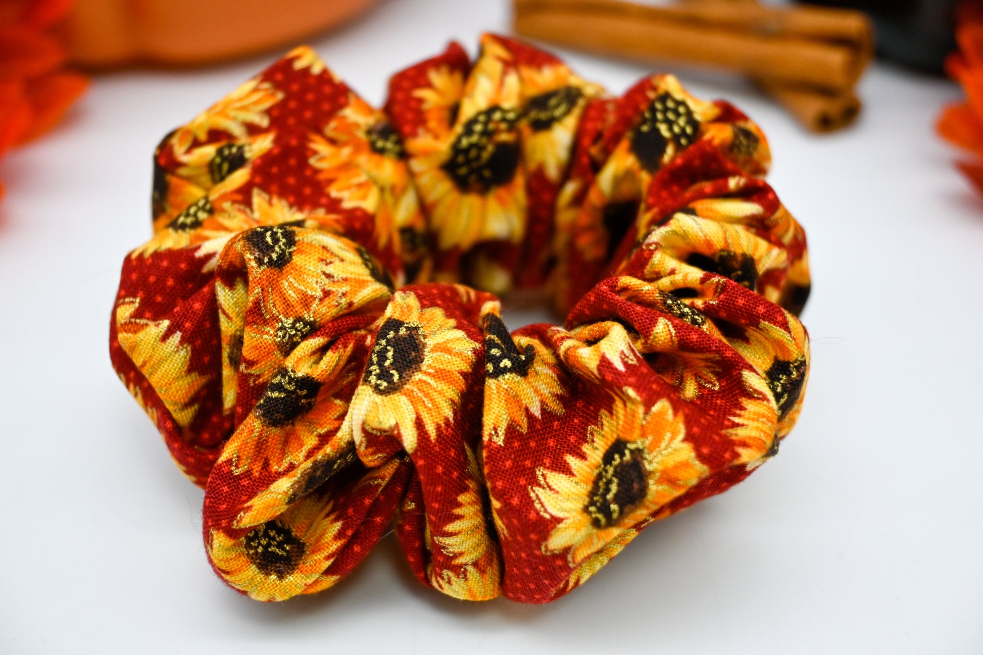 Truly the perfect hair accessory for any occasion, our autumn red sunflower scrunchie features a thick band elastic, soft cotton fabric in a beautiful carmine red with delicate scarlet polka dots. The striking gold foil accents on the beautiful gold and black sunflowers create a flower garden that will make any head turn. With two amazing sizes to choose from, its perfect for anyone with medium to long hair. Our scrunchies are always gentle on hair and prevent breakage, so you can enjoy autumn red sunsets, hanging out with friends and eating sunflower seeds worry free. Getting a gift for a special someone? This is the perfect pick, and extremely special.