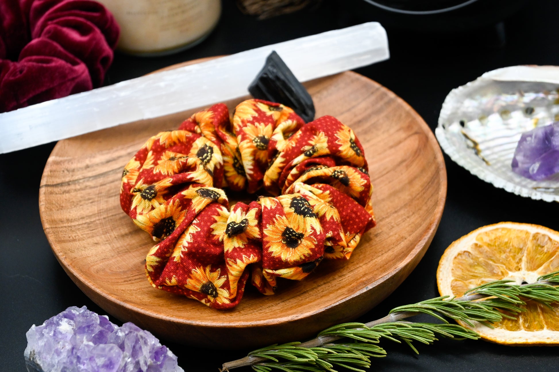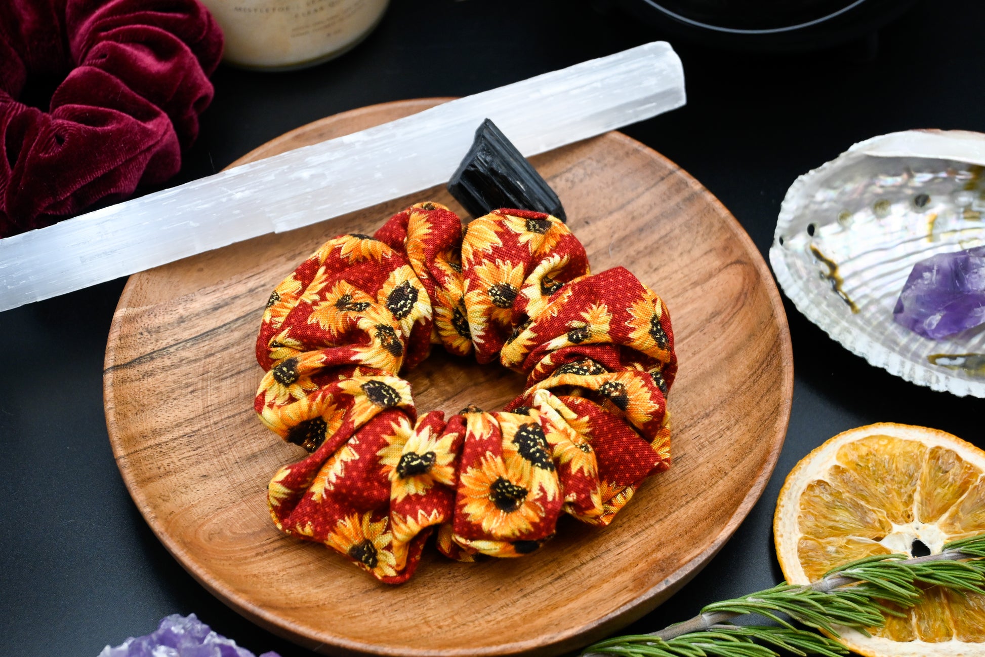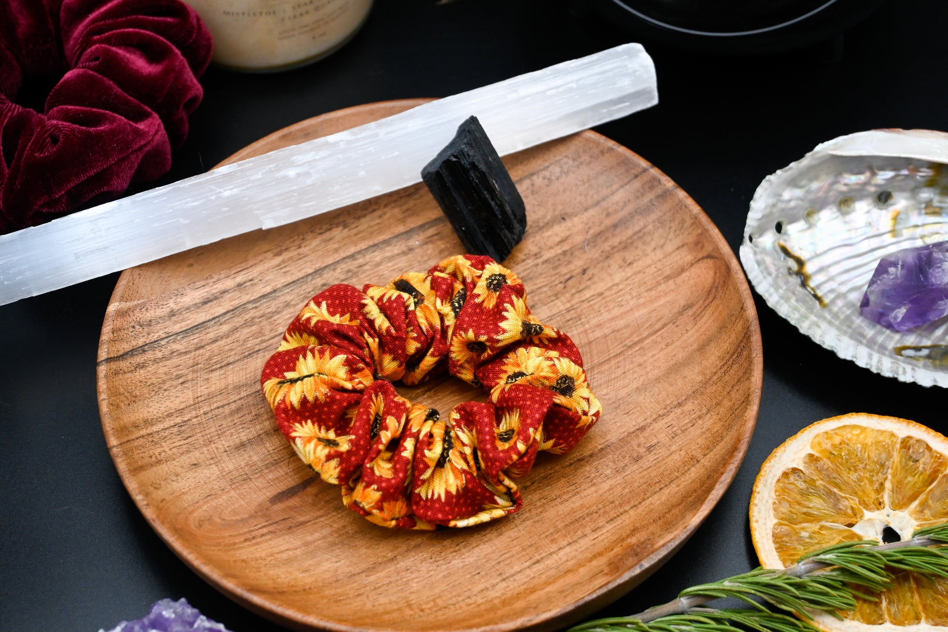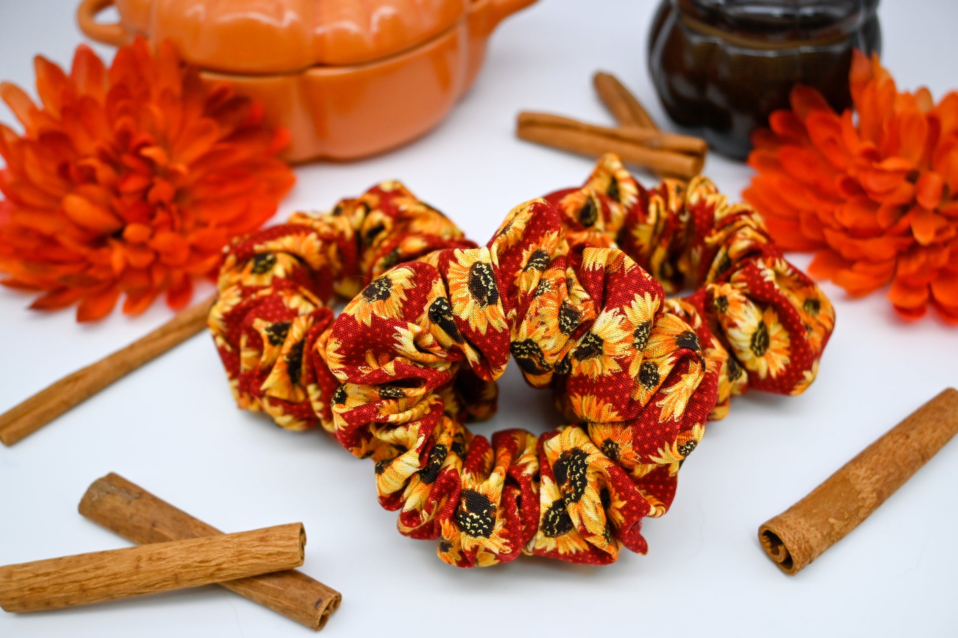 Truly the perfect hair accessory for any occasion, our autumn red sunflower scrunchie features a thick band elastic, soft cotton fabric in a beautiful carmine red with delicate scarlet polka dots. The striking gold foil accents on the beautiful gold and black sunflowers create a flower garden that will make any head turn. With two amazing sizes to choose from, its perfect for anyone with medium to long hair. Our scrunchies are always gentle on hair and prevent breakage, so you can enjoy autumn red sunsets, hanging out with friends and eating sunflower seeds worry free. Getting a gift for a special someone? This is the perfect pick, and extremely special.