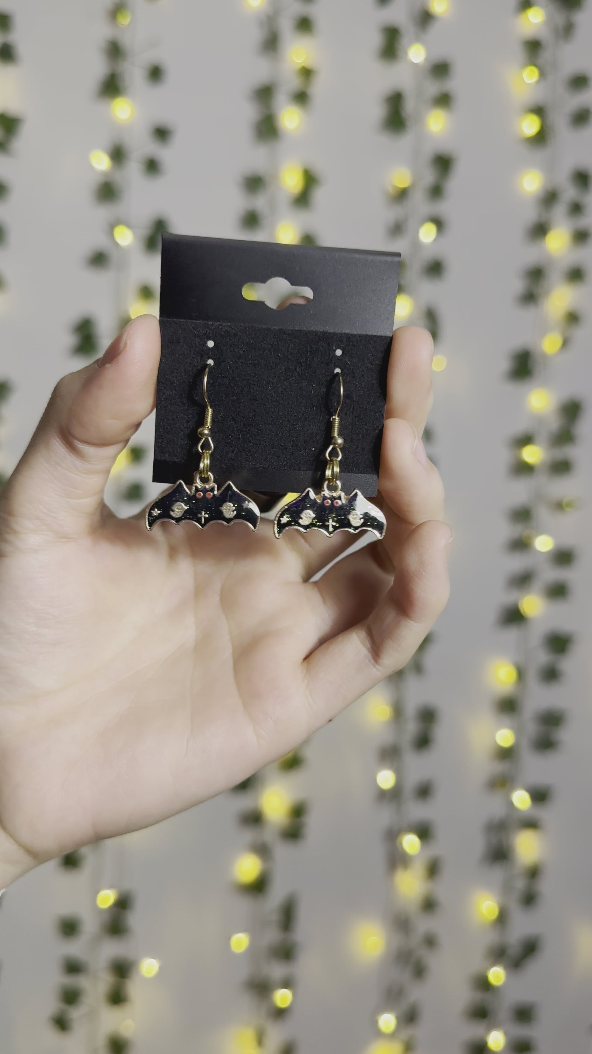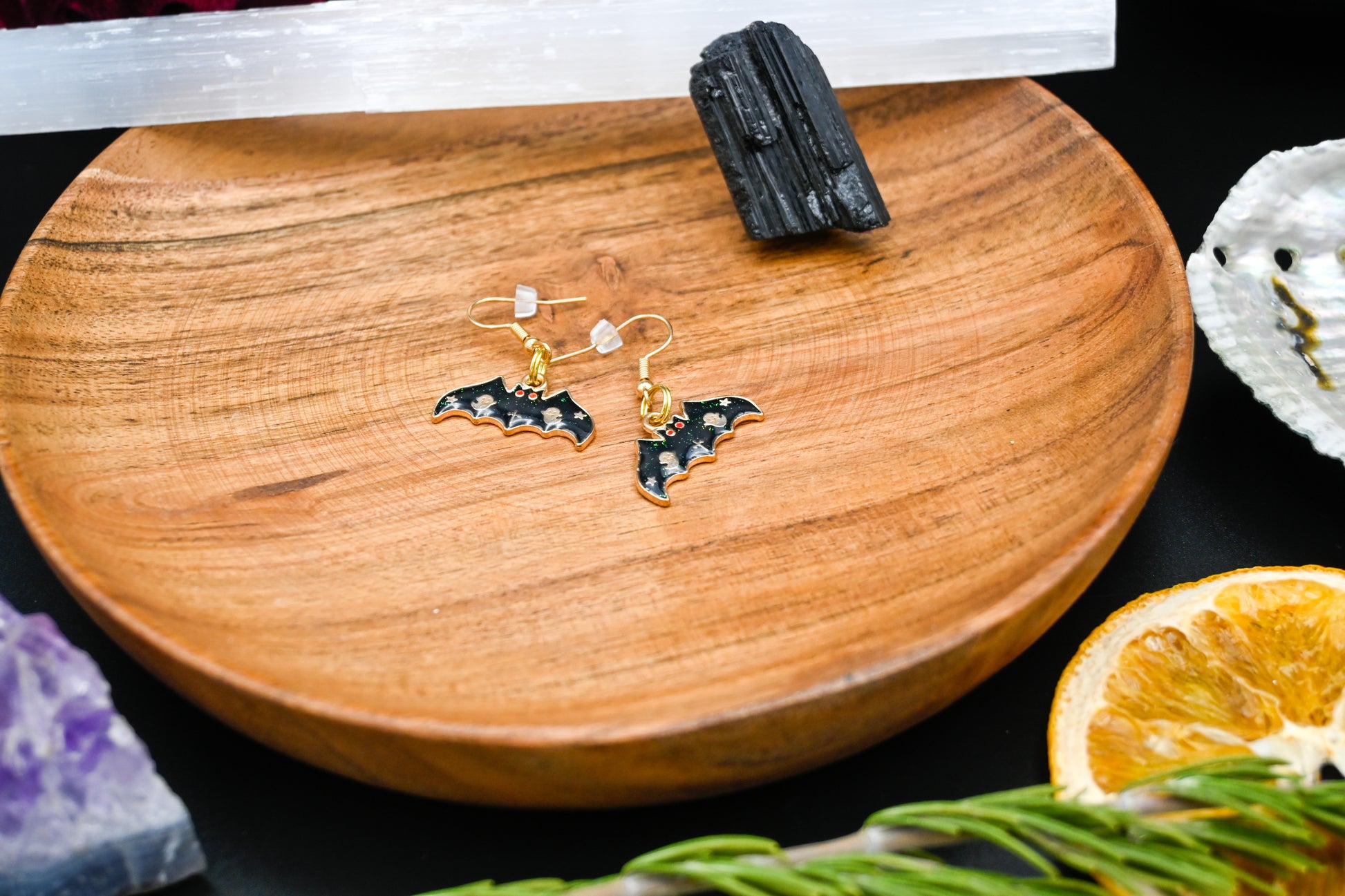 Spooky, glittery, batty and adorable! Each pair of earrings comes as a set and features golden fish hook earrings, a silicone backing for each earring, gold split rings, and an adorable flying bat charm! Our midnight black bats with imbedded toxic green glitter and crimson eyes are gold backed and ready to fly into your heart--and onto your ears. Each adorable bat also features a tiny golden star and a tiny happy gold ghost on each wing, with a small gothic golden cross on it's tummy. Fly on in and capture these adorable bat earrings today!