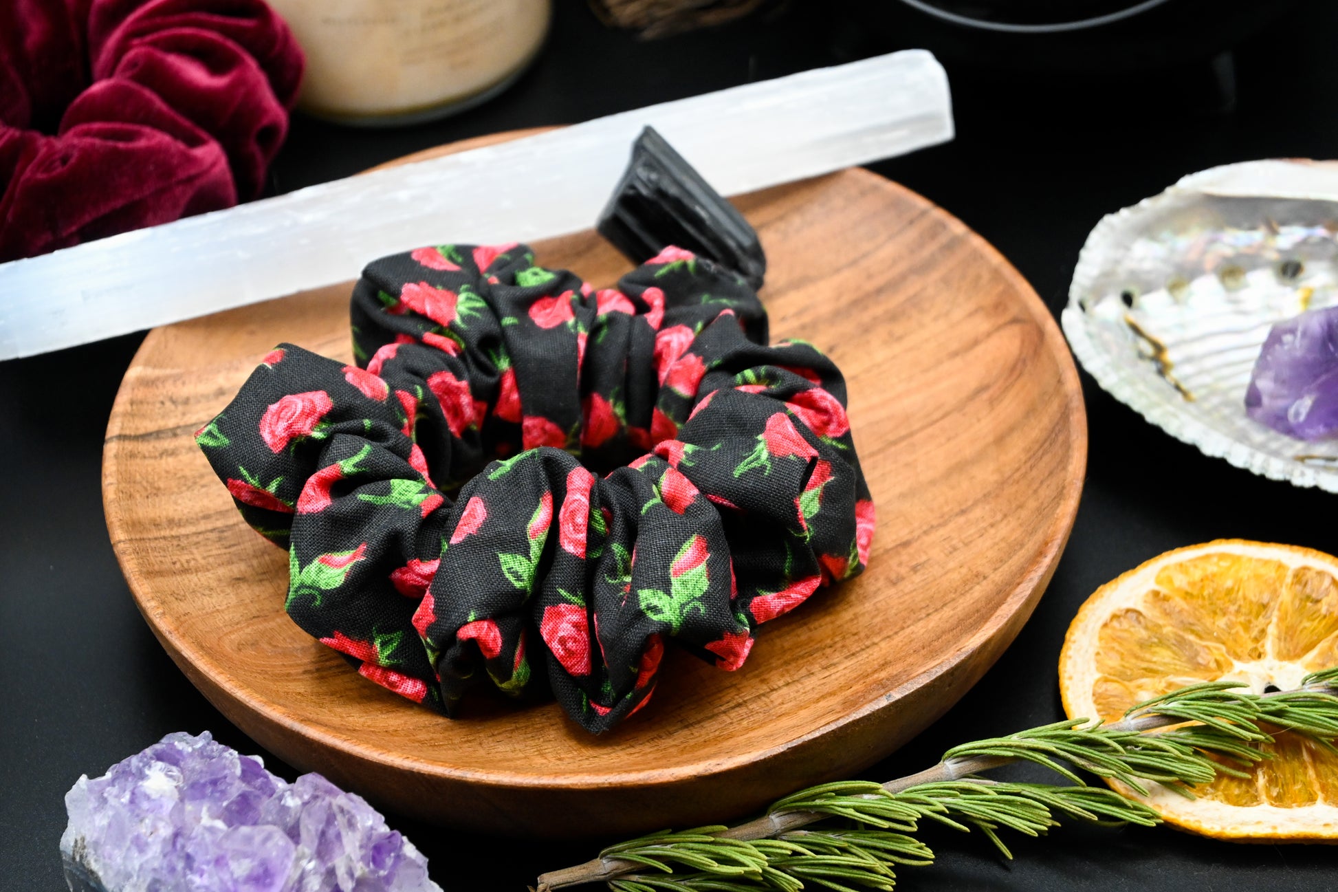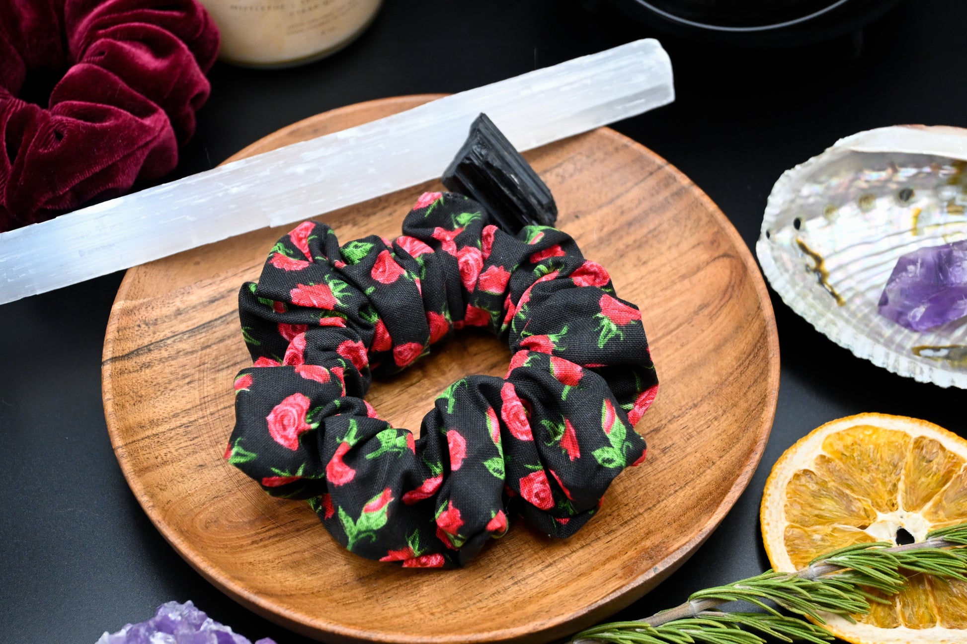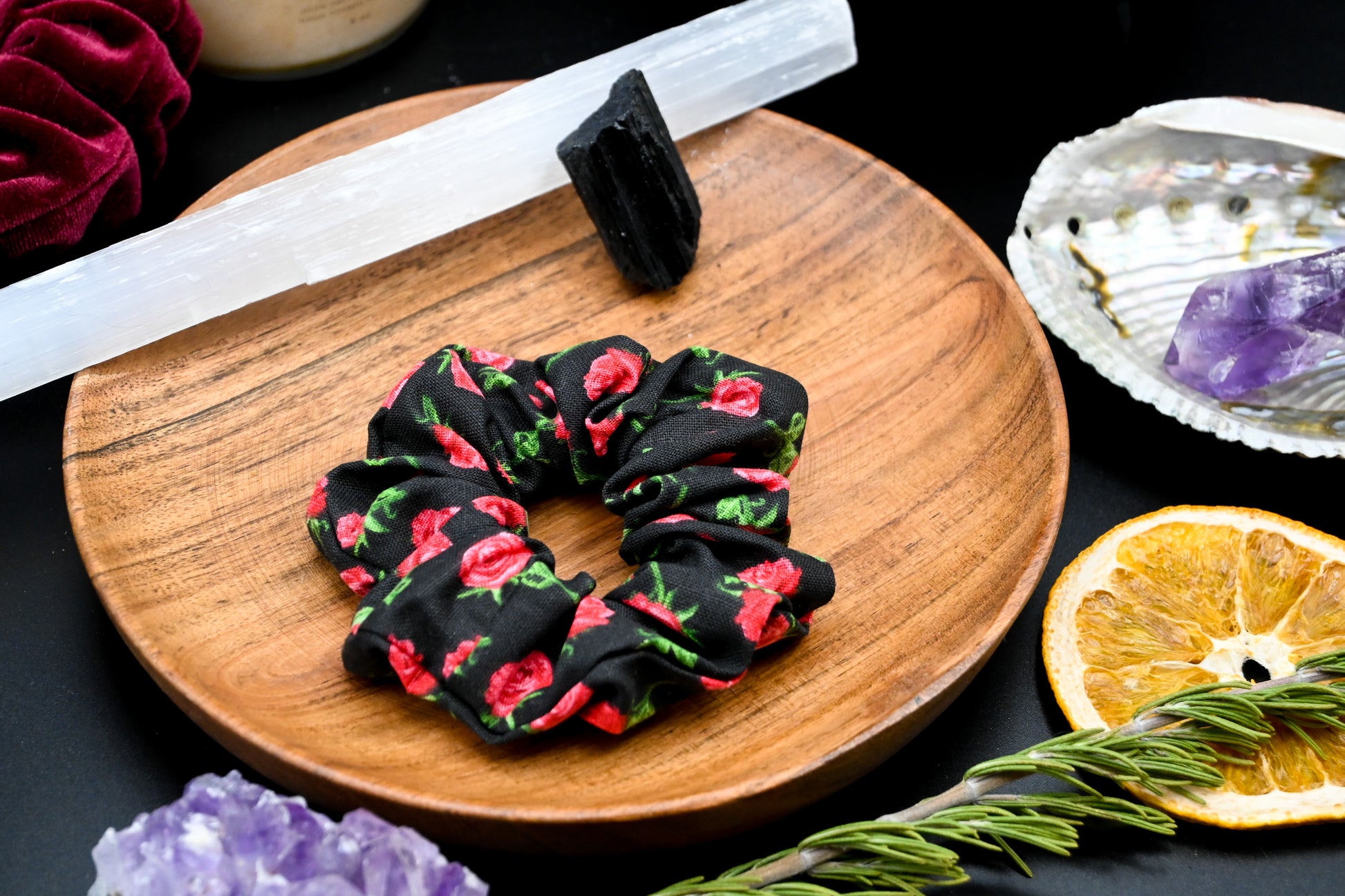 Are your favorite flowers roses? Ours too--we adore this super cute fabric! Pick a couple roses, or pick a whole bouquet! This floral scrunchie has a stark black background, with pops of scarlet red roses and emerald green foliage.