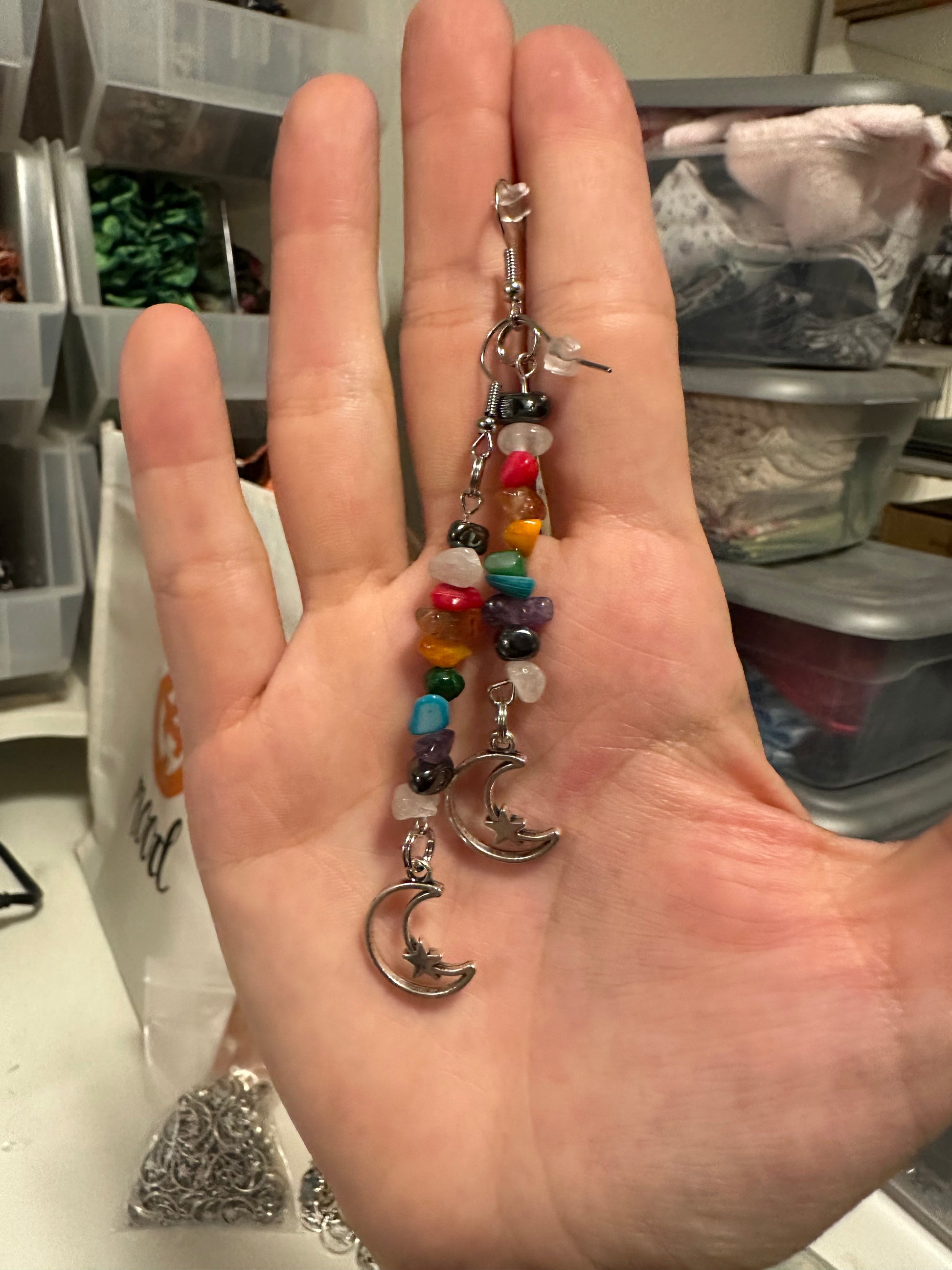 All earrings are carefully handcrafted with silver iron ‘fish hook’ earring wires, eye pins, assorted beads, charms and silver split rings to hold it all together.