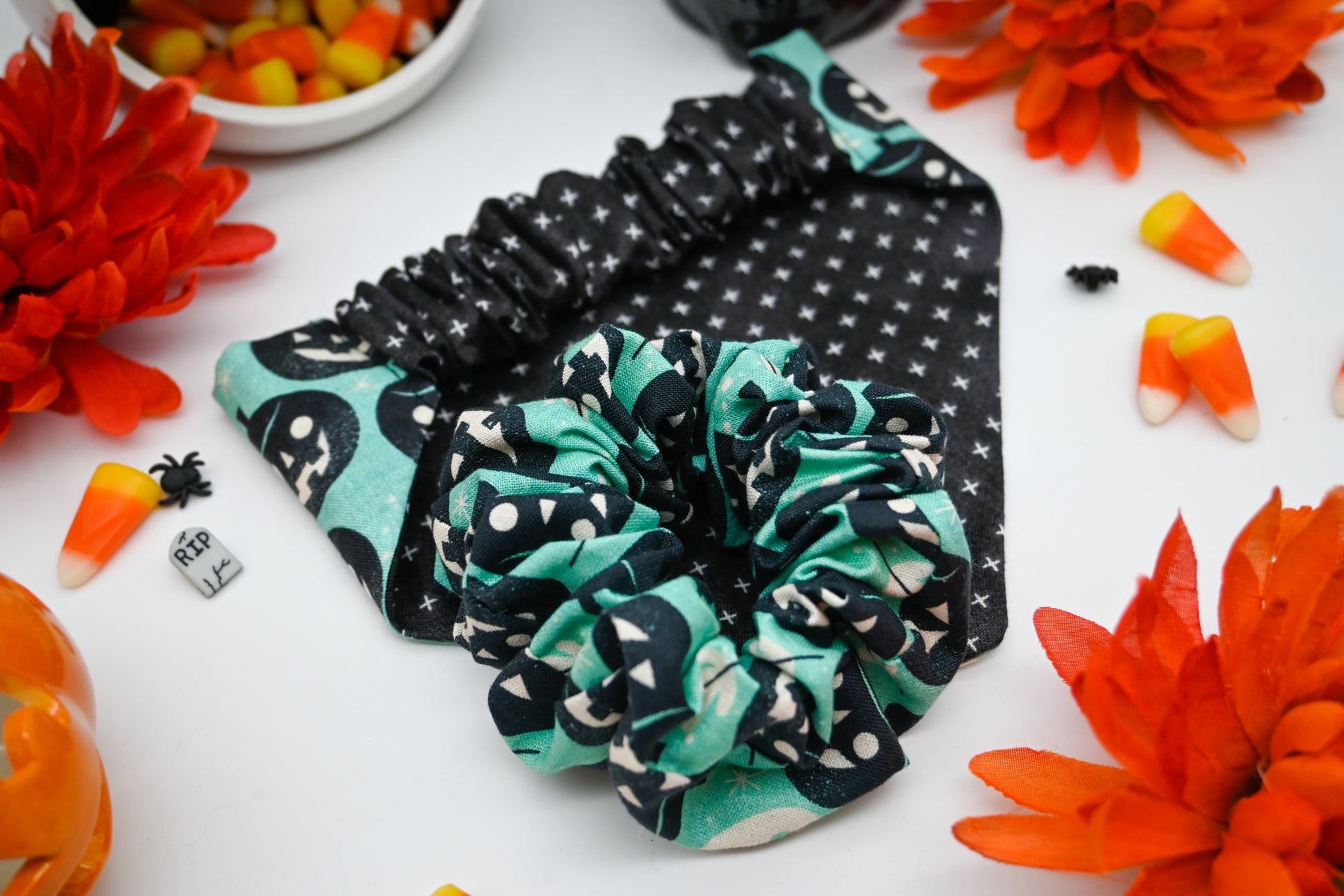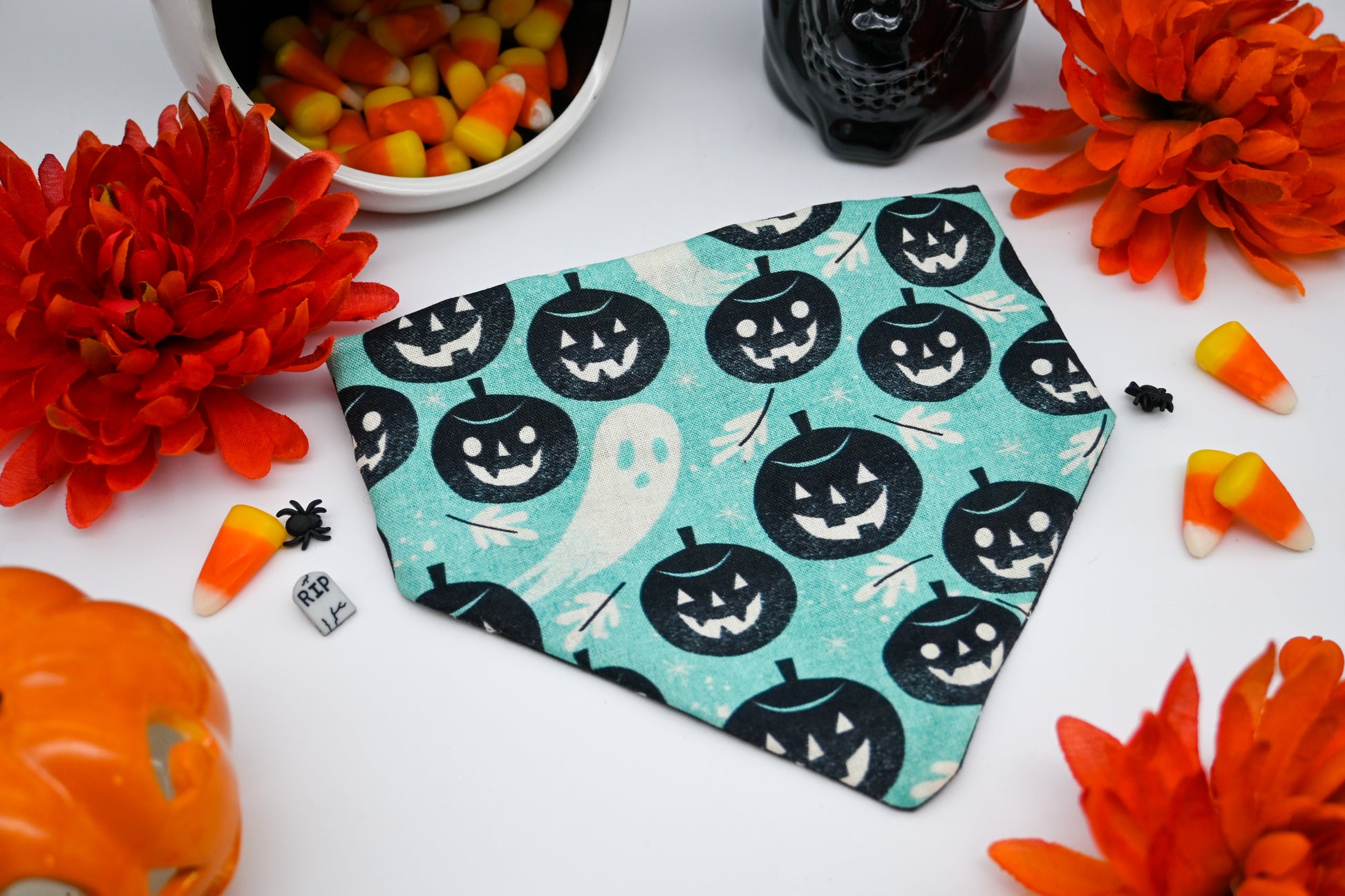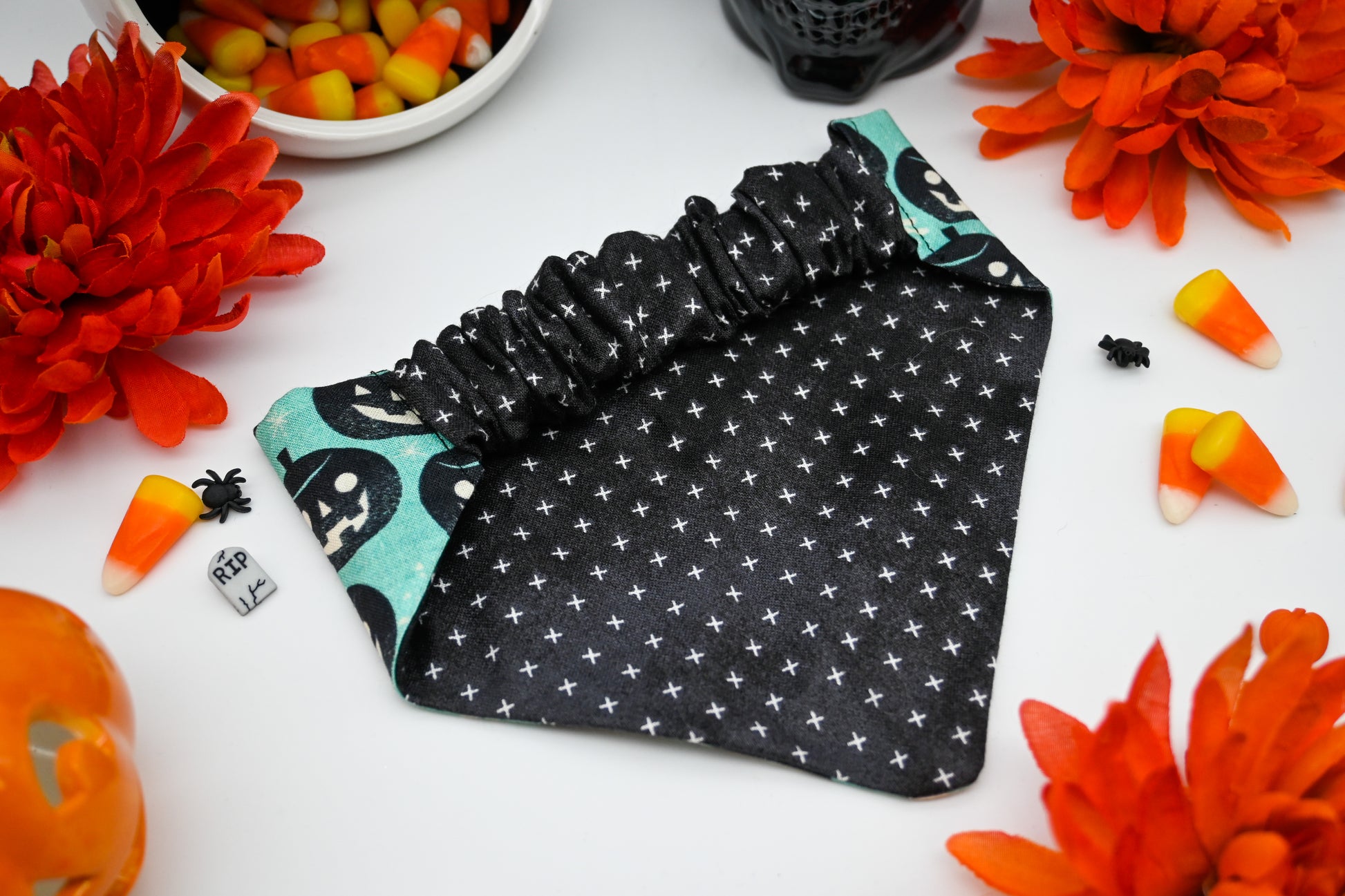Reversible Pet Bandana - Turquoise and Black Pumpkins n Ghosts
