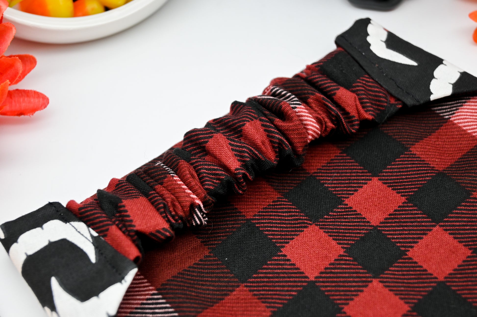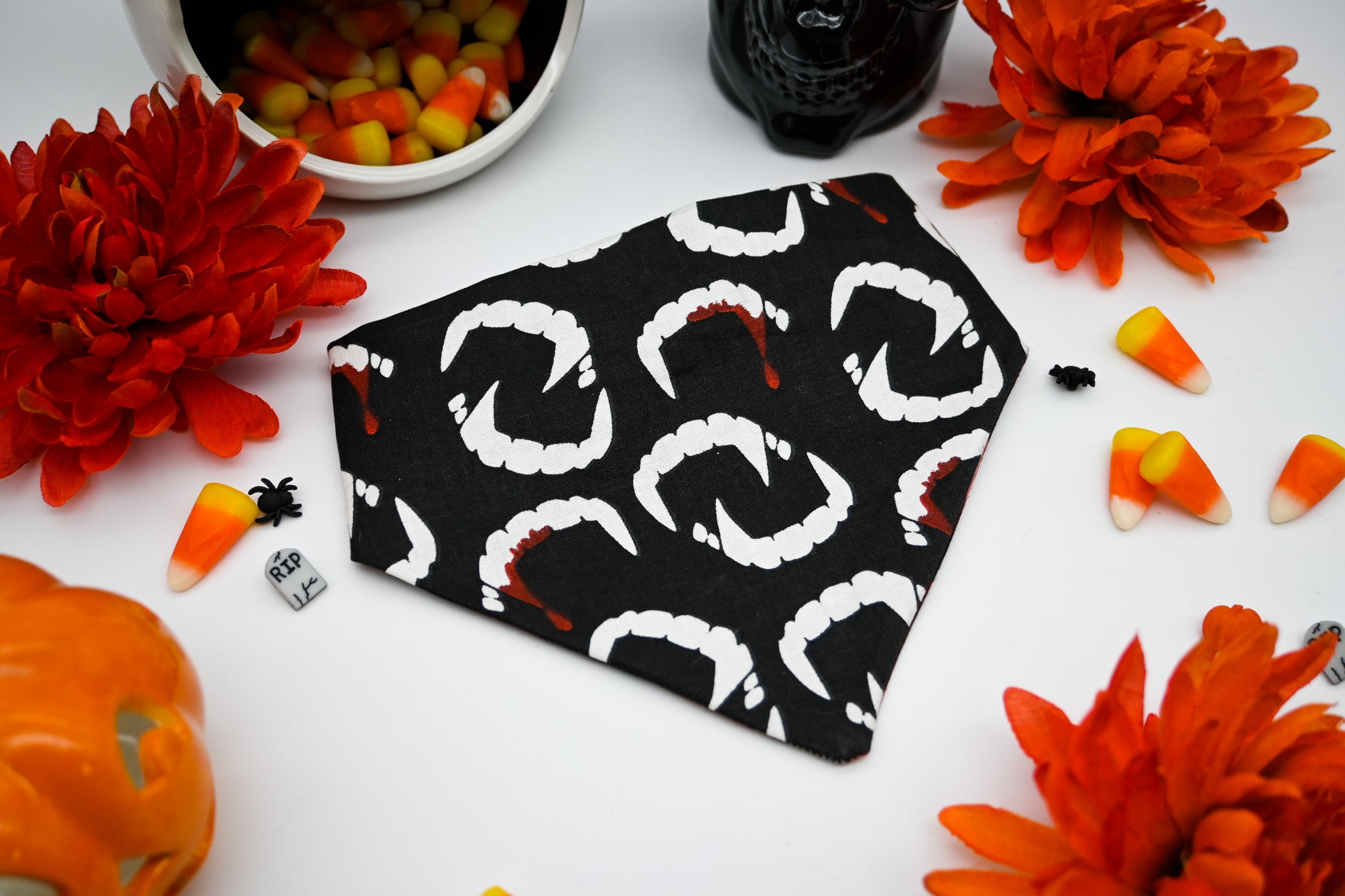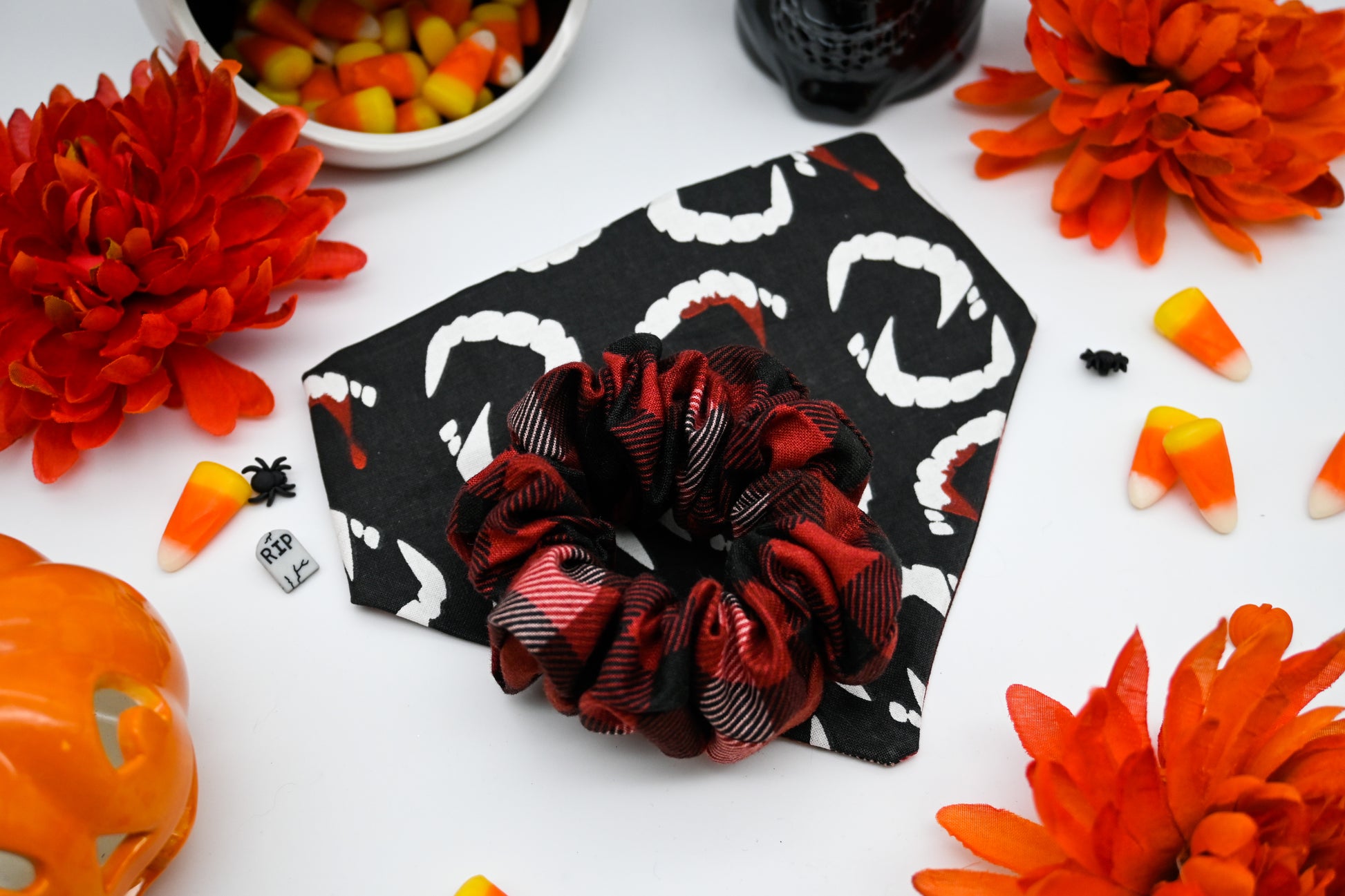 Take a bite out of your favorite season, and be cast under Count Dracula's spell with this fang-tastic reversible pet bandana. Perfect for your favorite furry friend regardless of whether they like to nibble on you or not, or if you just love our cozy red plaid fabric on the reverse side. Sharp white vampire fangs dapple a pitch black background, but watch out, some fangs have crimpson blood dripping from them. The reverse is our red plaid fabric that will make your soul feel warm and cozy, but the shades compliment its other side beautifully.