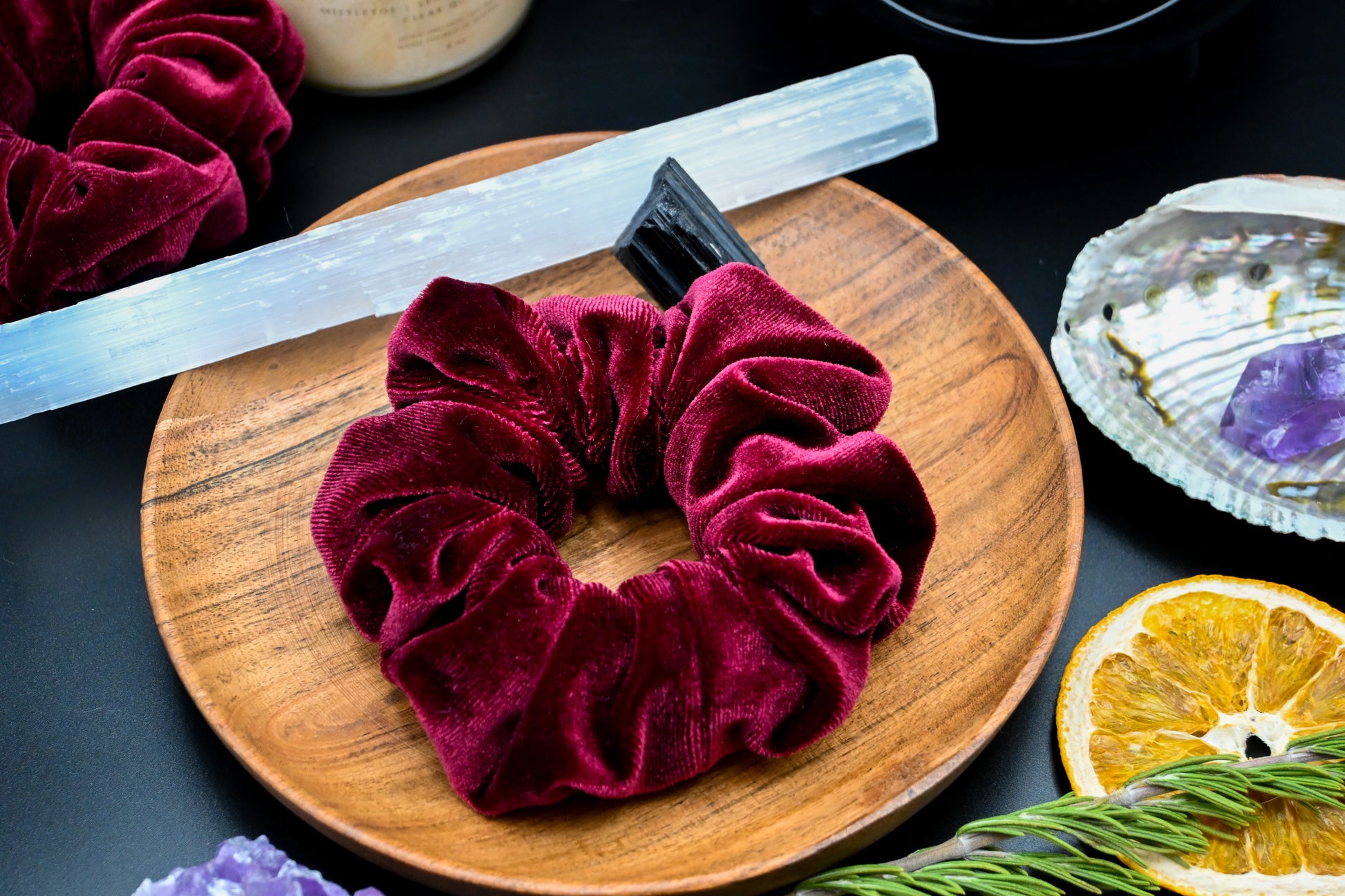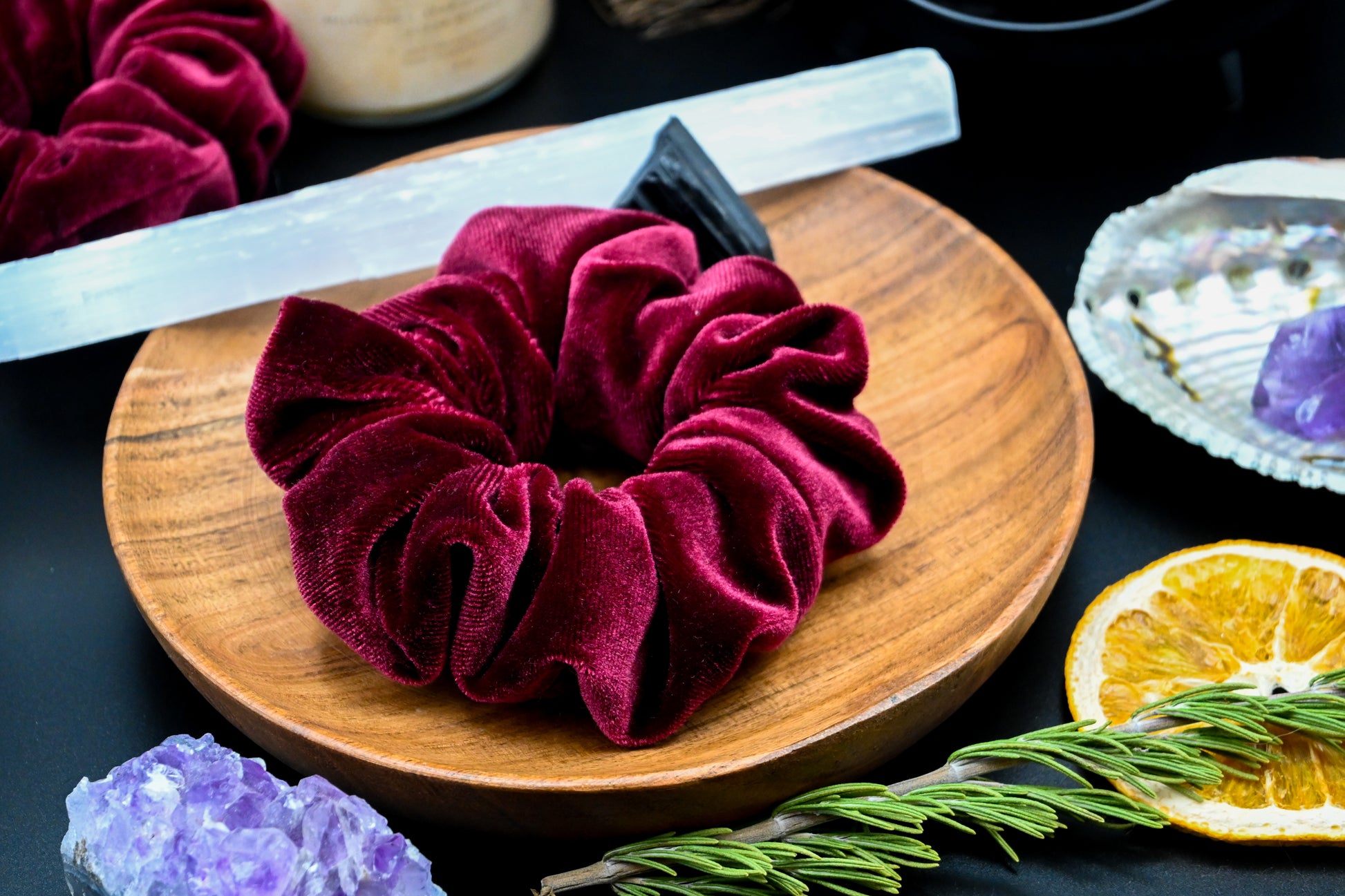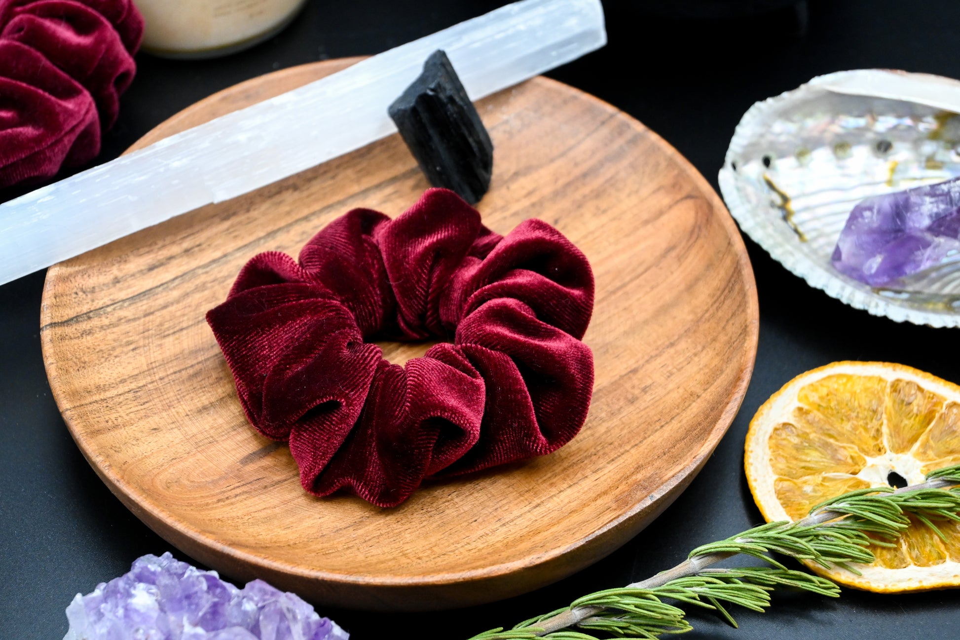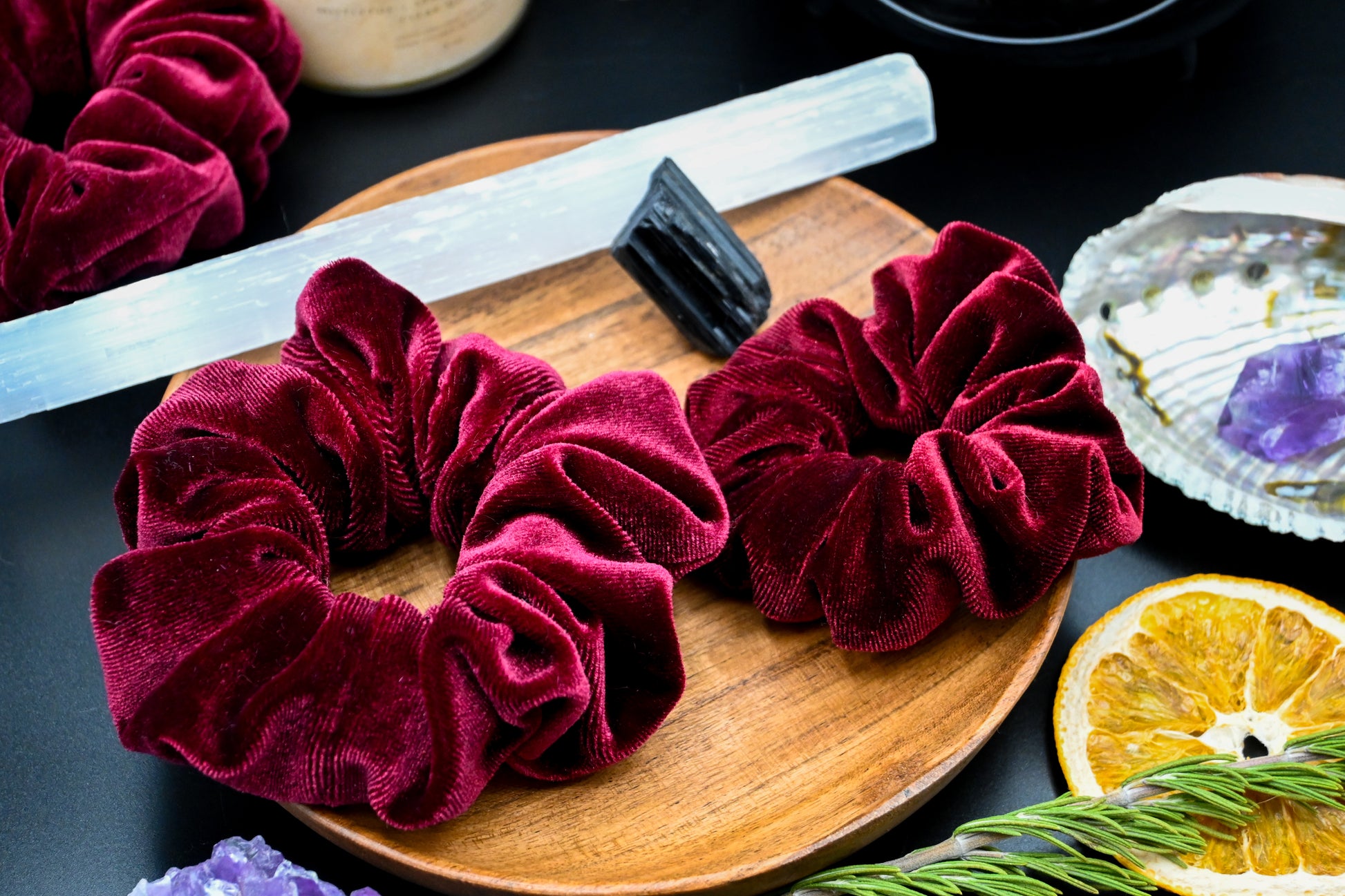A gorgeous deep garnet soft velvet scrunchie is the be-all end-all answer to your hopes, dreams and wishes. We are here to help fulfil everything you've ever wanted in a scrunchie with this beautiful and elegant color. Beautiful like your favorite wine, your favorite gemstone, or just simply your favorite color. Use your new favorite scrunchie to hold your luscious locks in place, or to accessories and wear it on your wrist.