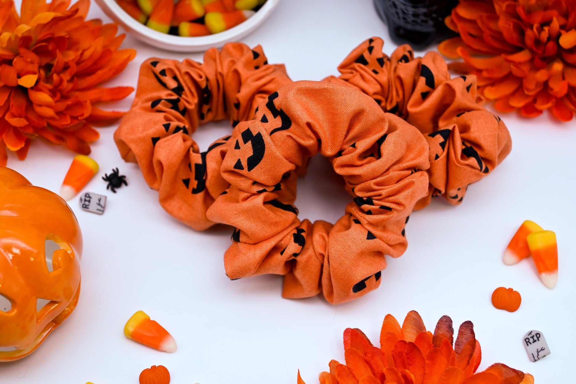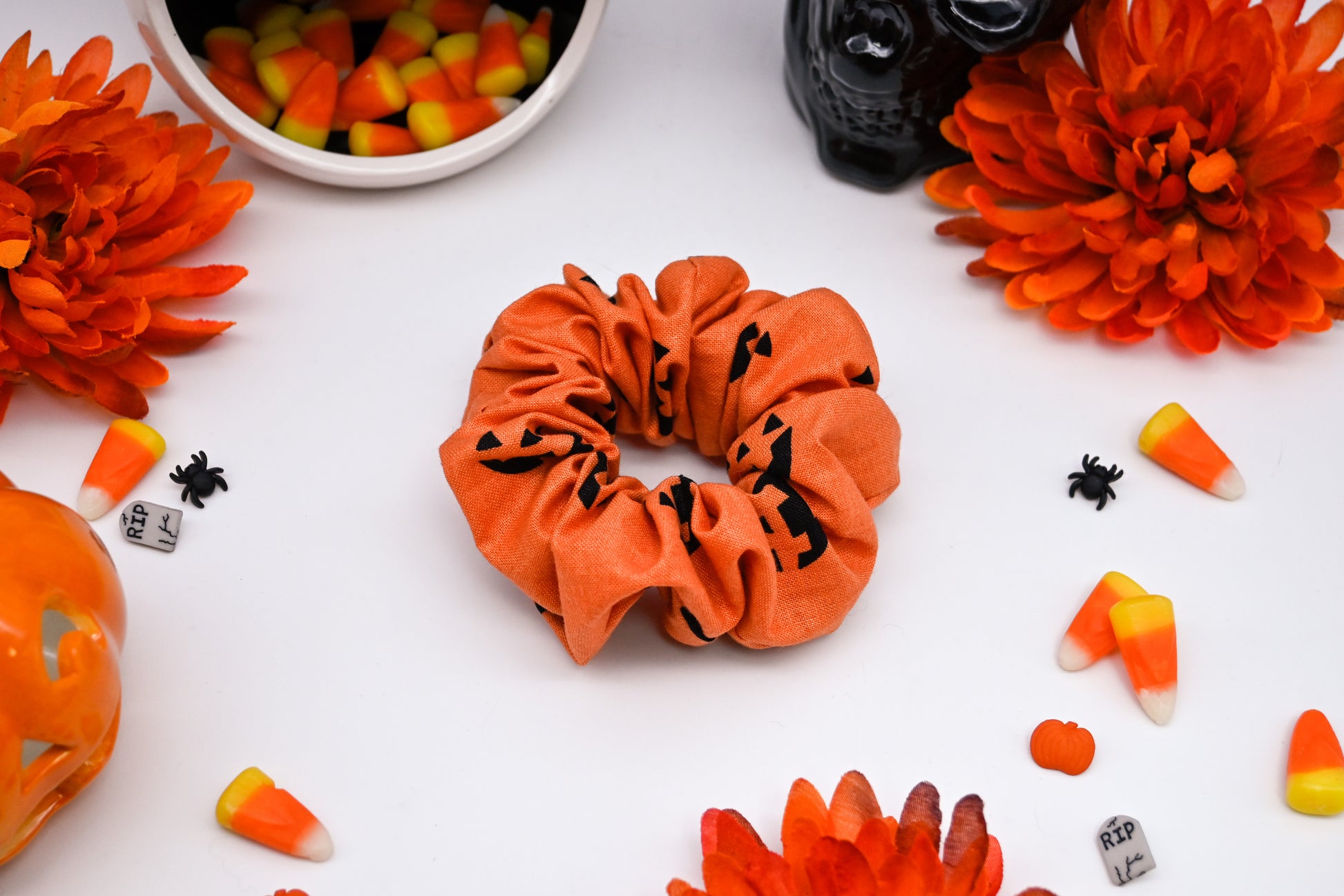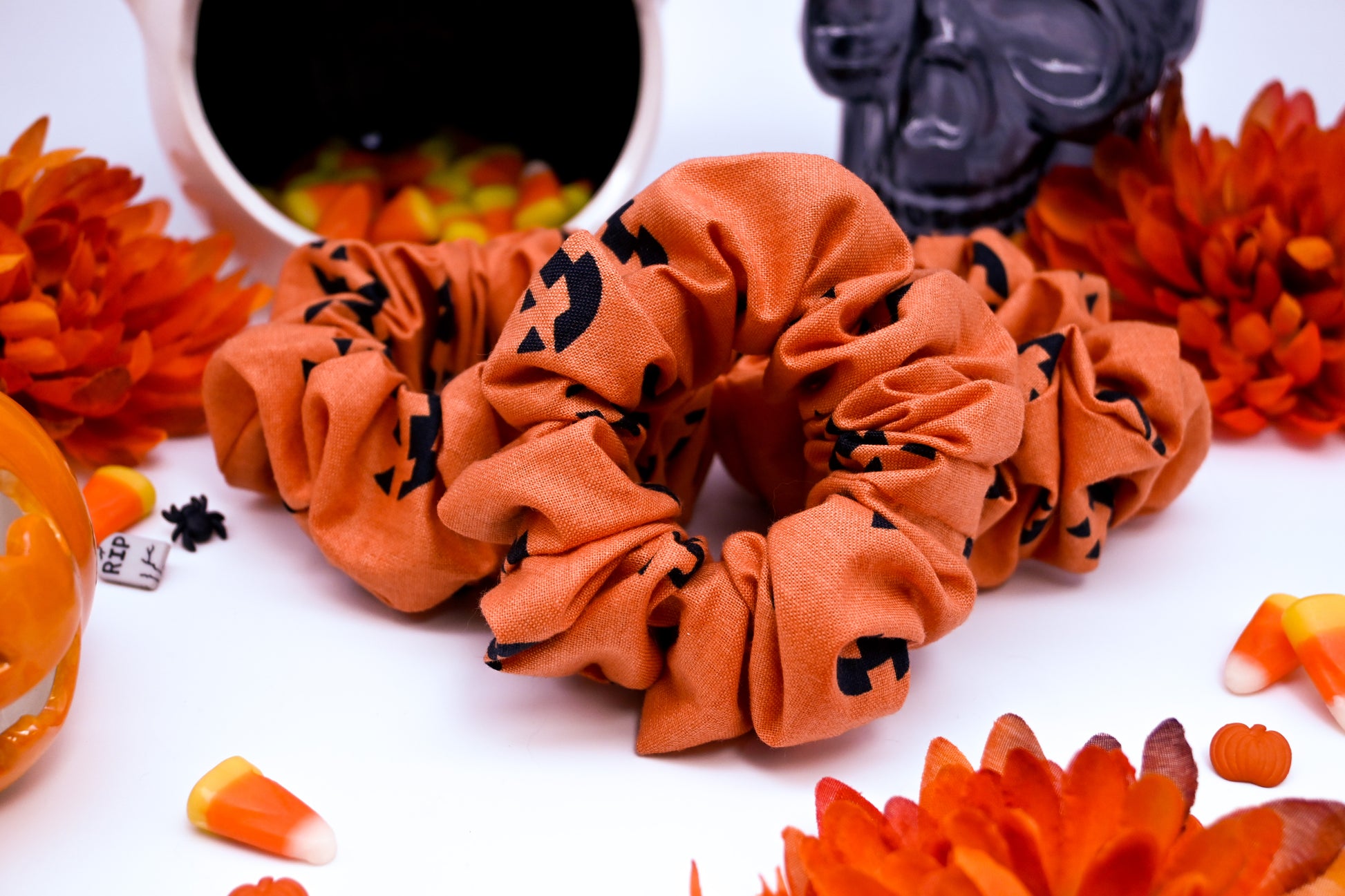 Its finally that time of year! Pumpkins are being put out in stores, you smell the crisp autumn air, leaves are falling, pumpkin spice is filling shelves, and you know very soon it will be time to carve jack-o-lanterns. Its your turn to join in on the fun! This scrunchie is always ready for a carving party, and always happy to lend a helping hand--or elastic, to tie your hair out of your face while getting goopy in seeds and pumpkin guts. This scrunchie is made with harvest orange fabric with happy little jack-o-lantern faces sprinkled throughout.