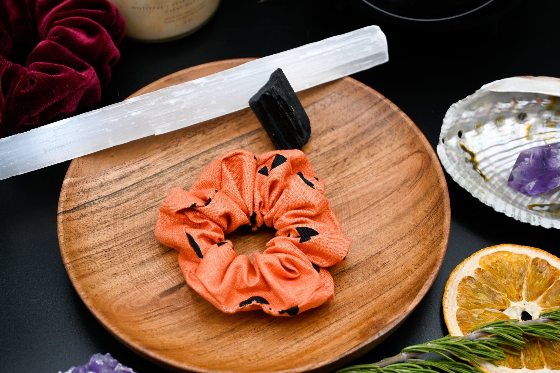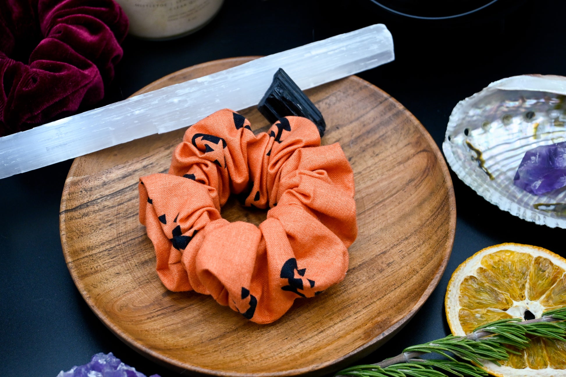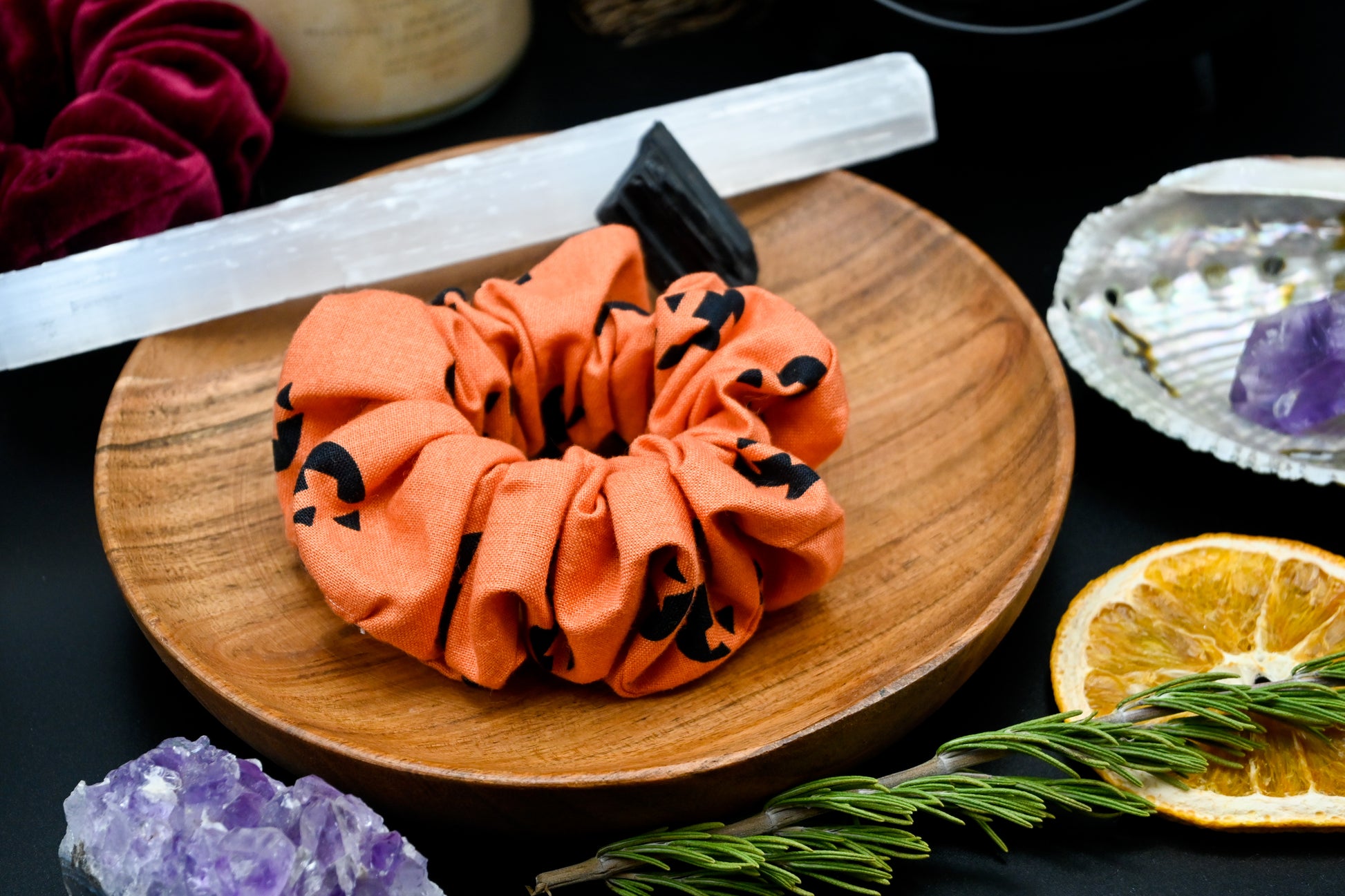 Its finally that time of year! Pumpkins are being put out in stores, you smell the crisp autumn air, leaves are falling, pumpkin spice is filling shelves, and you know very soon it will be time to carve jack-o-lanterns. Its your turn to join in on the fun! This scrunchie is always ready for a carving party, and always happy to lend a helping hand--or elastic, to tie your hair out of your face while getting goopy in seeds and pumpkin guts. This scrunchie is made with harvest orange fabric with happy little jack-o-lantern faces sprinkled throughout.