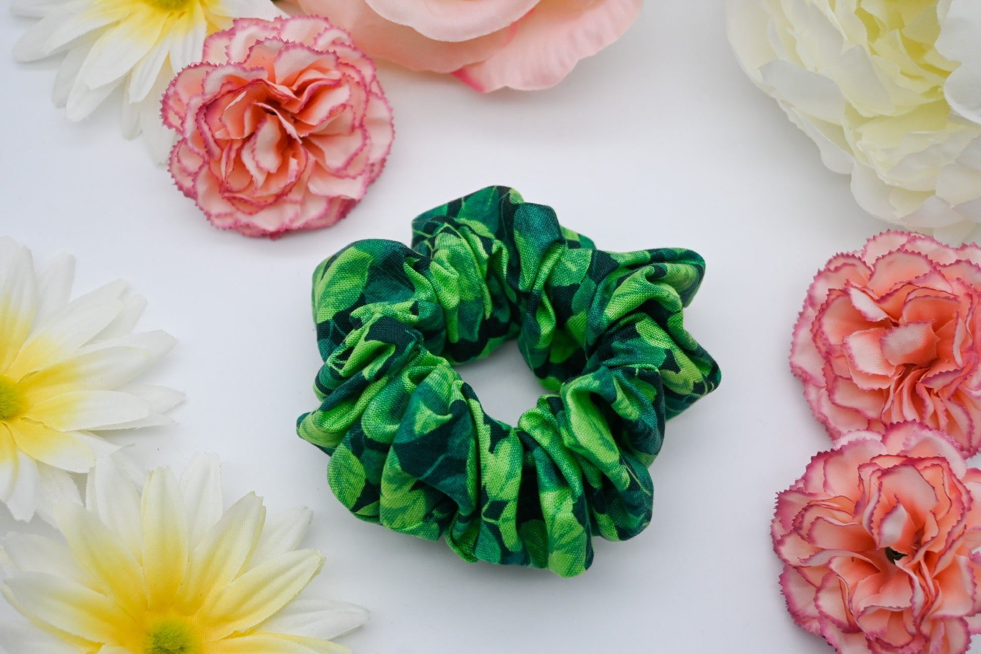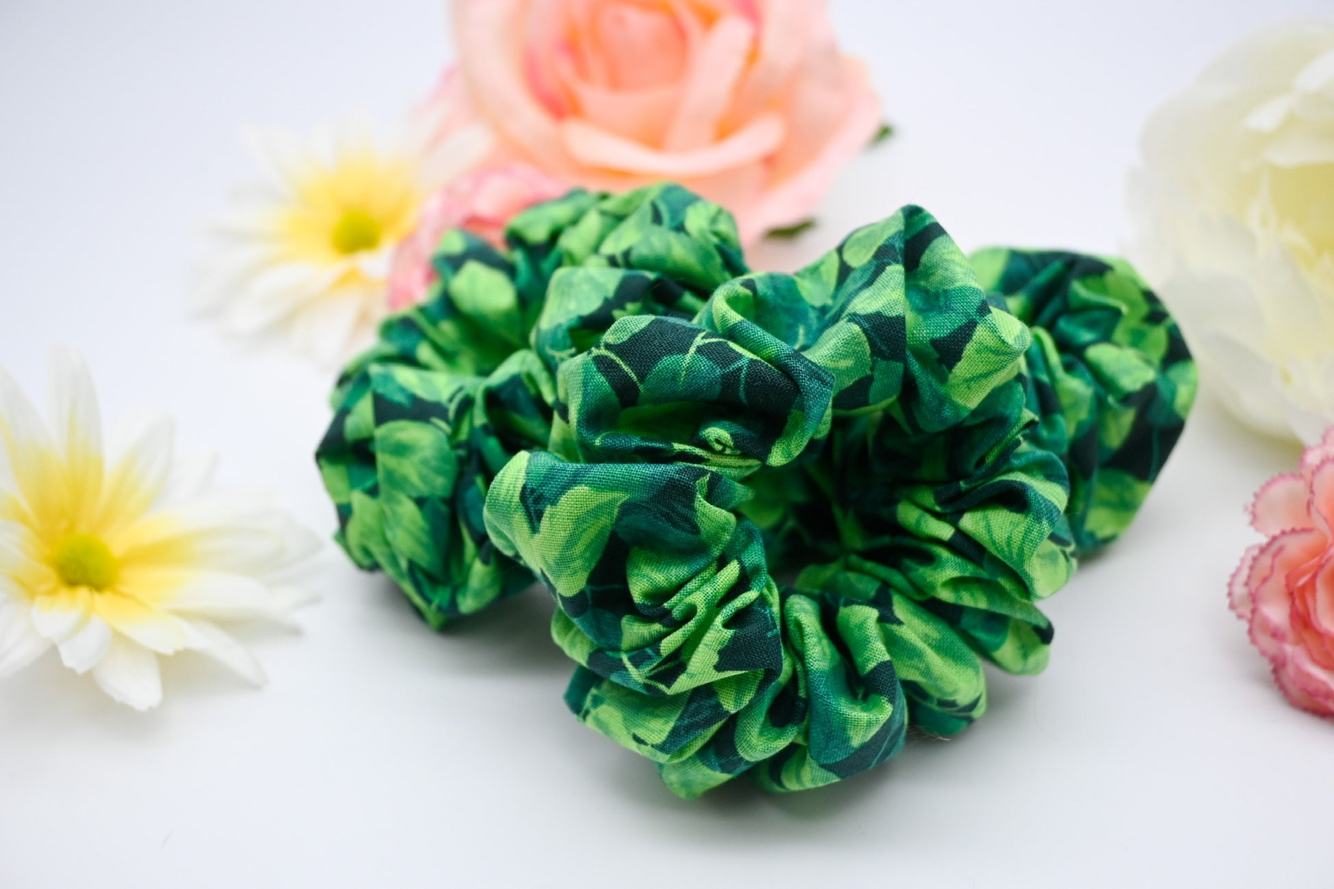 Are you looking for the perfect gift for that hard to shop for planty pal? Are you the hard to shop for planty pal? These adorable leafy foliage inspired scrunchies will leave you feeling like you're in the jungle, or in a thick garden. With a classy collage of leaves and foliage in gorgeous shades of emerald, peacock, jade, forest and kelly green, this leaf scrunchie is perfect for any plant lover. Add this to your collection before our inventory shrivels away like most plants do in the winter