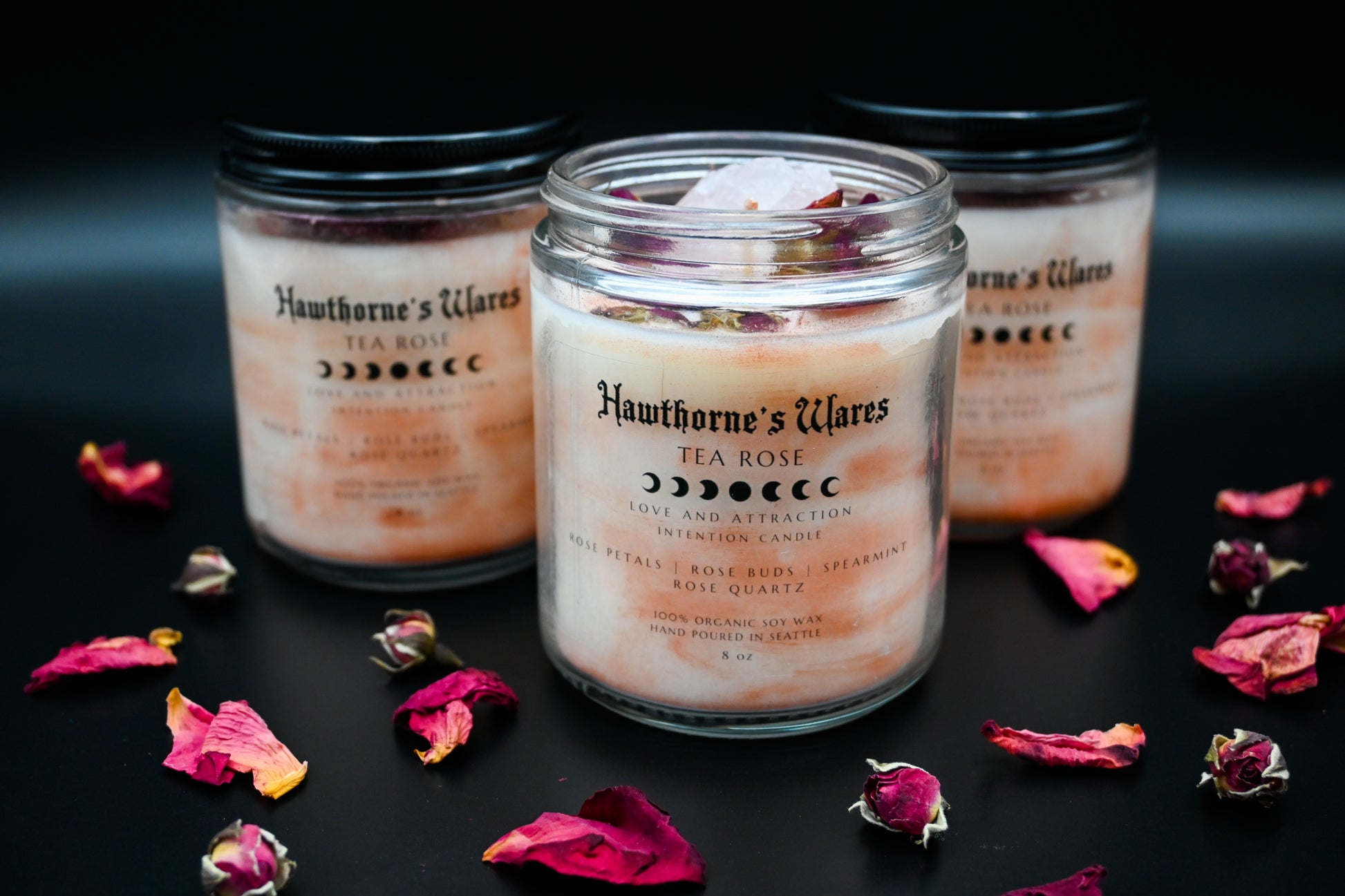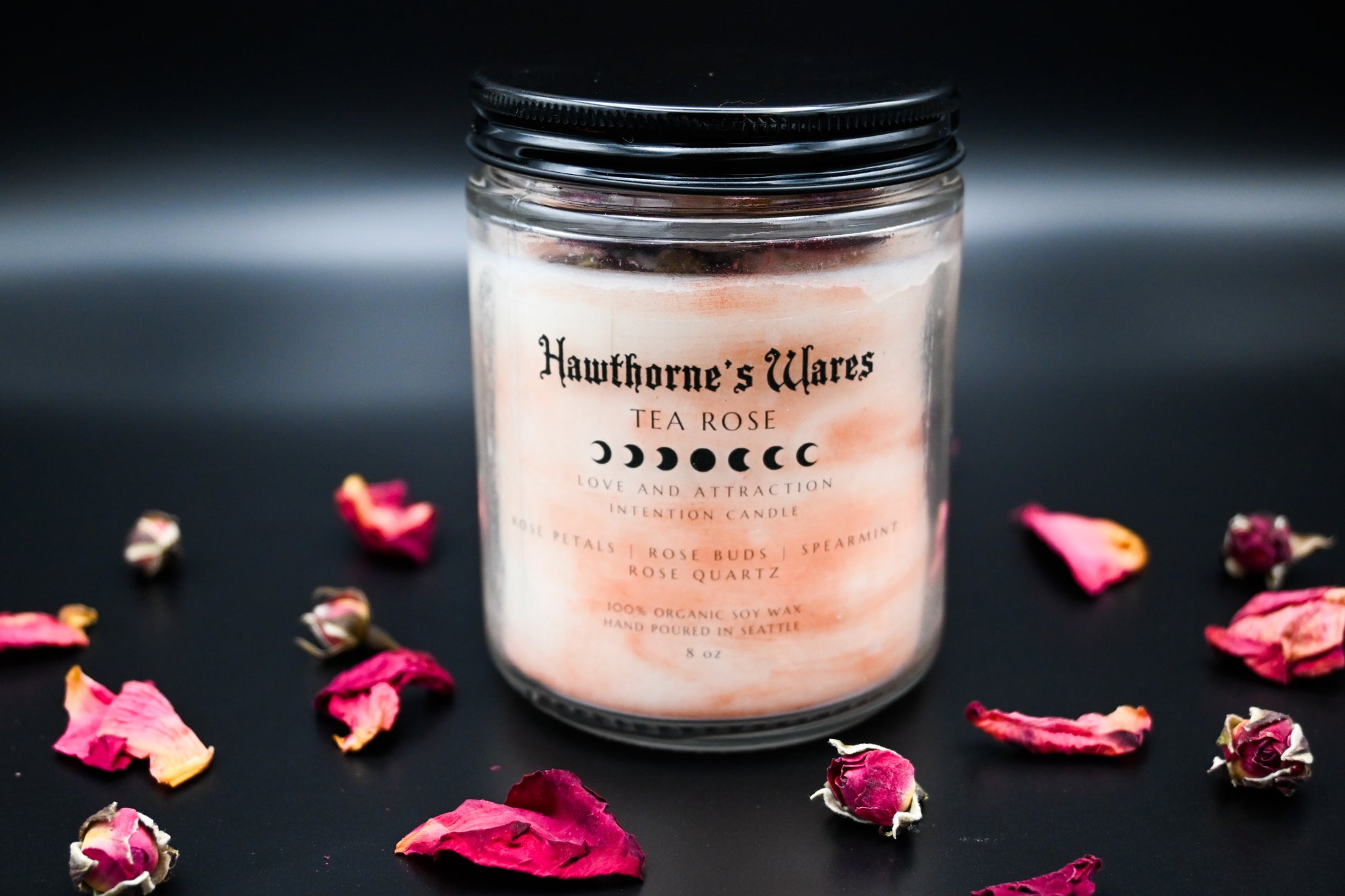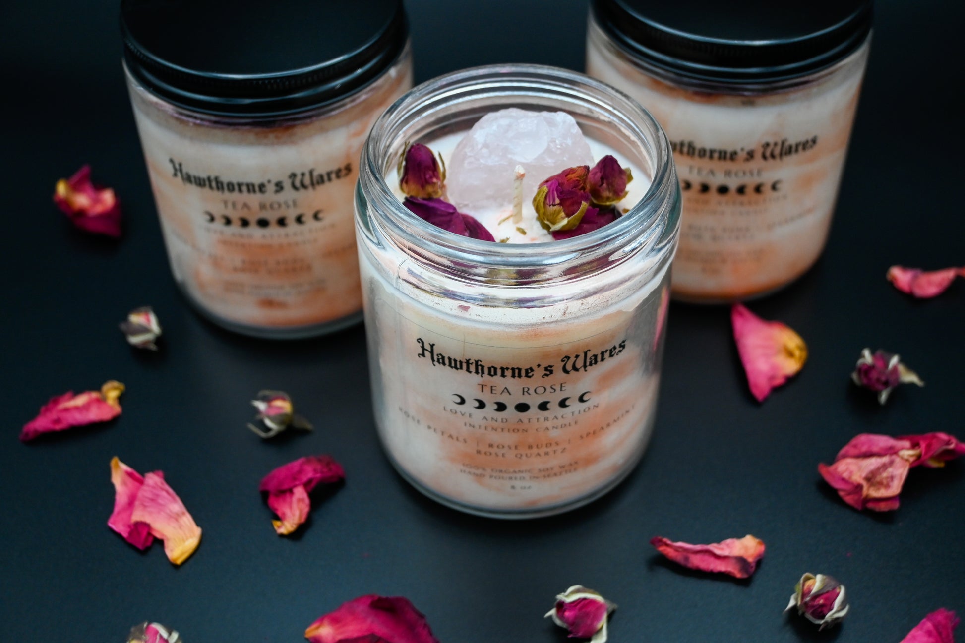 Fall in love with our beautiful tea rose candle and attract many blessings into your life. The beautiful tea rose scent we have is delicate enough to not be overpowering and chemical-smelling like some rose scents can be, but also not too light to be lost when your candle is lit. Imagine attracting all you need in life and all the love you seek, becomes yours. You attract all positive things you desire in your life. Closing your eyes, inhaling the light floral scent this candle provides, you can feel your stress melt while you focus your energy on things you wish to attract most in your life. Sprinkled with rose petals, and spearmint, with strategically placed whole dried rose buds to promote love and attraction, we have also included a gorgeous raw Rose quartz in each candle for you to keep.