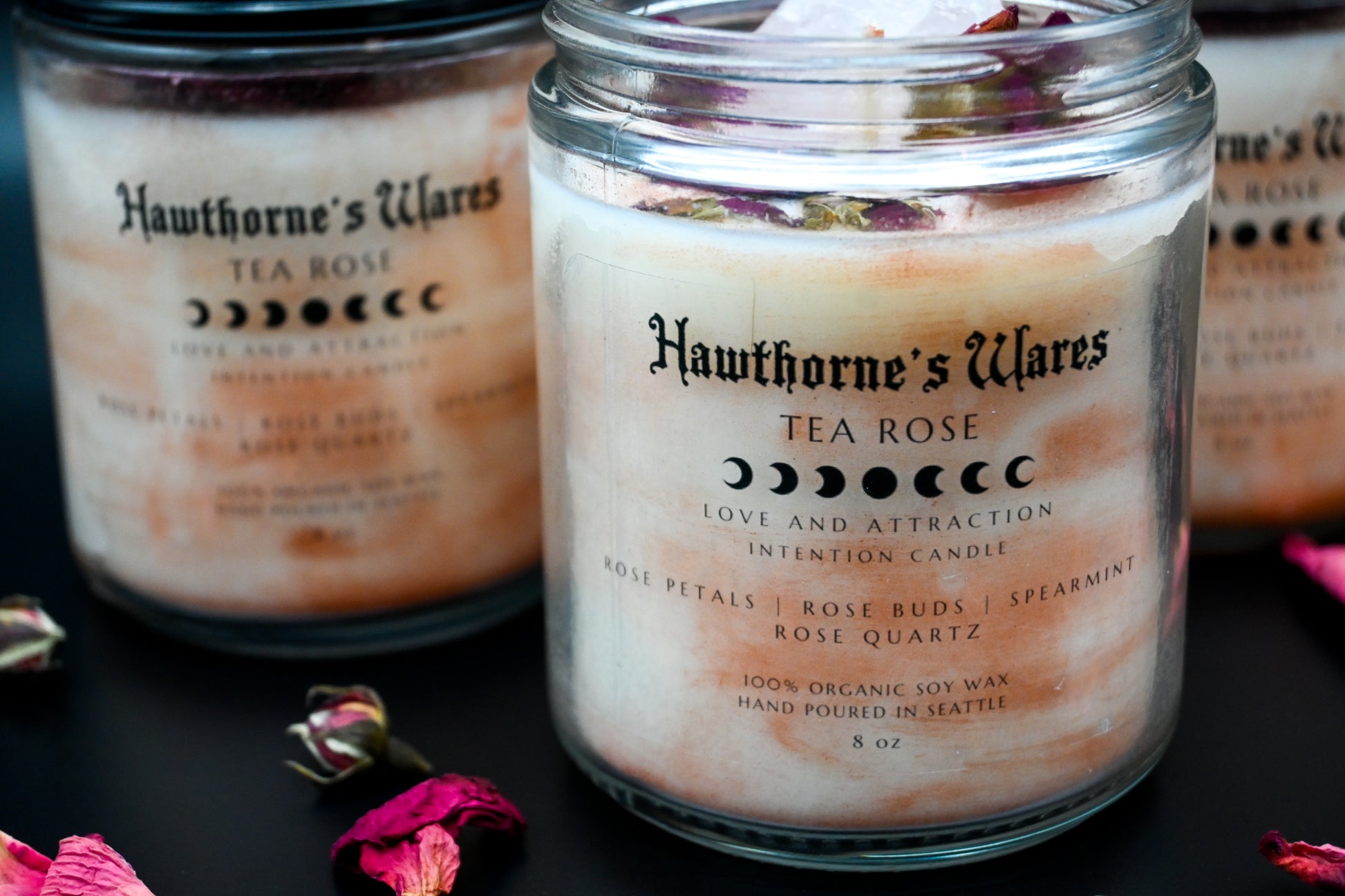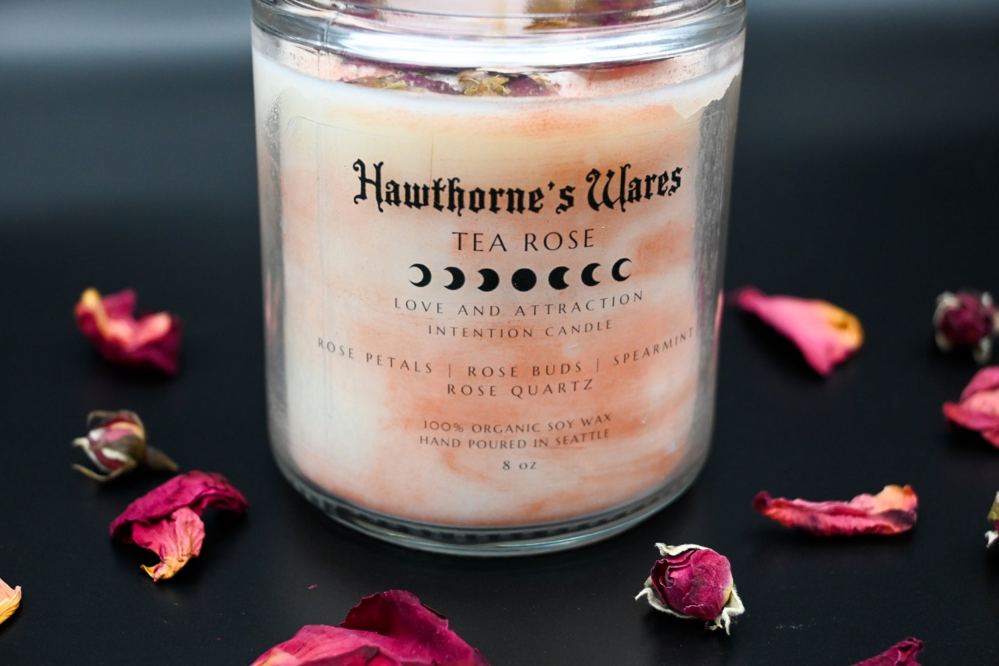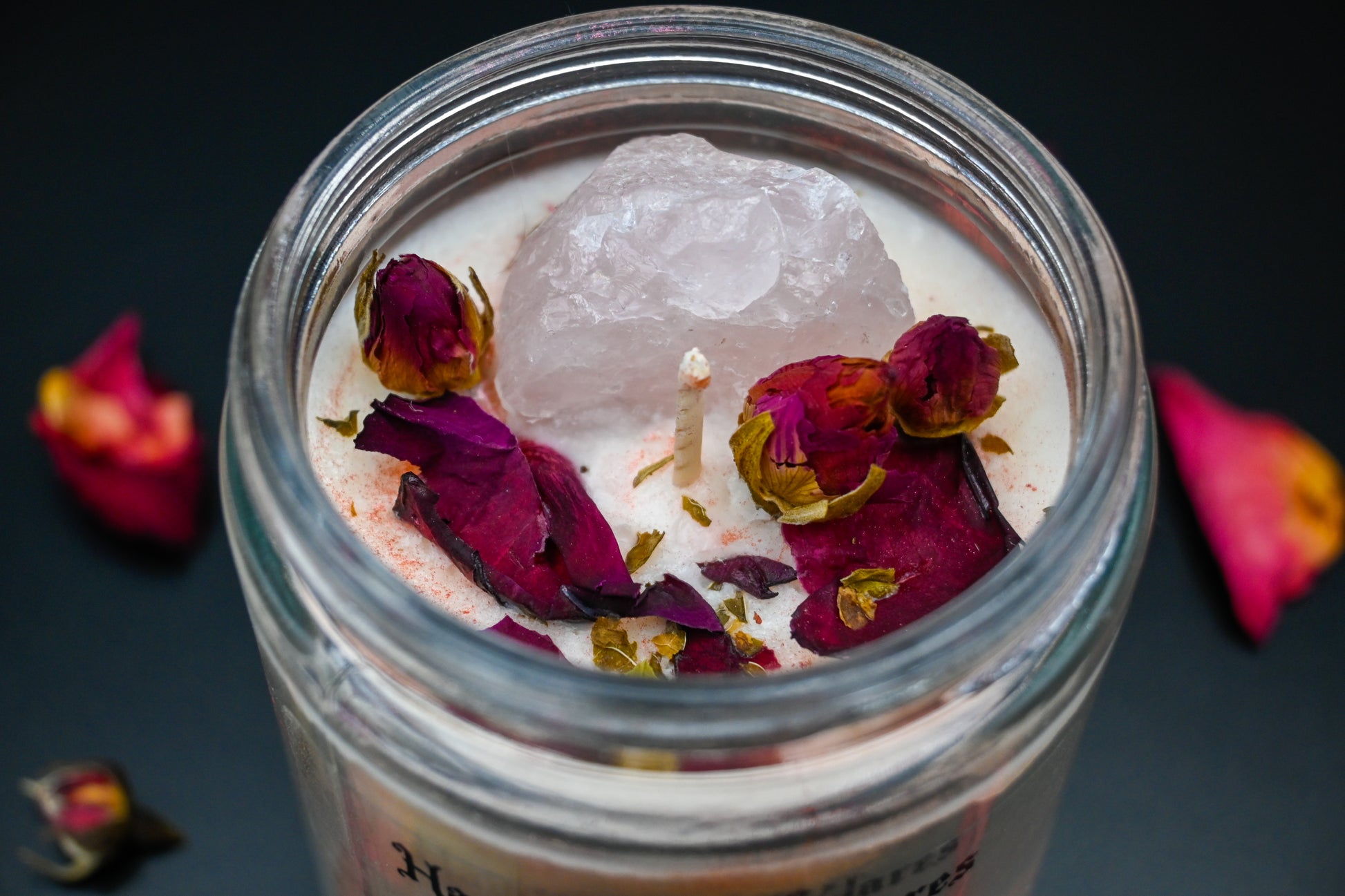 Fall in love with our beautiful tea rose candle and attract many blessings into your life. The beautiful tea rose scent we have is delicate enough to not be overpowering and chemical-smelling like some rose scents can be, but also not too light to be lost when your candle is lit. Imagine attracting all you need in life and all the love you seek, becomes yours. You attract all positive things you desire in your life. Closing your eyes, inhaling the light floral scent this candle provides, you can feel your stress melt while you focus your energy on things you wish to attract most in your life. Sprinkled with rose petals, and spearmint, with strategically placed whole dried rose buds to promote love and attraction, we have also included a gorgeous raw Rose quartz in each candle for you to keep.