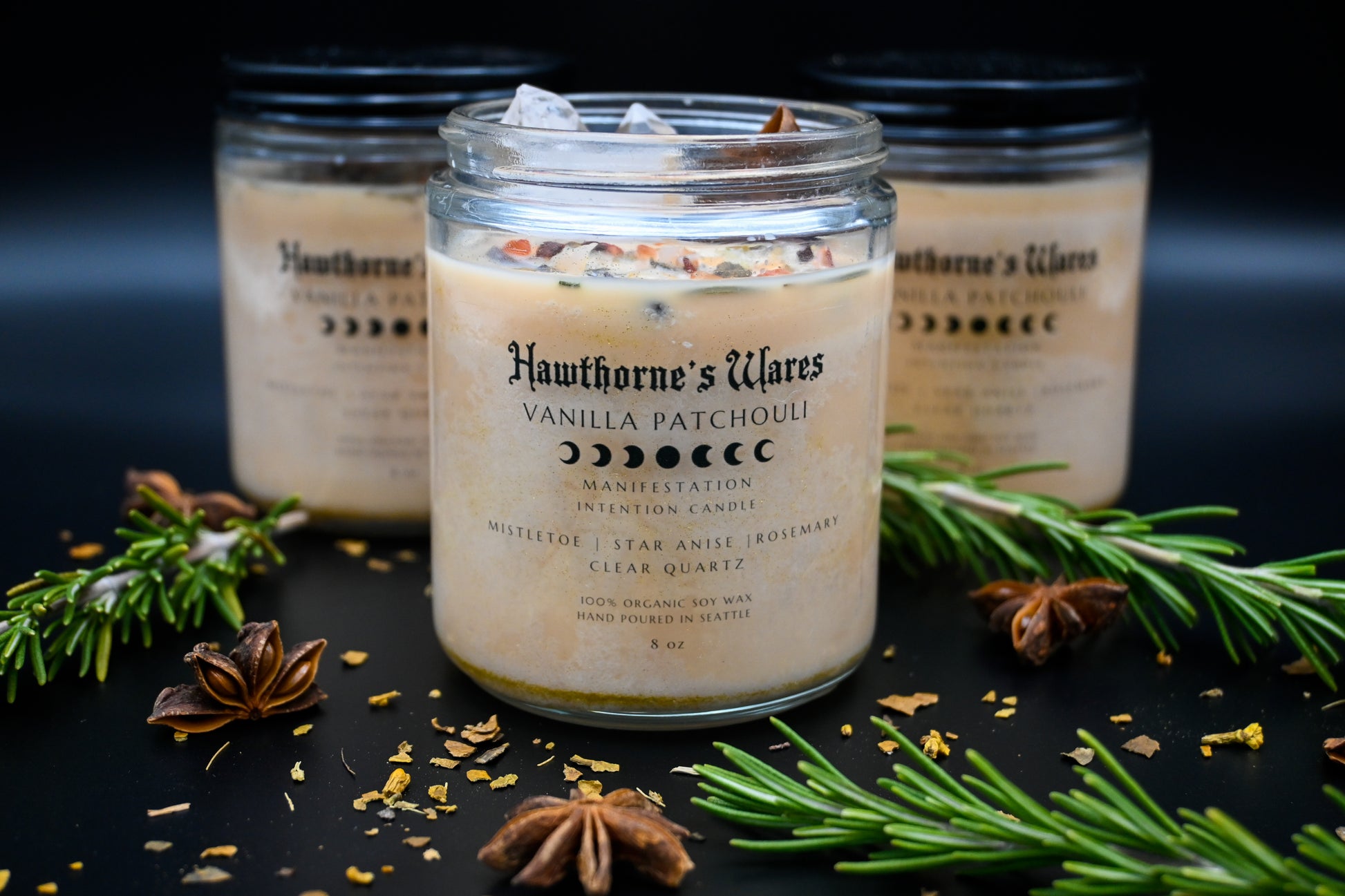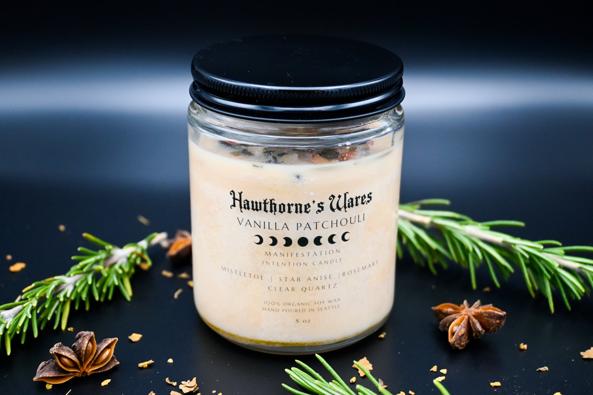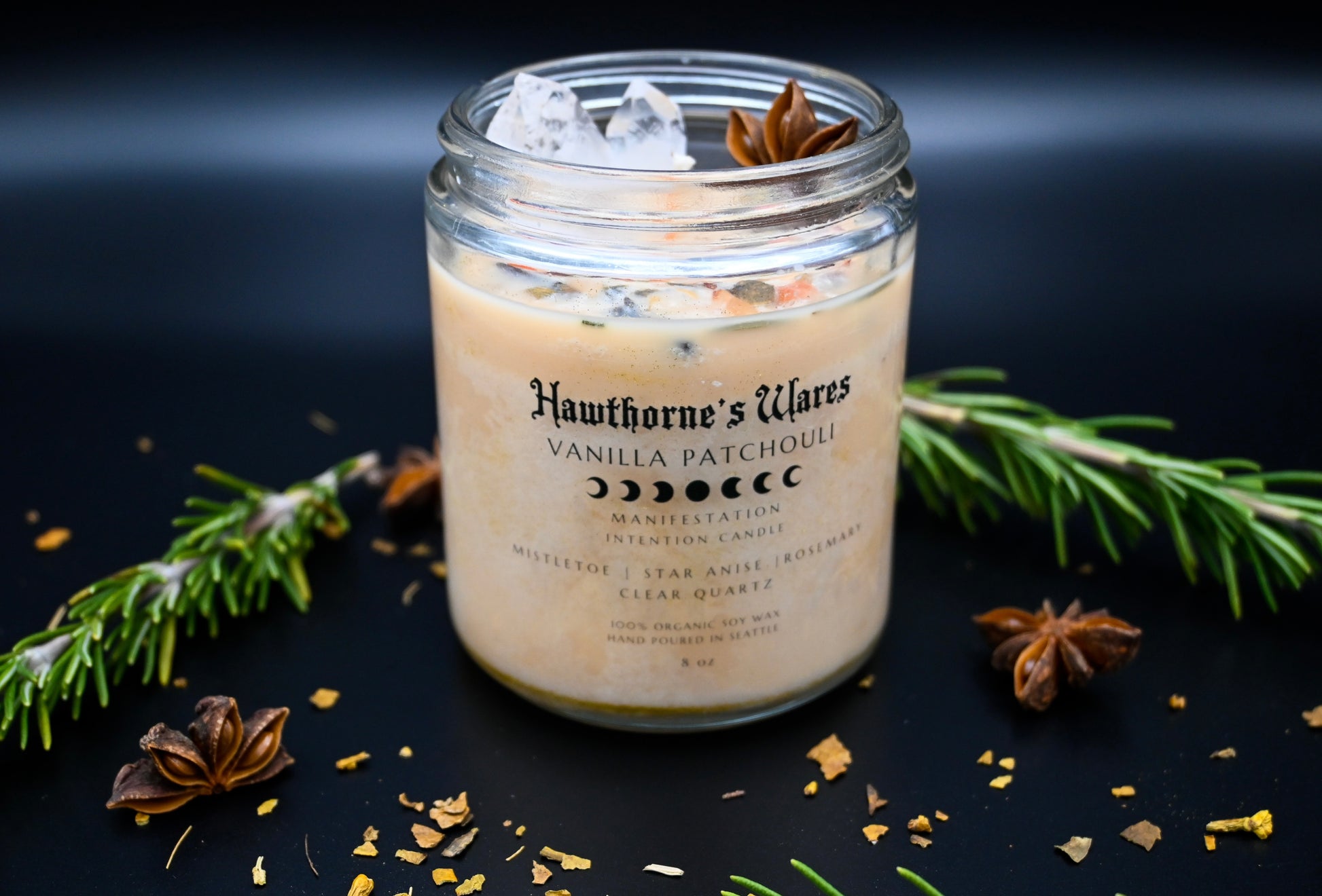 Ready yourself, set your intentions, and manifest your dreams with our beautiful manifestation candle. Make all of your candle hopes and dreams a reality with our delicious vanilla patchouli scent! These two scents blended together almost give a cherry vanilla cola smell, with the warm vanilla and cozy and snappy patchouli you’ll have no problem drifting and meditating—visualizing your dreams and goals. You can make anything in your life a reality that you dream of. Sprinkled with Mistletoe, and rosemary, star anise is also strategically placed along side a beautiful cluster of Clear quartz and sprinkles of carnelian chips to help you manifest whatever you need in life.
