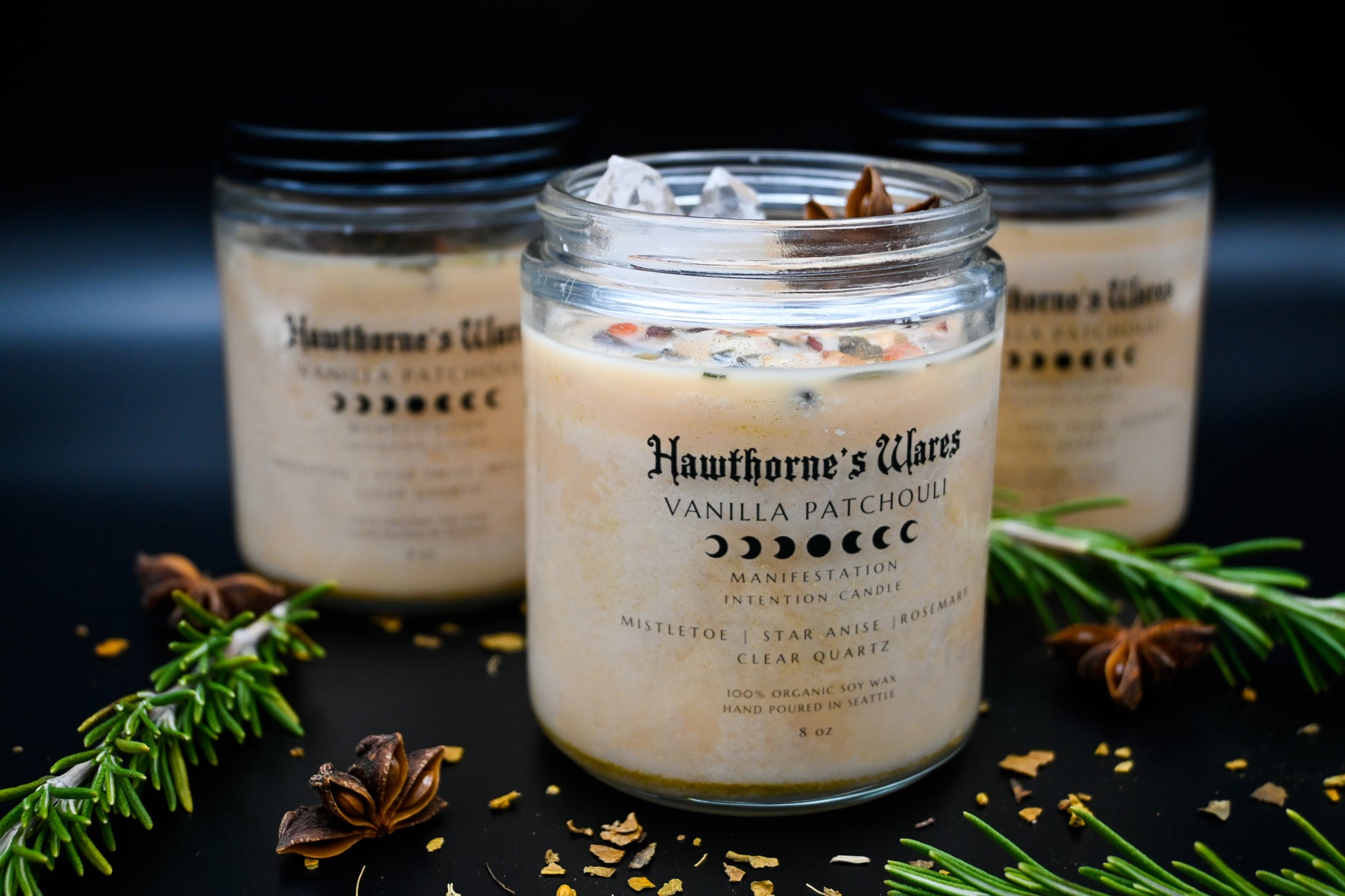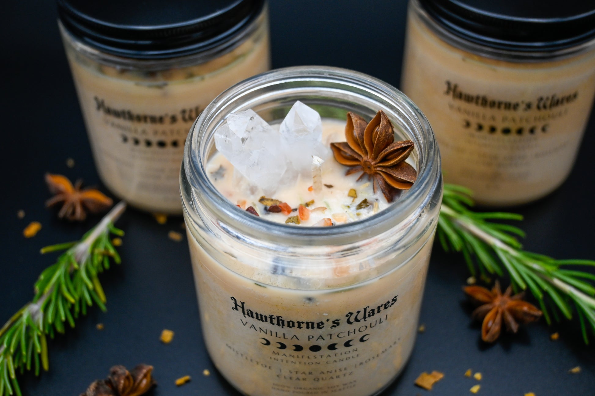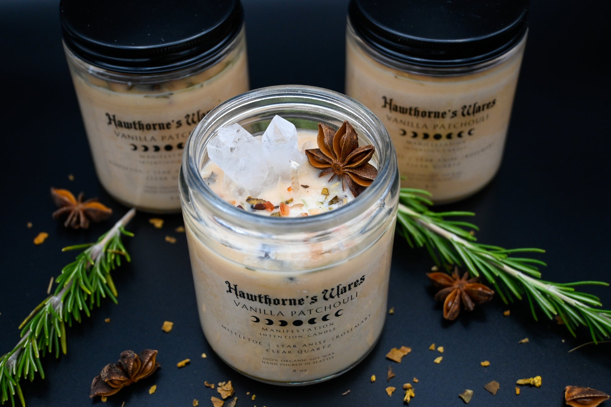Ready yourself, set your intentions, and manifest your dreams with our beautiful manifestation candle. Make all of your candle hopes and dreams a reality with our delicious vanilla patchouli scent! These two scents blended together almost give a cherry vanilla cola smell, with the warm vanilla and cozy and snappy patchouli you’ll have no problem drifting and meditating—visualizing your dreams and goals. You can make anything in your life a reality that you dream of. Sprinkled with Mistletoe, and rosemary, star anise is also strategically placed along side a beautiful cluster of Clear quartz and sprinkles of carnelian chips to help you manifest whatever you need in life.