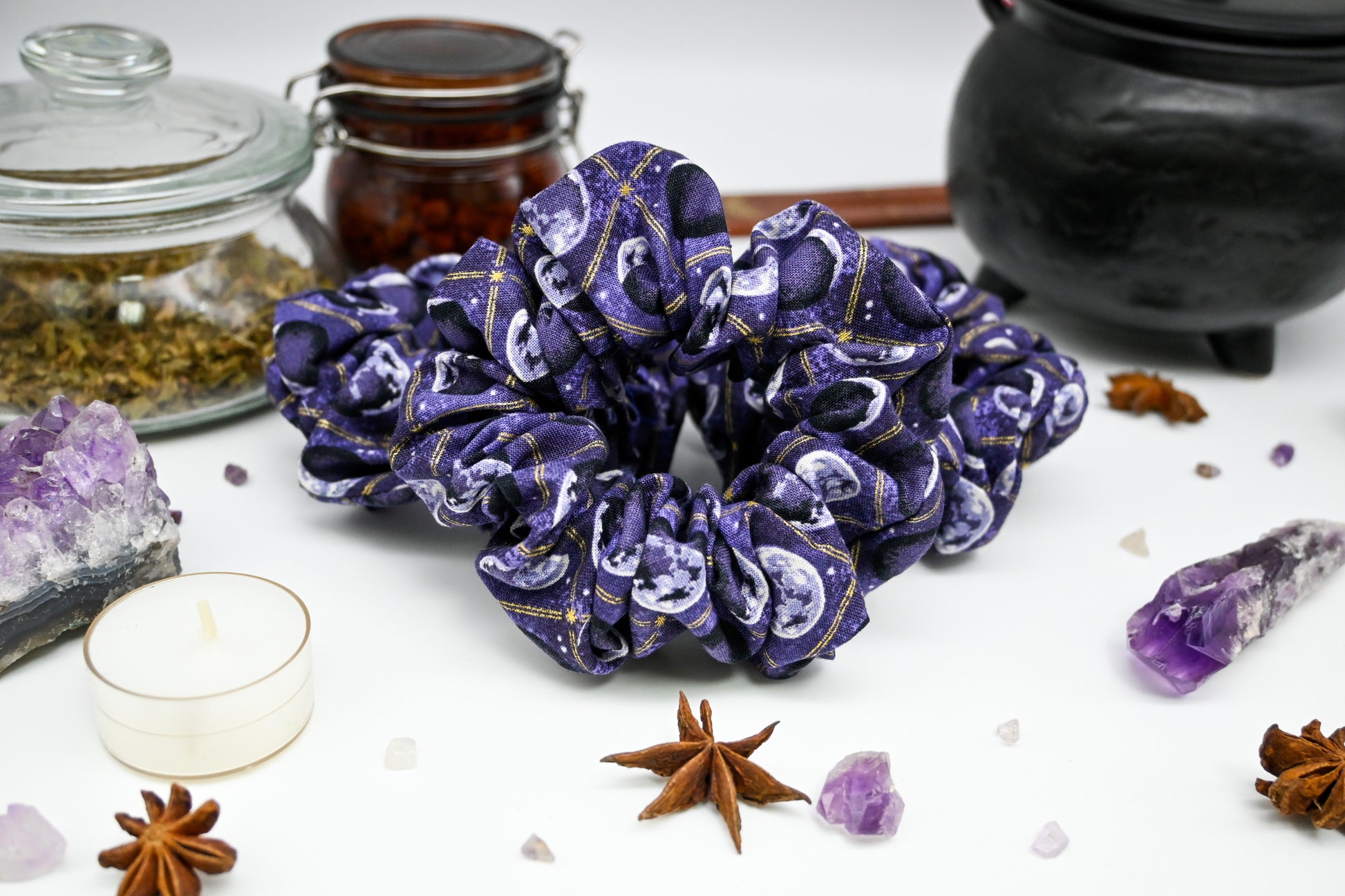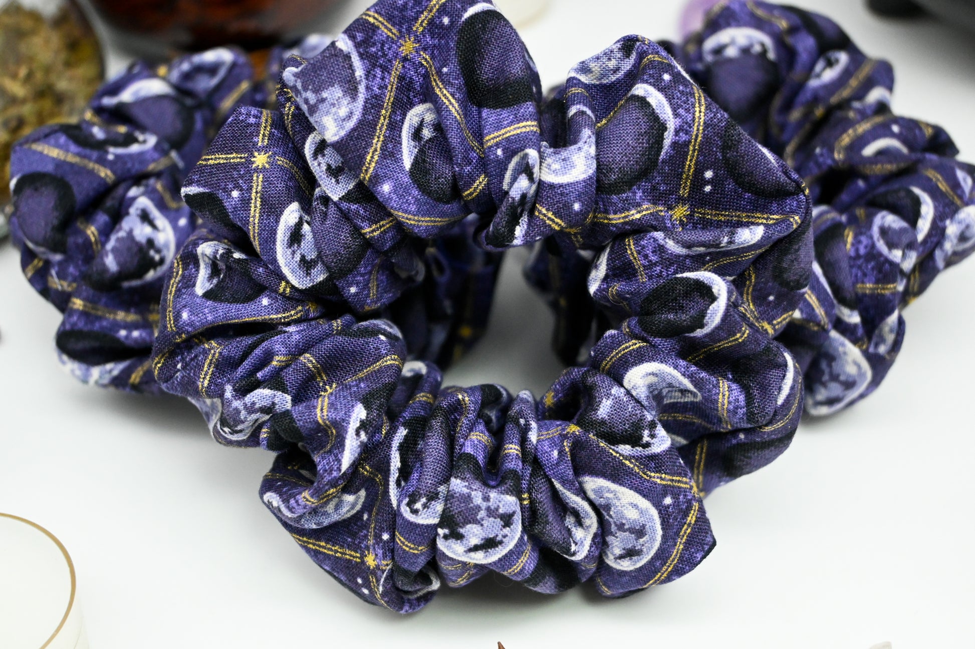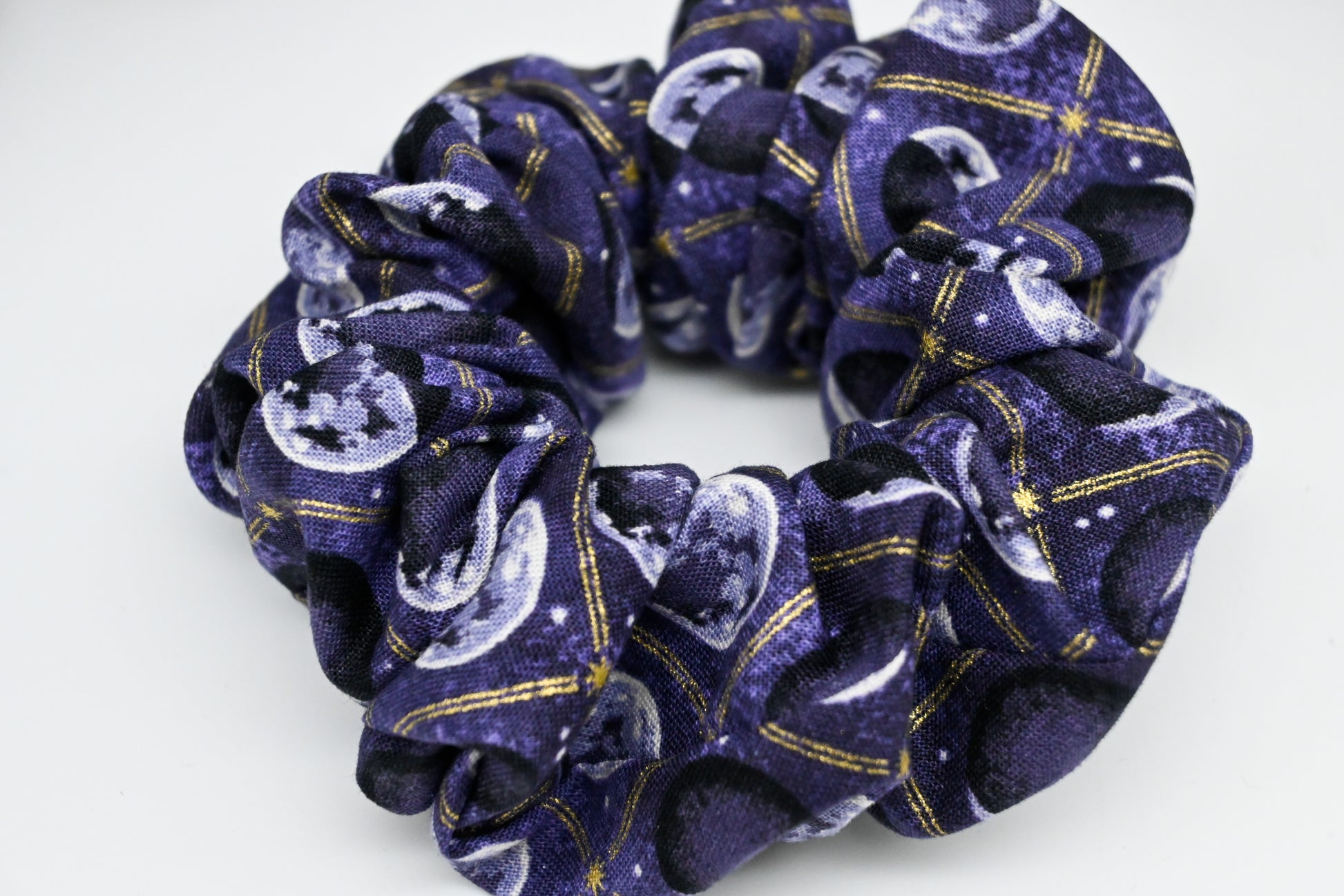 Feeling the weight of the world on your shoulders? Is there a full moon coming up? No worries, you are a fantastical, magical being and can conquer anything the universe throws at you. The moon tells us this is a true statement and we want nothing but your happiness. We hope this beautiful scrunchie with the phases of the moon in grey and cream, gold foil accents like stripes and stars, white stars, and a marbled light and dark purple background bring you copious amounts of happiness.