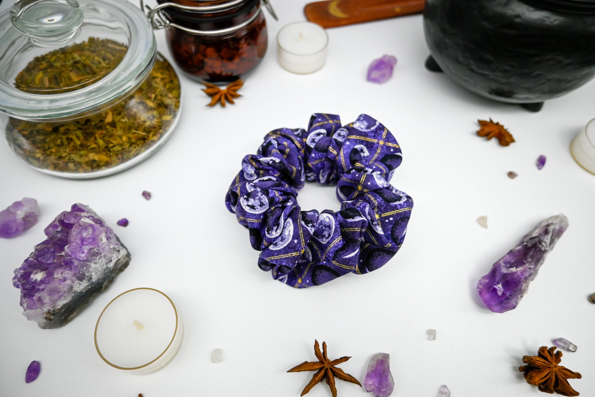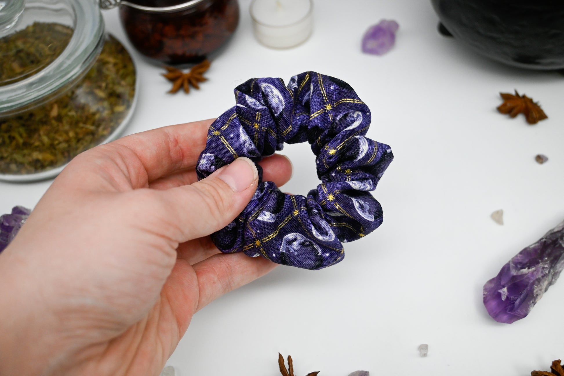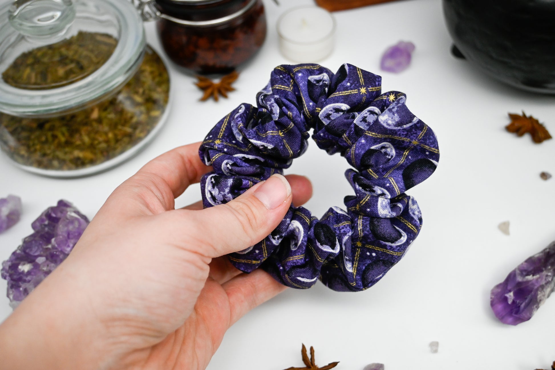 Feeling the weight of the world on your shoulders? Is there a full moon coming up? No worries, you are a fantastical, magical being and can conquer anything the universe throws at you. The moon tells us this is a true statement and we want nothing but your happiness. We hope this beautiful scrunchie with the phases of the moon in grey and cream, gold foil accents like stripes and stars, white stars, and a marbled light and dark purple background bring you copious amounts of happiness.