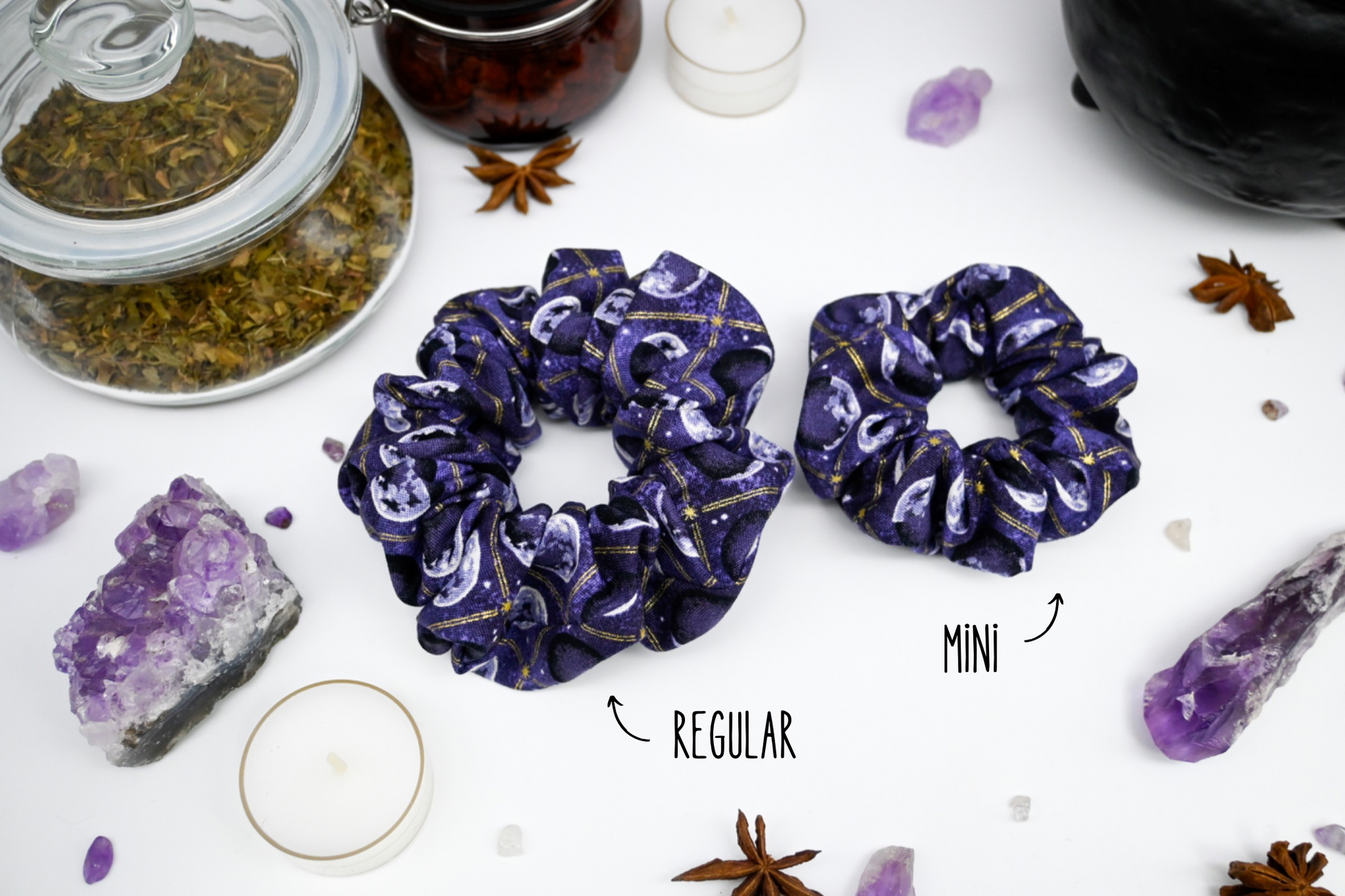 🌘 Mini Scrunchies are about 3 inches in diameter and feature 1/2” elastic, perfect for those with fine or short hair!