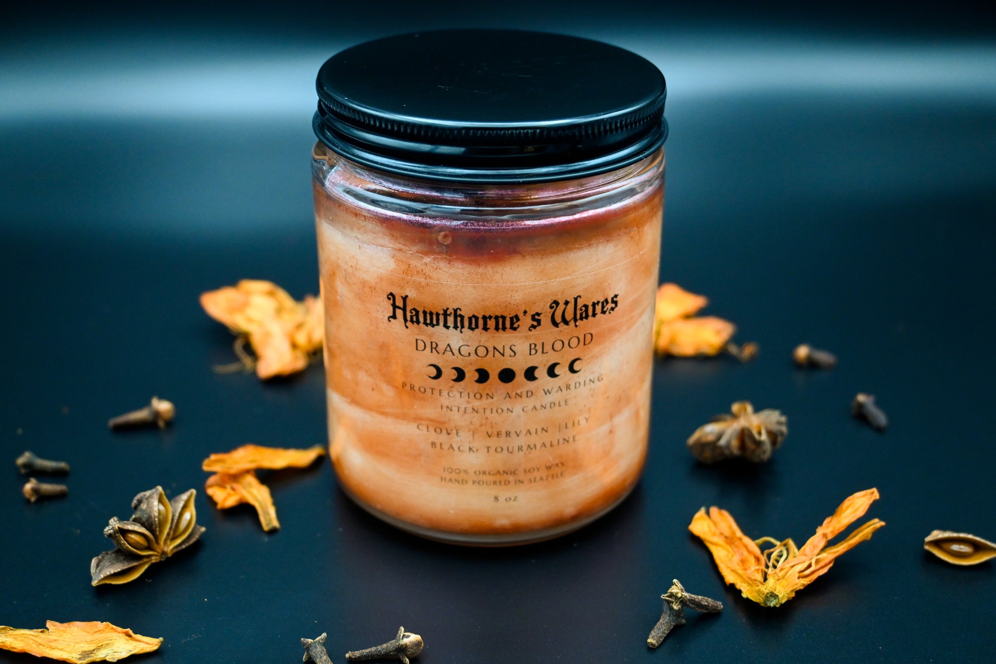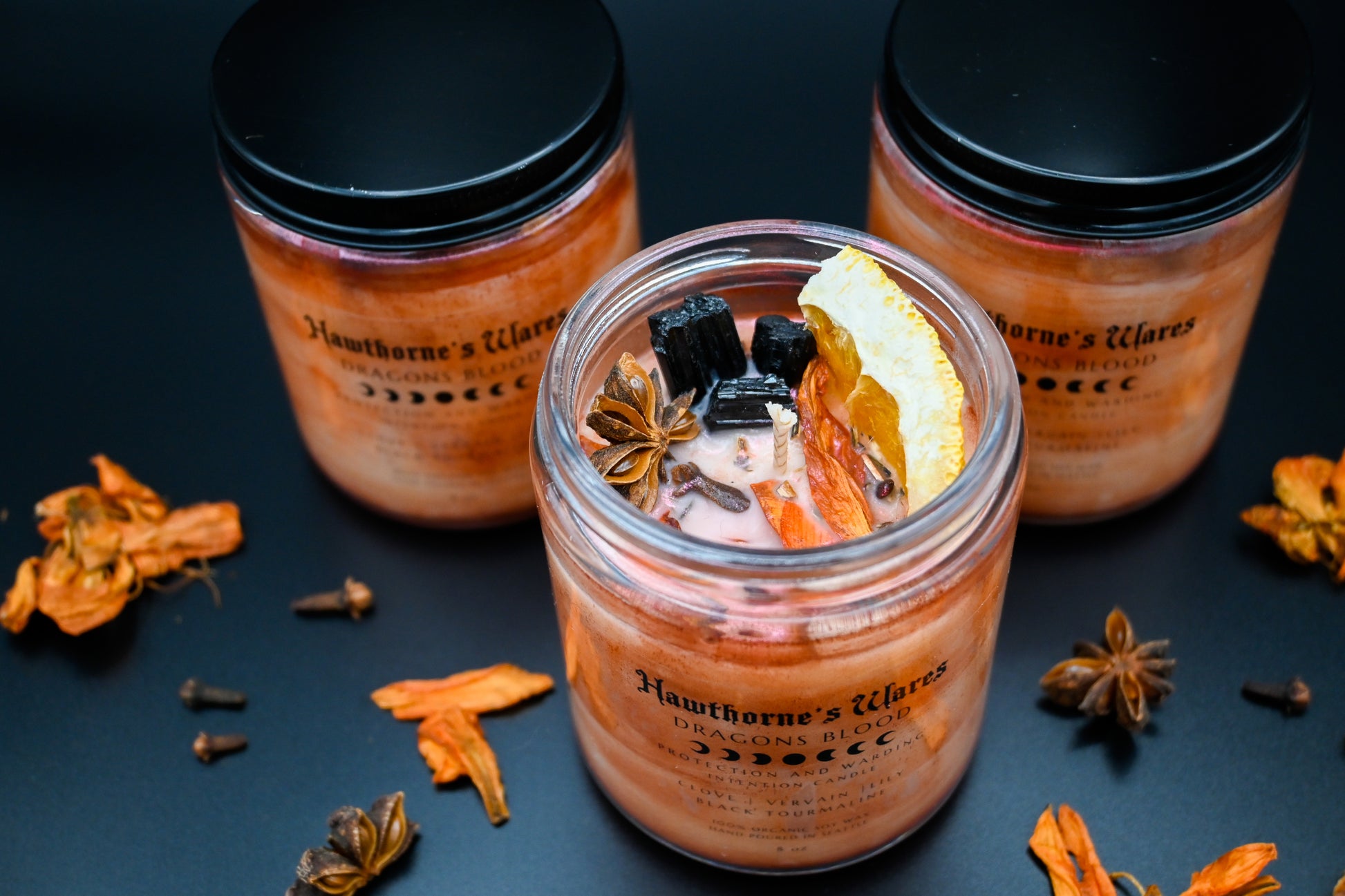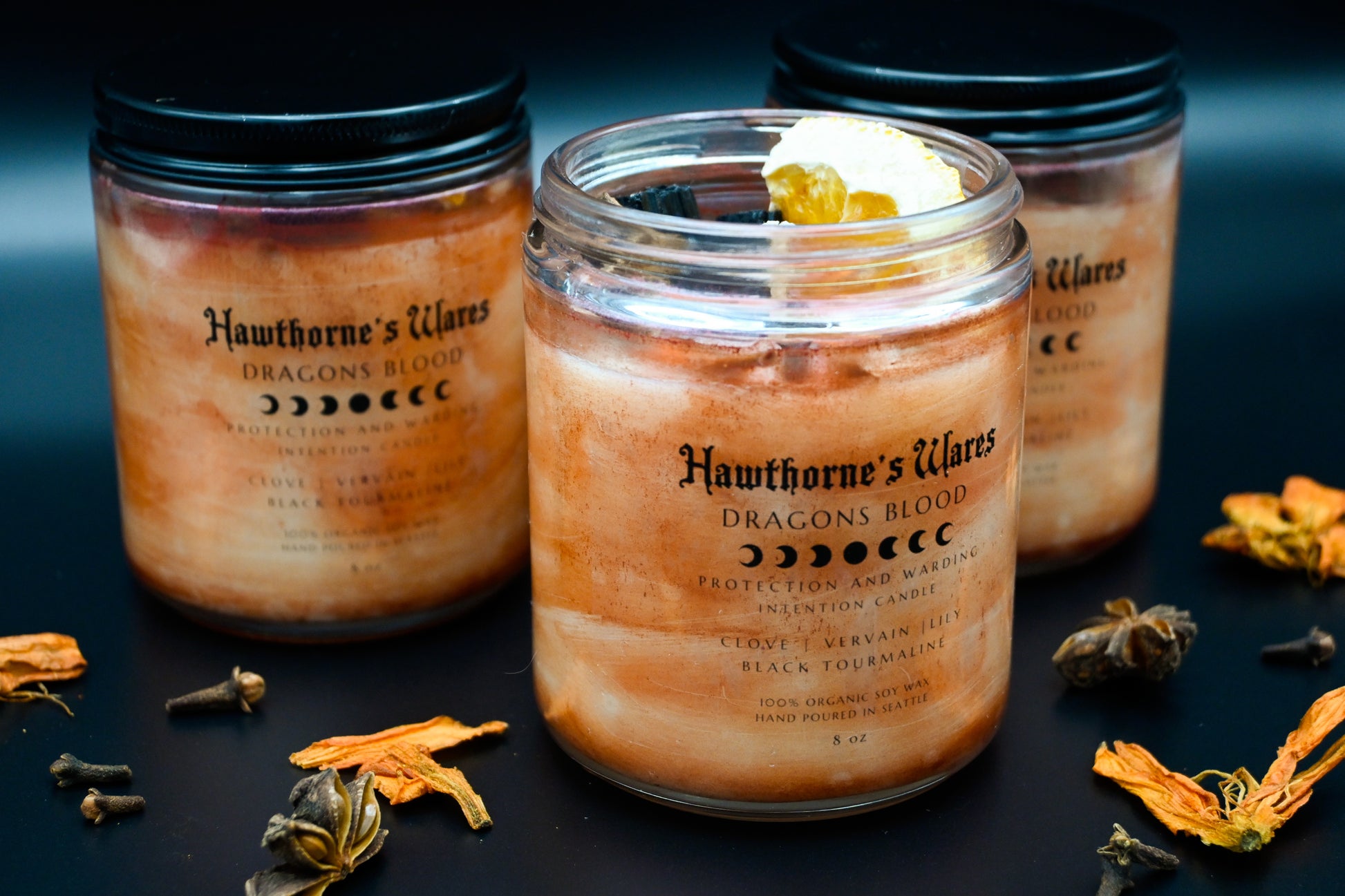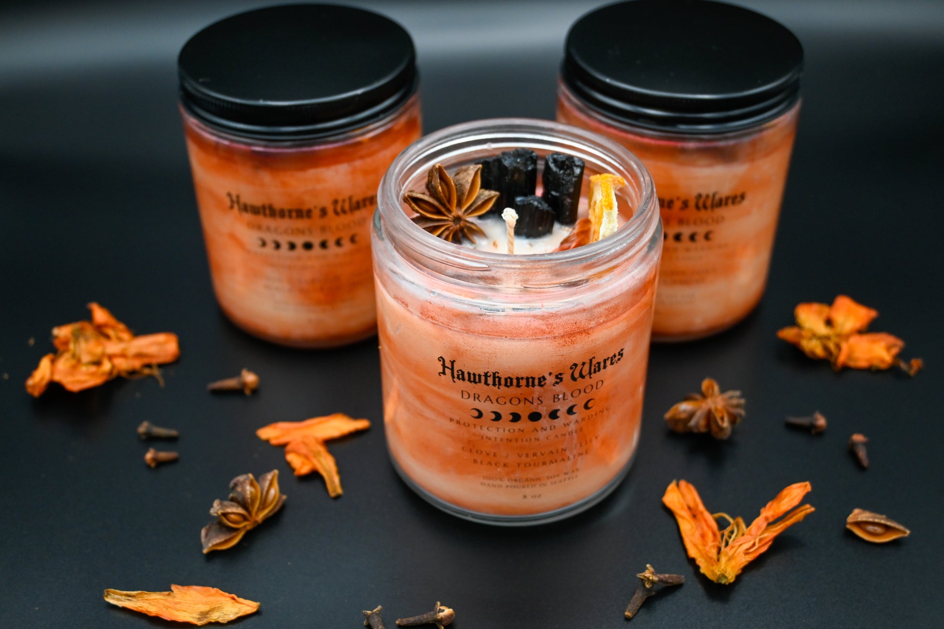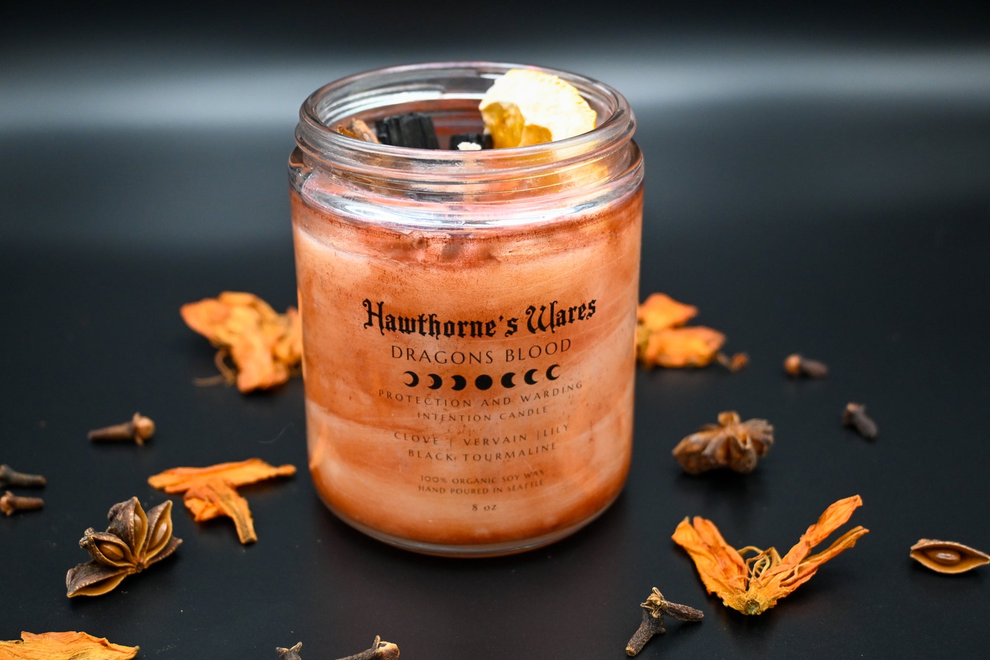 Feel the protection and power of the majestic dragon watching over you while lighting our beautifully crafted protection candle. Inhale deeply, feel secure, safe, and strong yet cozy and serene while enjoying the swirling smells of dragons blood, mixed with hints of clove. Sprinklings of vervain, alongside strategically placed whole cloves, lily petals, star anise, and a dehydrated lemon slice all to promote protection and security. Each handcrafted candle also includes your very own chunks of black tourmaline to add to your collection or keep on your person for added protection!