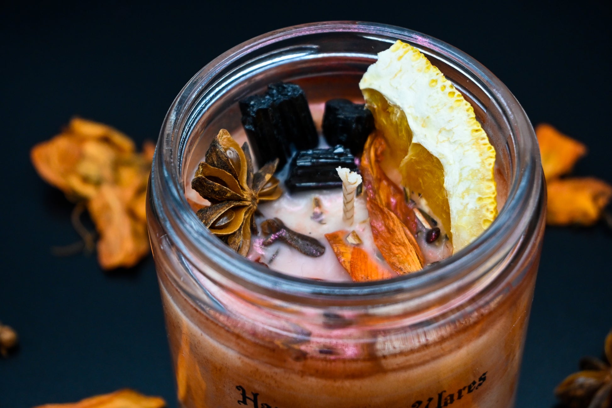To prevent potential tunneling that may occur, please remove all crystals, and to minimize fire hazards, please remove all floral and herbal embellishments prior to burning/once wax has melted enough, and never leave your lit candle unattended.