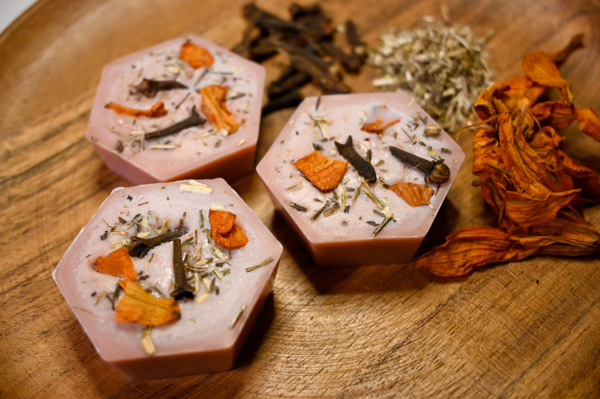 Feel the protection and power of the majestic dragon watching over you while warming our beautifully crafted protection wax tarts. Inhale deeply, feel secure, safe, and strong yet cozy and serene while enjoying the swirling smells of dragons blood, mixed with hints of clove. Sprinklings of vervain, alongside strategically placed whole cloves, lily petals, and star anise.