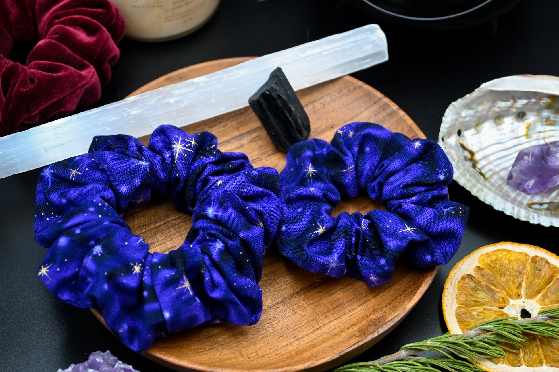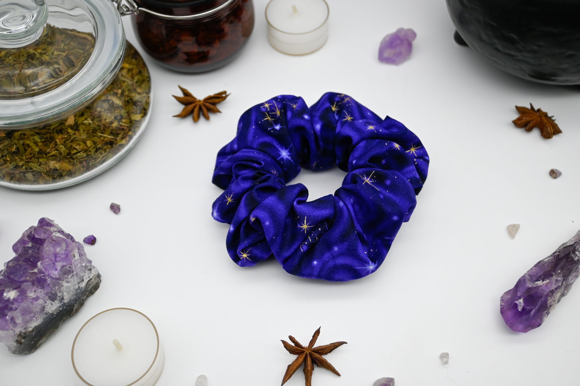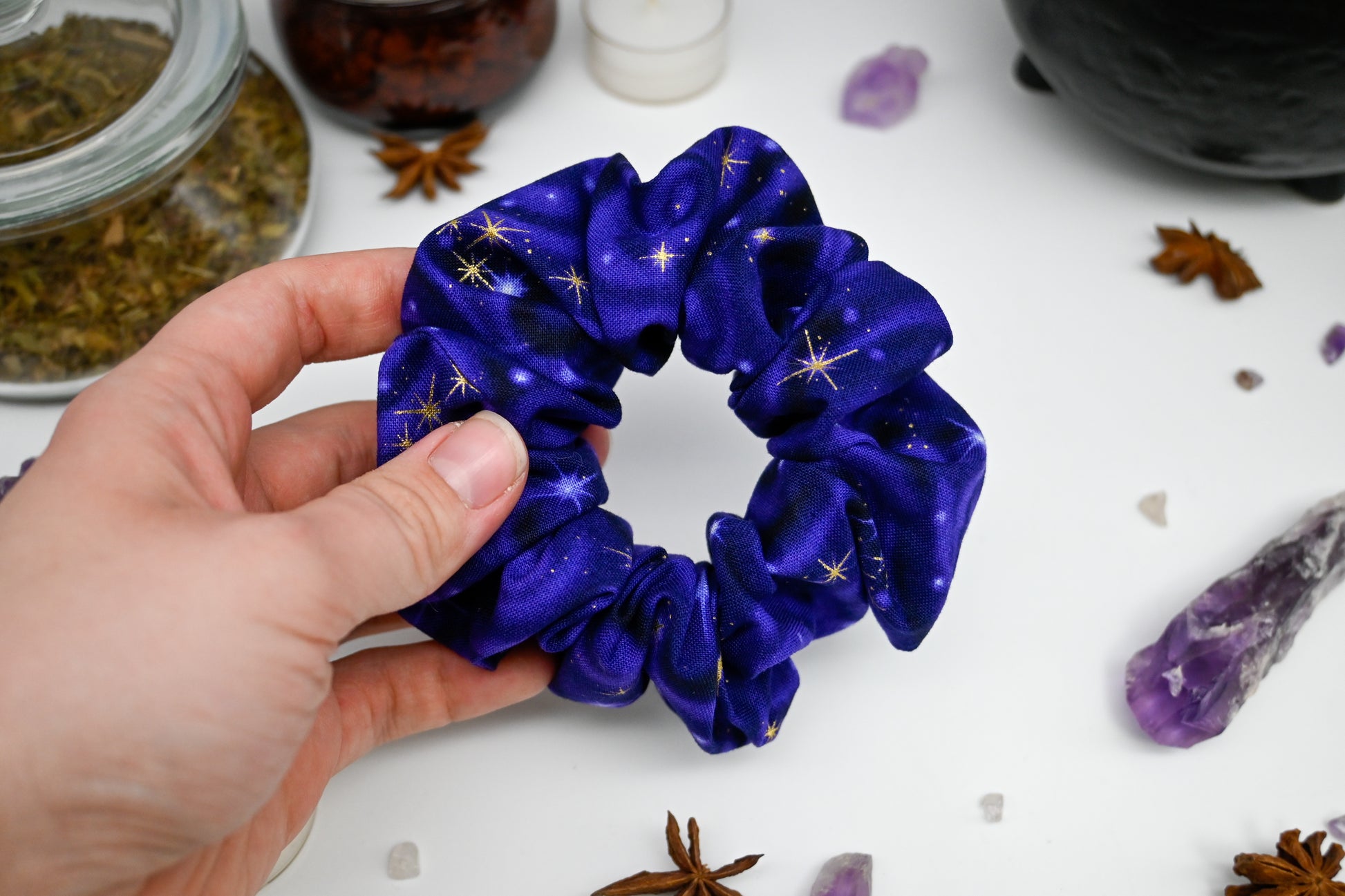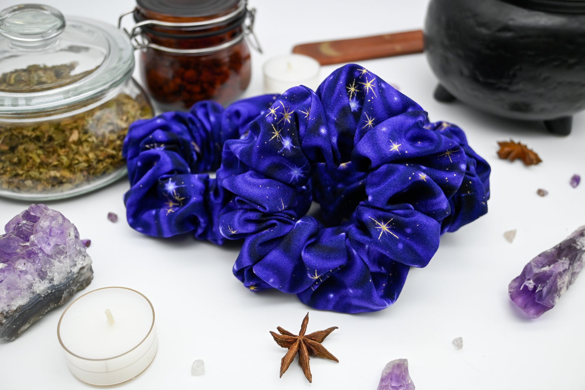 Abracadabra and alakazam! Embrace your inner magical self with these super cute magic swirled scrunchies. Perfect for every day wear to add a little whimsical happiness to any outfit. We are absolutely in love with this royal purple fabric swirled with black and deep blues and we hope you are too. Crisp white and stunning gold foil stars sprinkle the swirling purple and blue mystical background pattern resembling magical smoke from perhaps a caldron, or maybe just some incense or a candle you're burning.