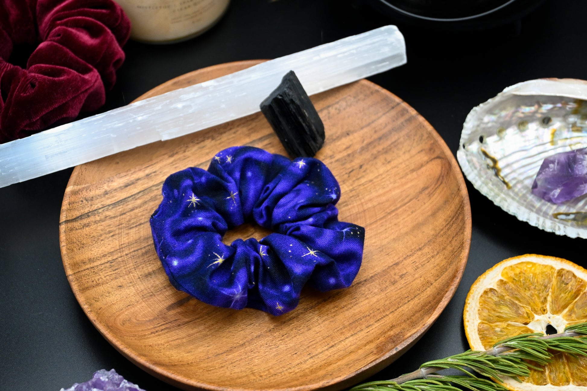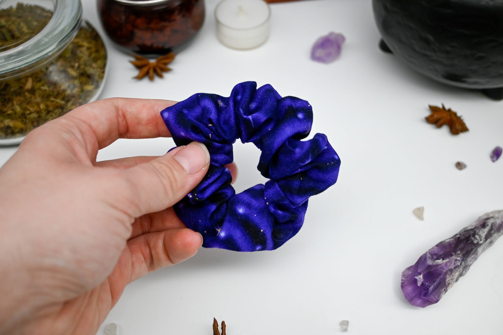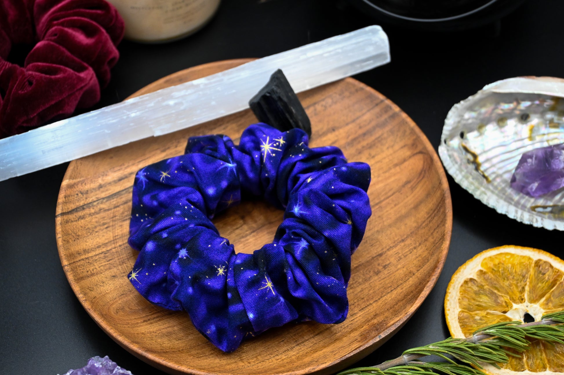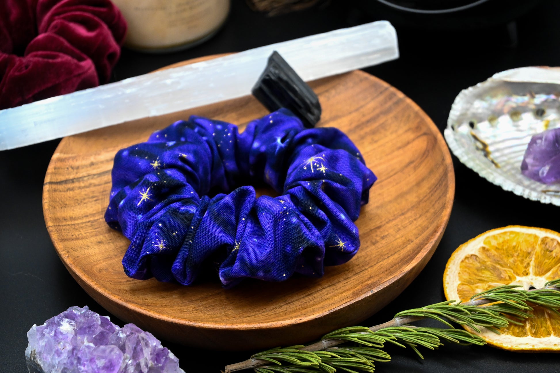 Abracadabra and alakazam! Embrace your inner magical self with these super cute magic swirled scrunchies. Perfect for every day wear to add a little whimsical happiness to any outfit. We are absolutely in love with this royal purple fabric swirled with black and deep blues and we hope you are too. Crisp white and stunning gold foil stars sprinkle the swirling purple and blue mystical background pattern resembling magical smoke from perhaps a caldron, or maybe just some incense or a candle you're burning.