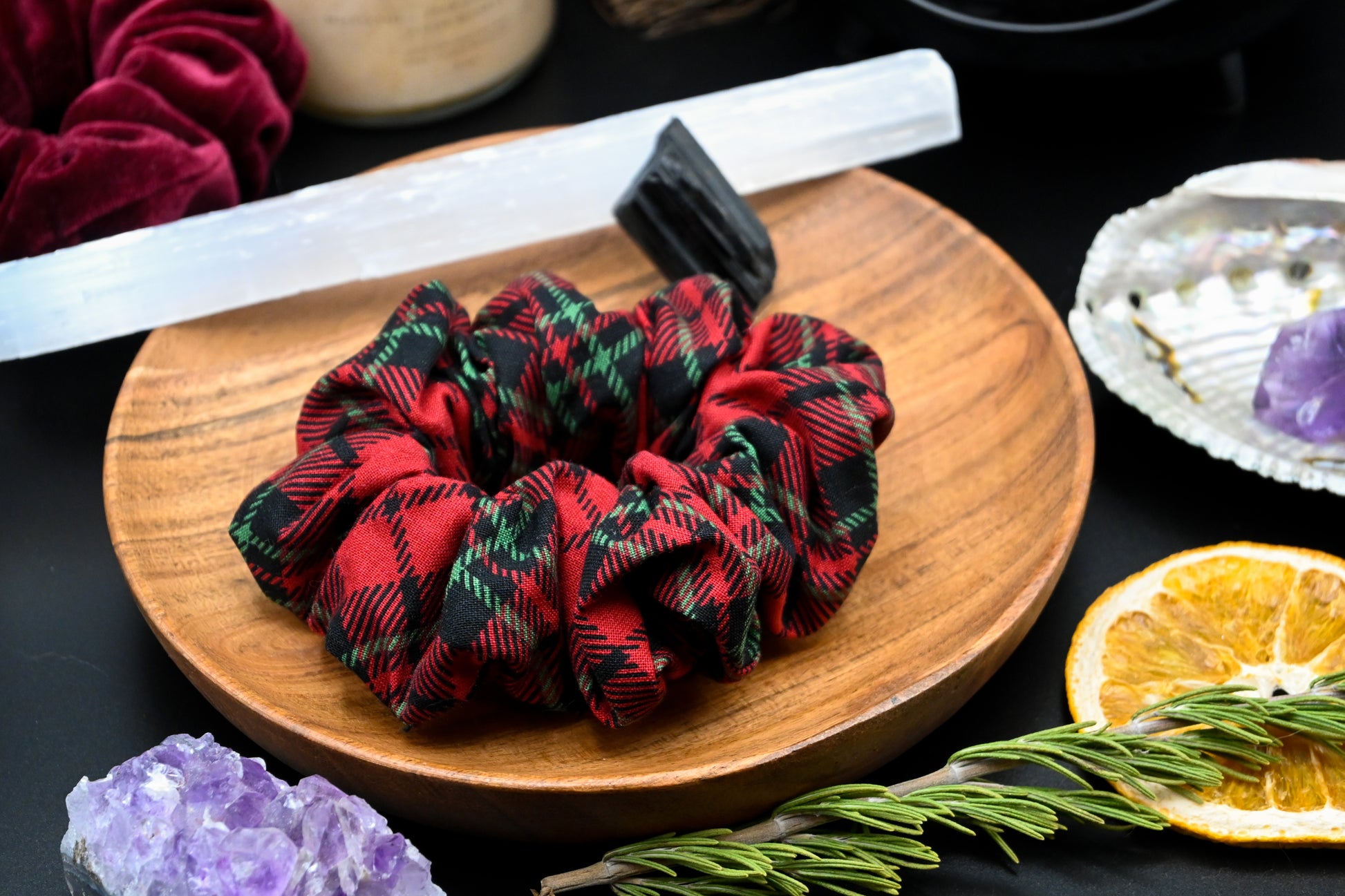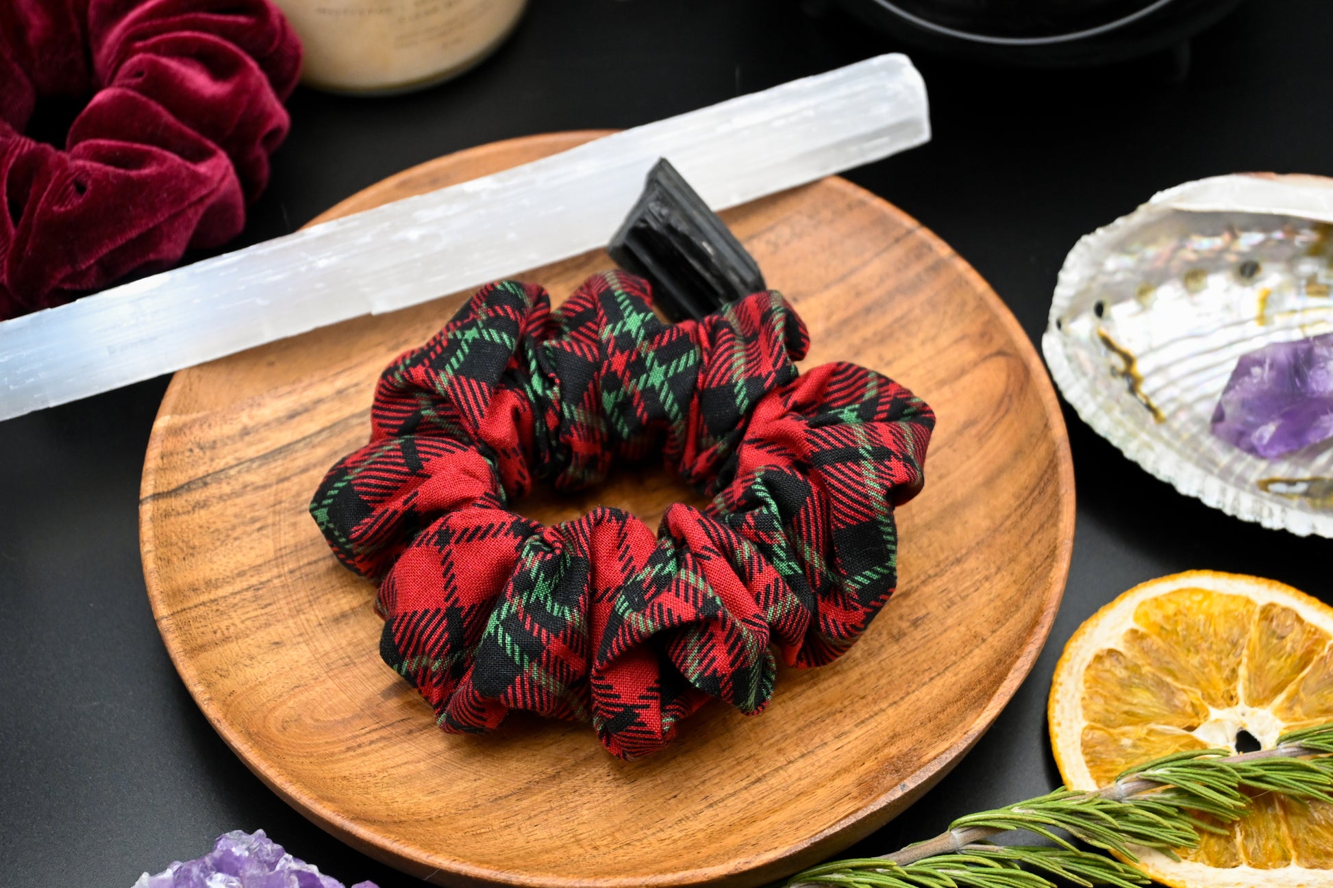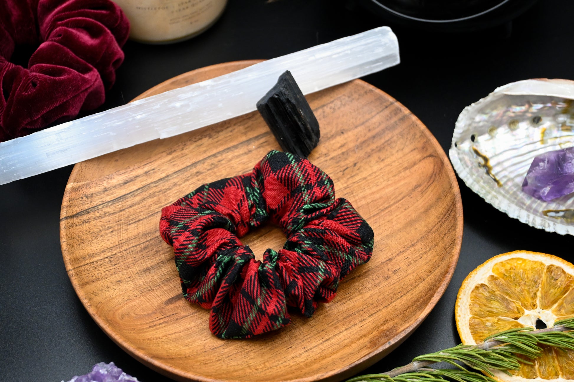 Make a statement with our cozy plaid handmade scrunchie. Choose from two different sizes and add a cozy winter touch to your outfit with the plaid pattern on scarlet red fabric. Thin green stripes, black stripes and black squares dance across the fabric. We exclusively use wide elastic in our regular size scrunchies to prevent breakage and damage to hair, and the soft cotton fabric is perfect for anyone, no matter their hair length. This is the perfect accessory to bring nostalgia and feel good emotions to everyone. Make someone's day with the perfect gift, or make your own day and get your new favorite scrunchie before they sell out!
