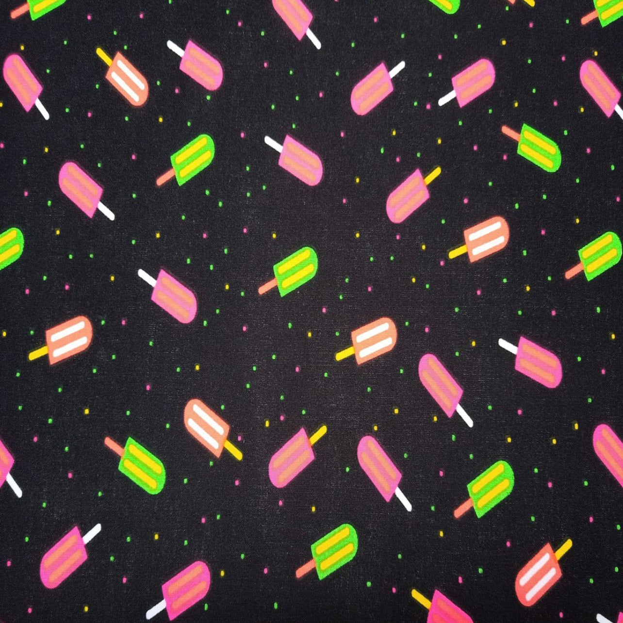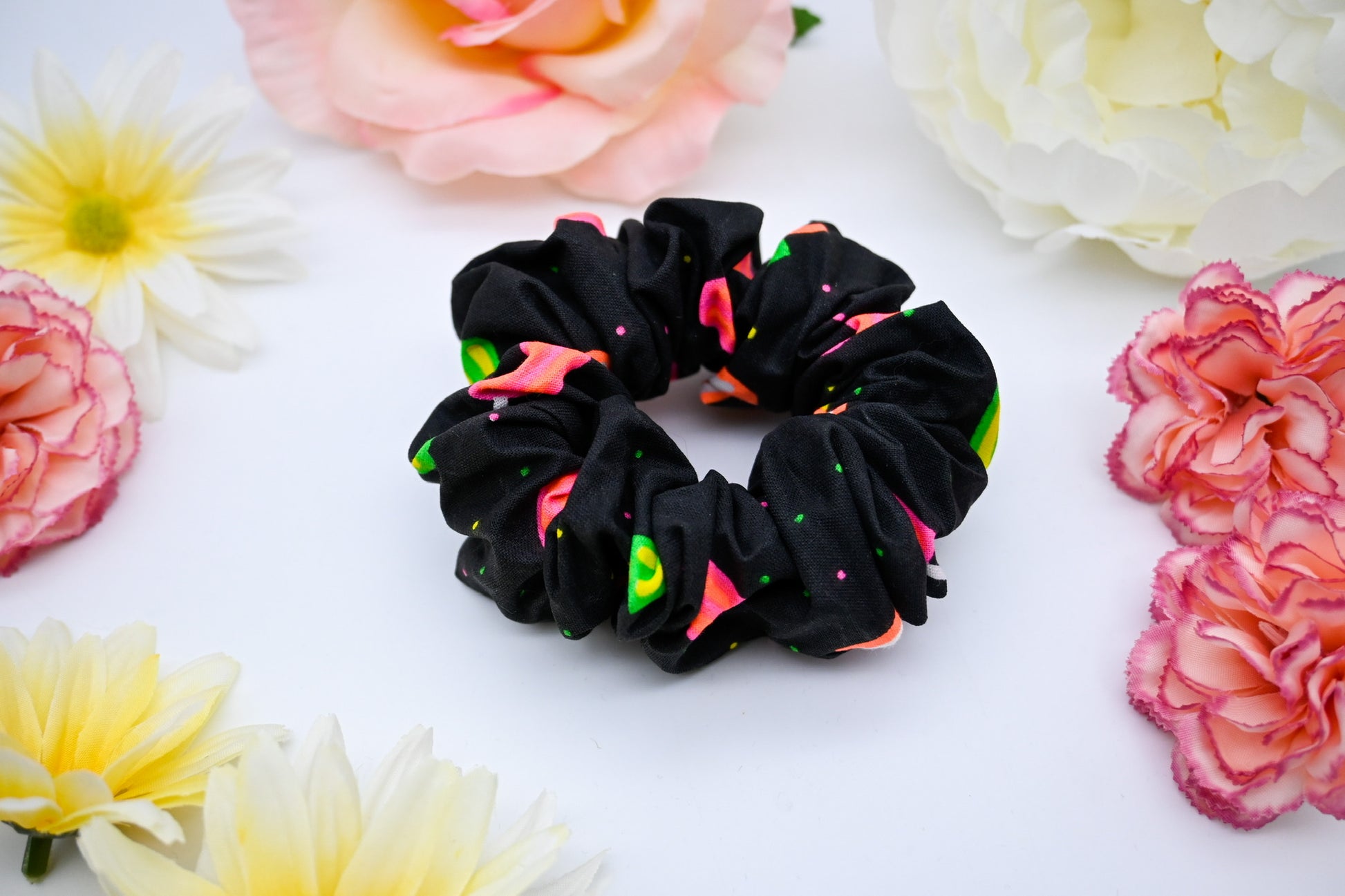 Remember those old screen savers on computers that made you feel like you were flying through space? Imagine that--but neon, and sprinkle in some popsicles. This scrunchie will not only look cool, but it will cool you off on any hot summer day and you don't even have to worry about the popsicles melting. Pretend you're in the 80s or 90s and sport this rad design with a pitch black background, lit up by fun neon popsicles and polka-dots in green, pink, orange, and yellow.