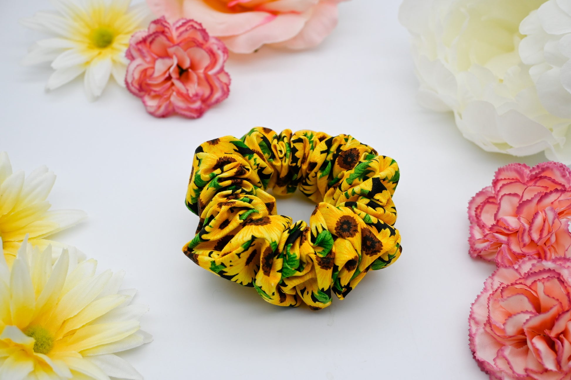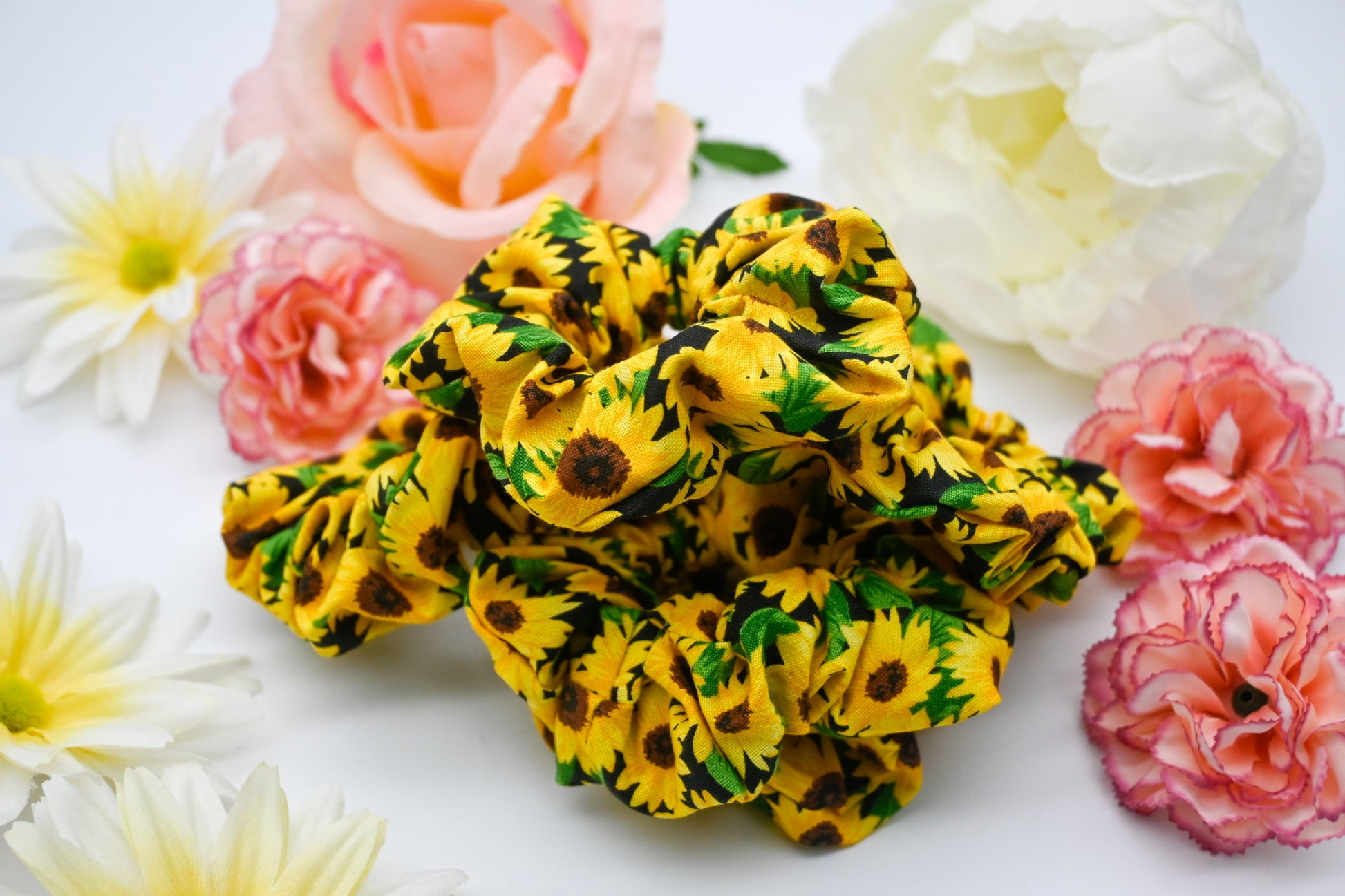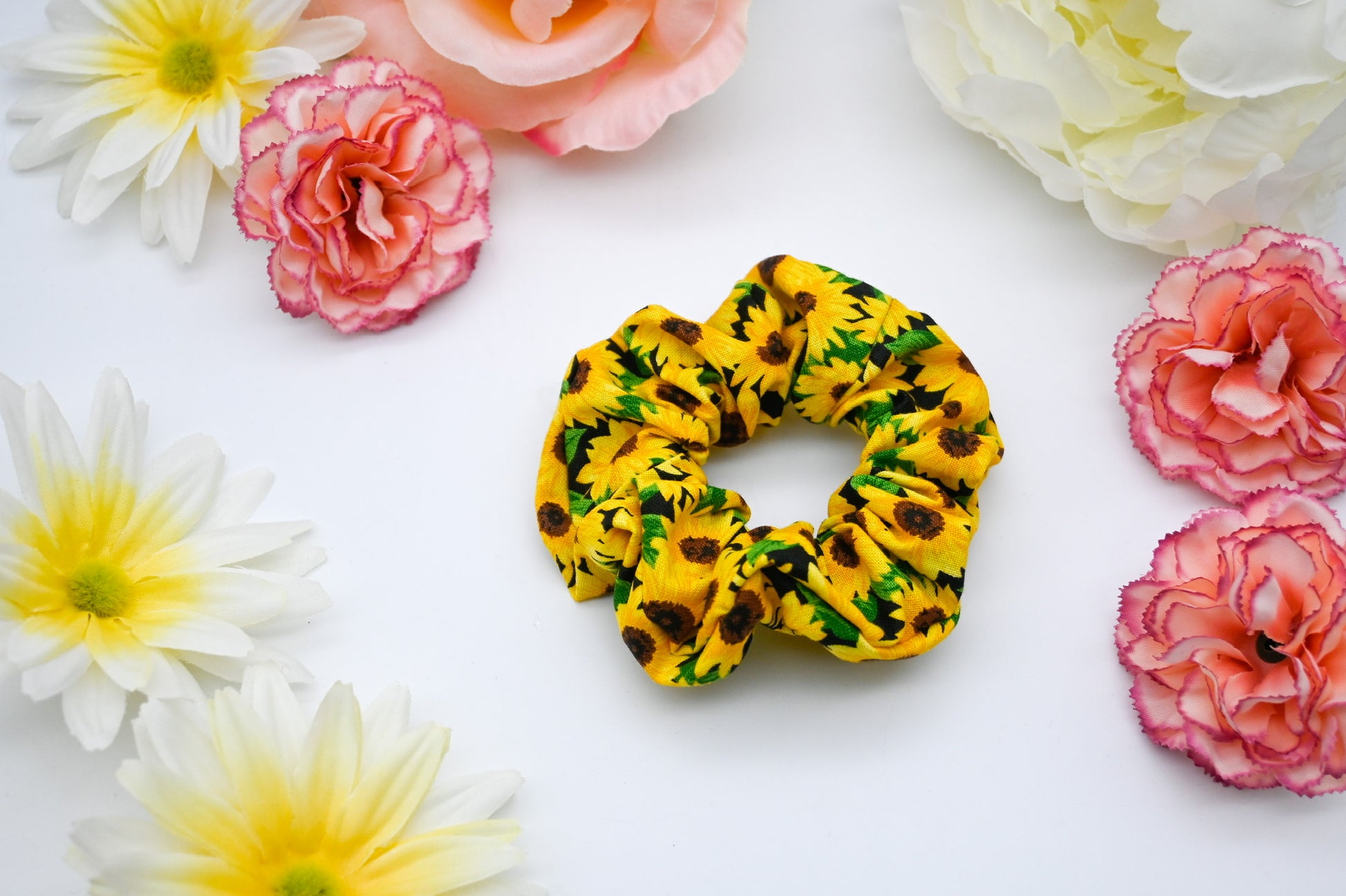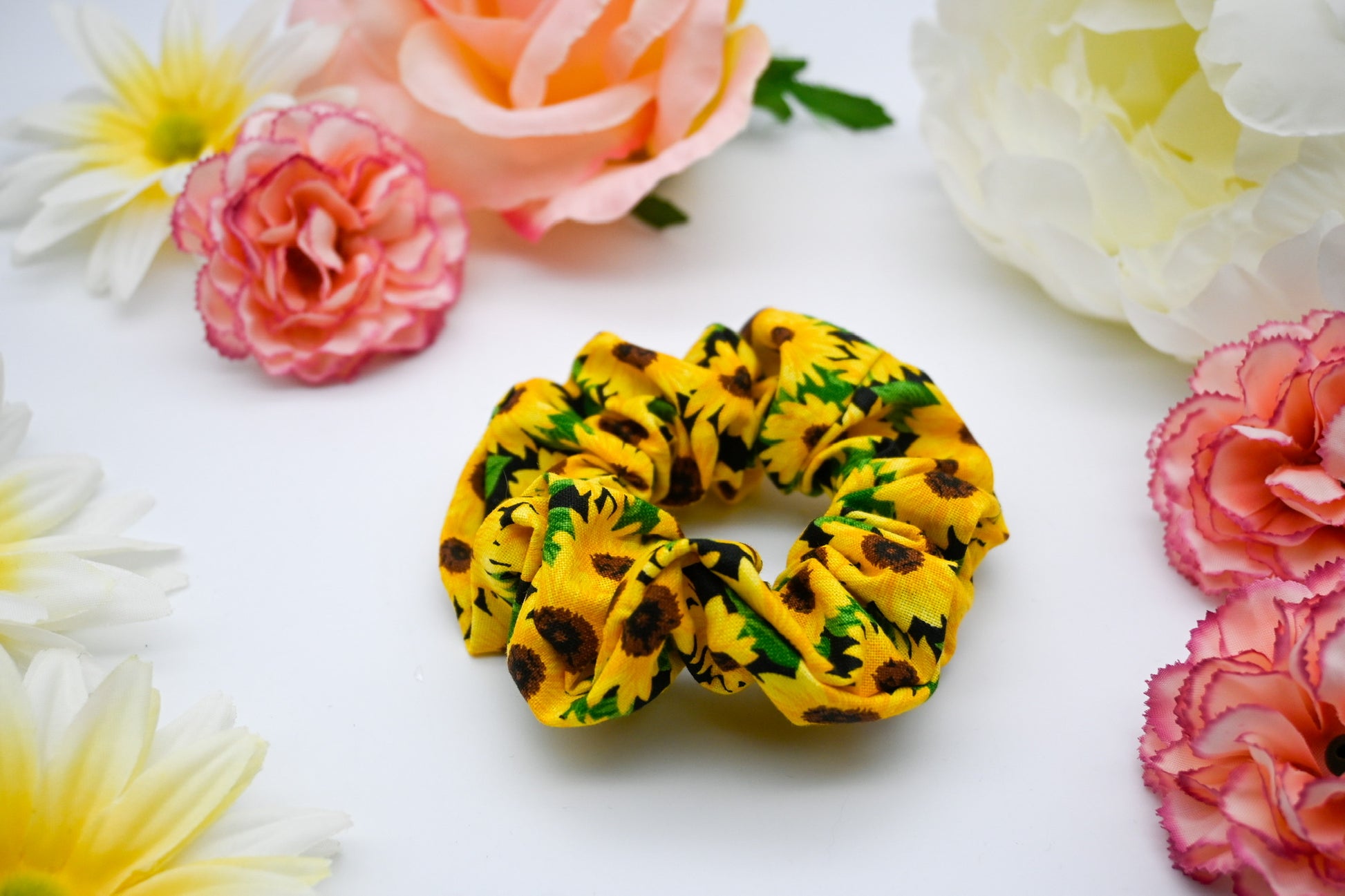 Feel the warmth of the sun light up your beaming and radiant face while you tie your hair back with this too cute scrunchie. Sunflowers are not just for summer, they reside year round in our hearts. With a cute collage of yellow sunflowers, brown seeds, and a sprinkle of green leaves you could add a little bit of floral sunshine to your life and to your wardrobe by adding this adorable scrunchie to your cart today!