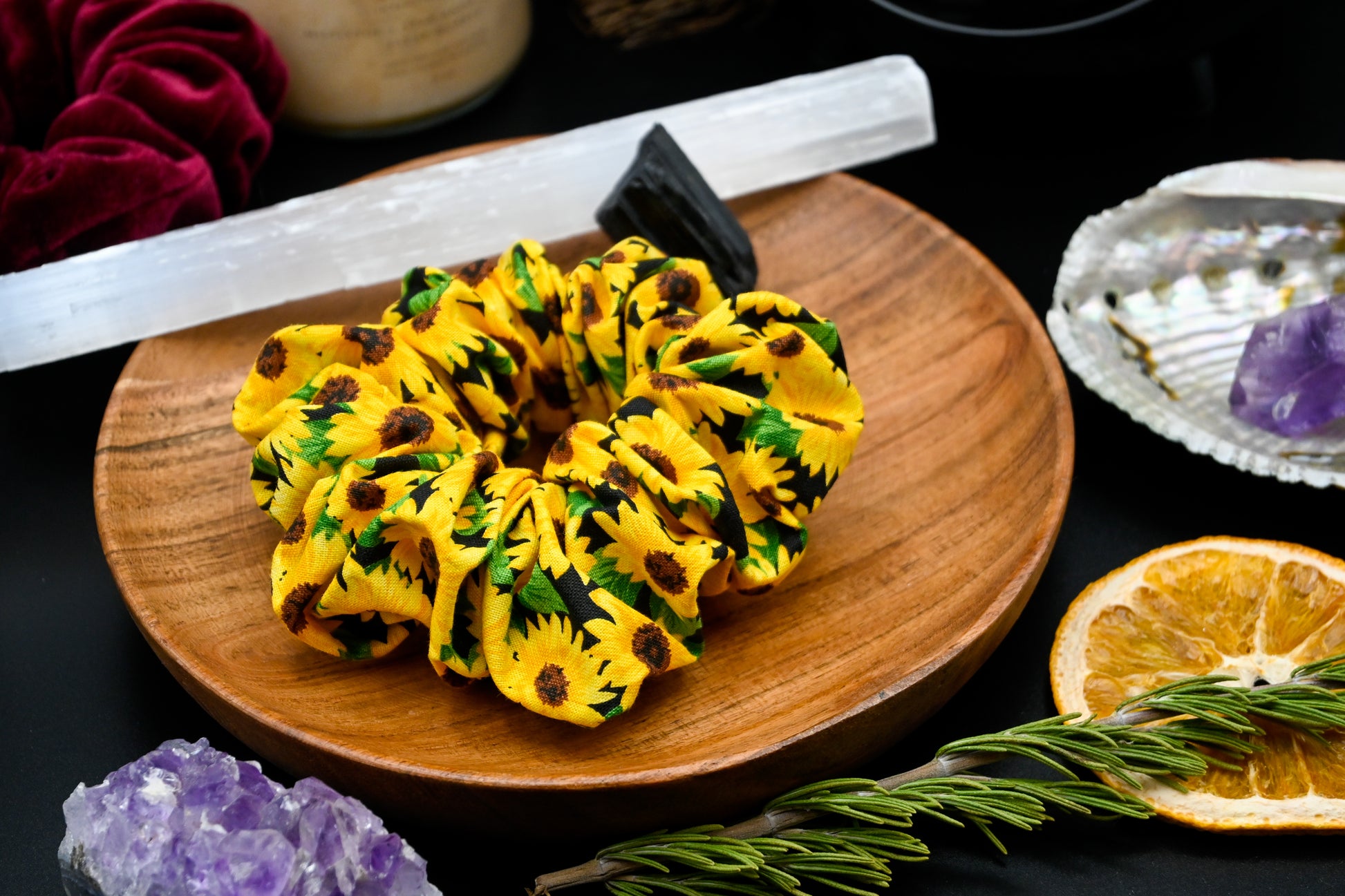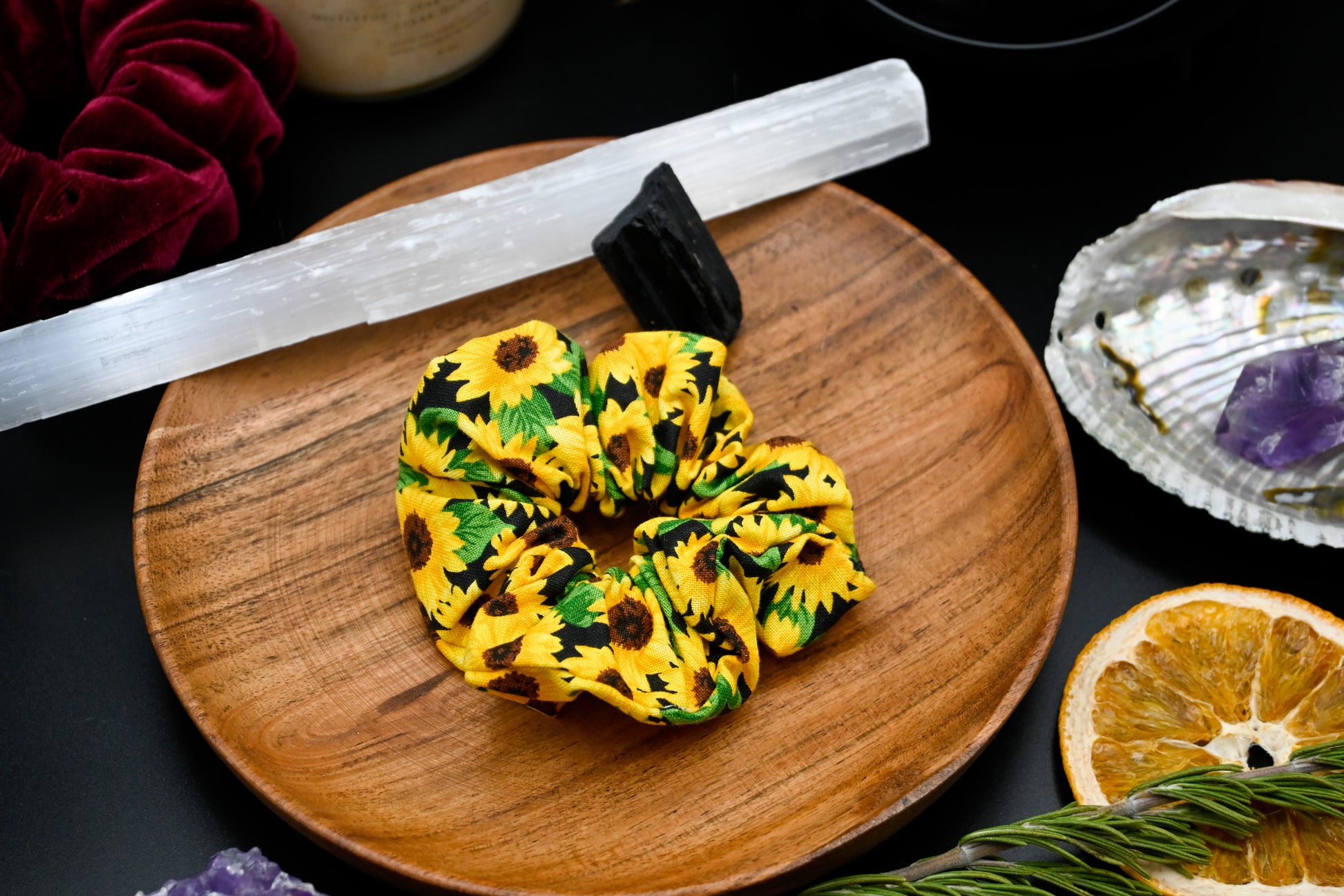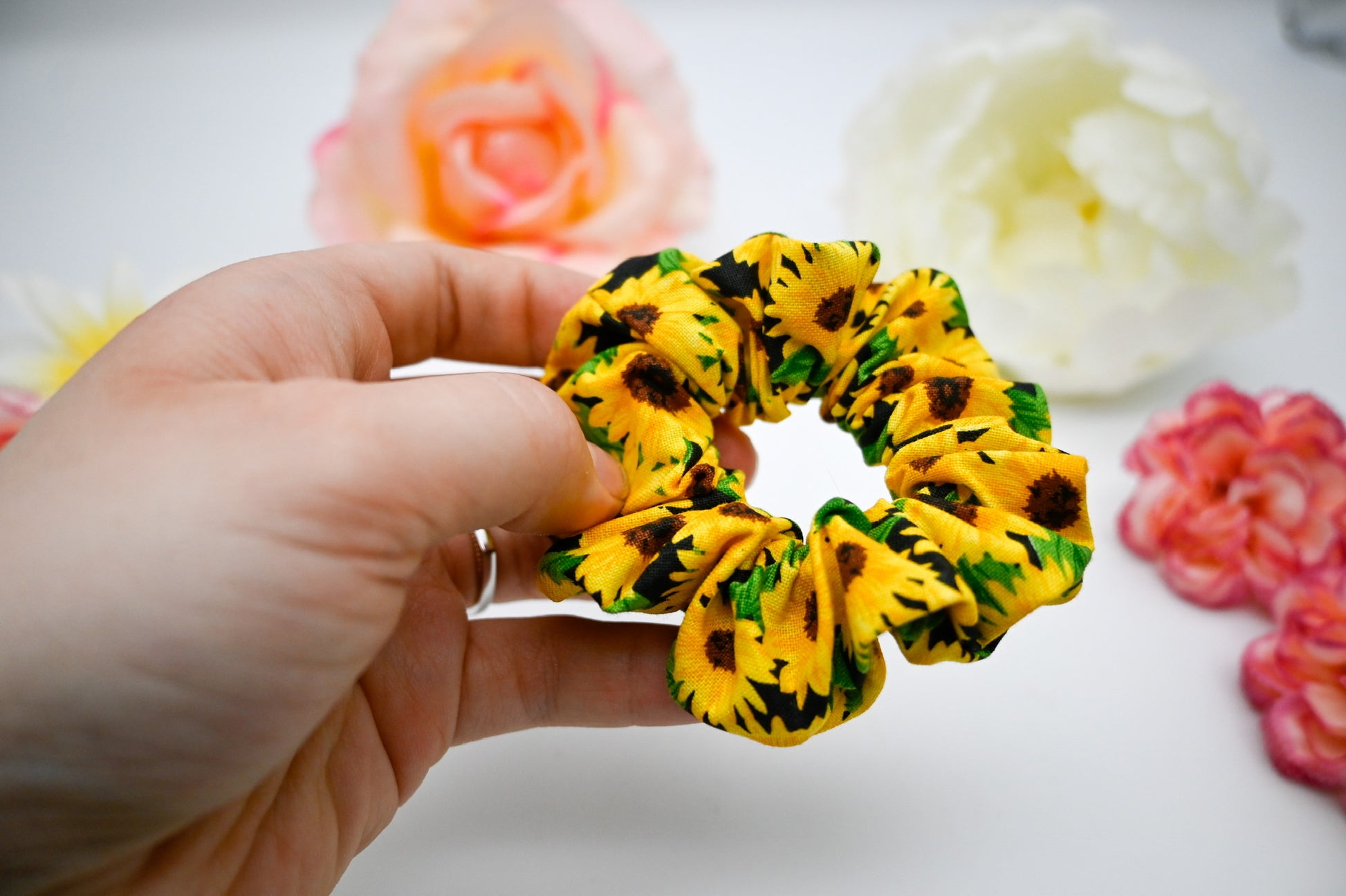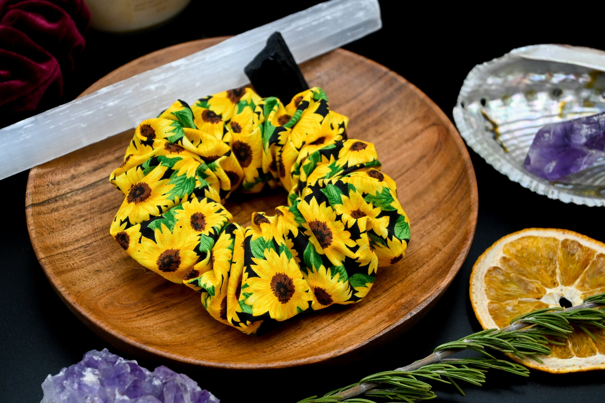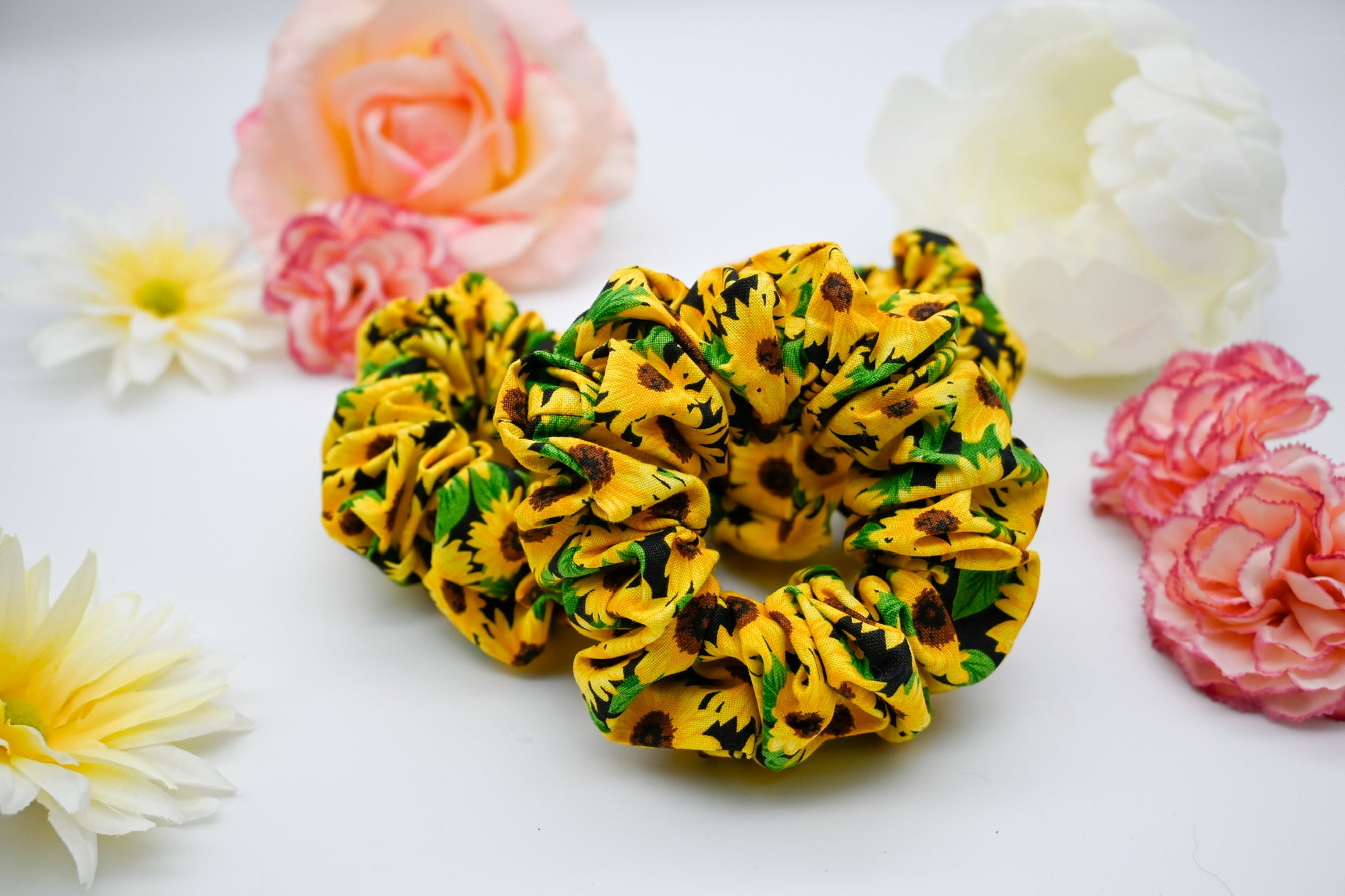 Feel the warmth of the sun light up your beaming and radiant face while you tie your hair back with this too cute scrunchie. Sunflowers are not just for summer, they reside year round in our hearts. With a cute collage of yellow sunflowers, brown seeds, and a sprinkle of green leaves you could add a little bit of floral sunshine to your life and to your wardrobe by adding this adorable scrunchie to your cart today!