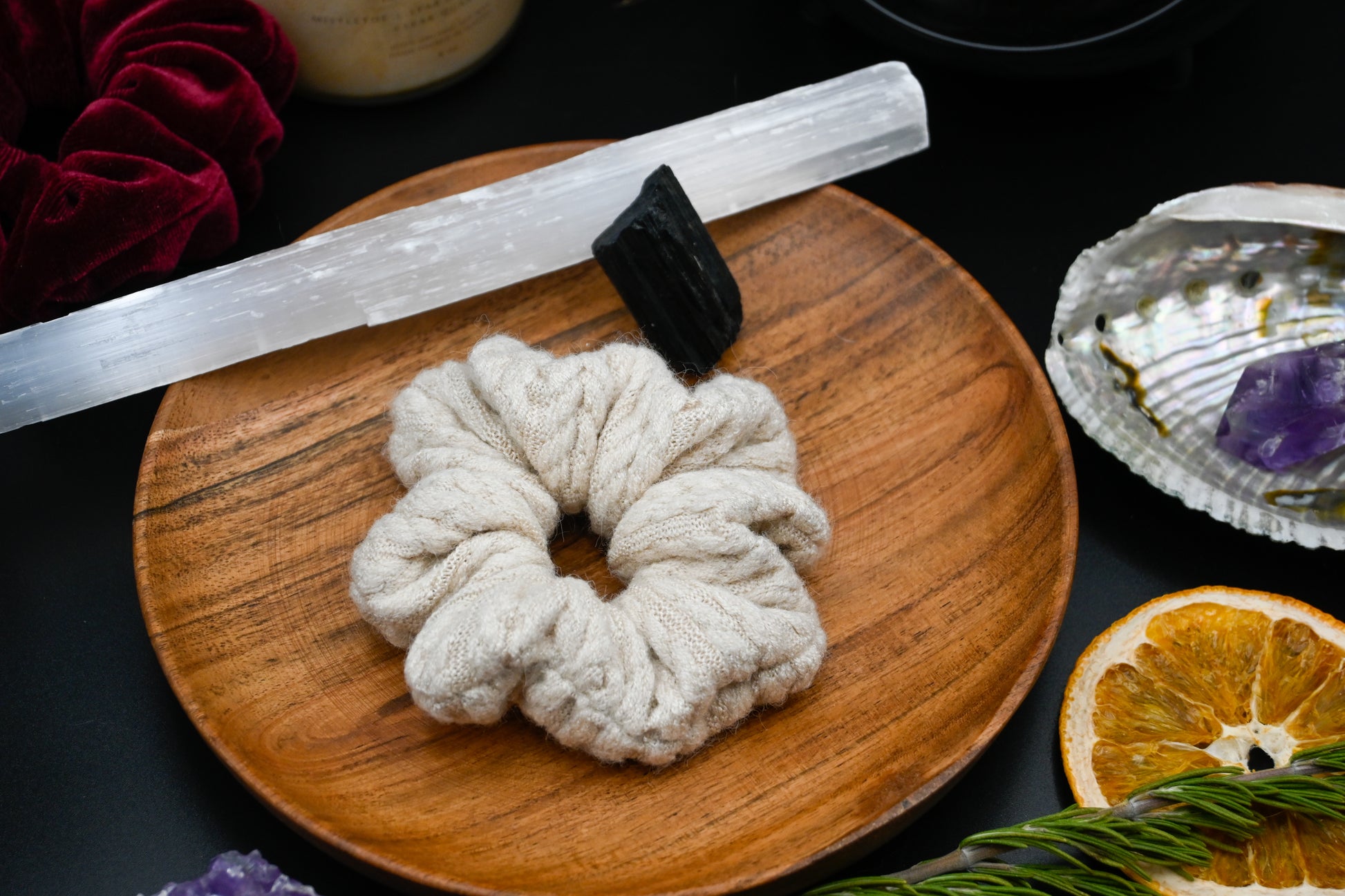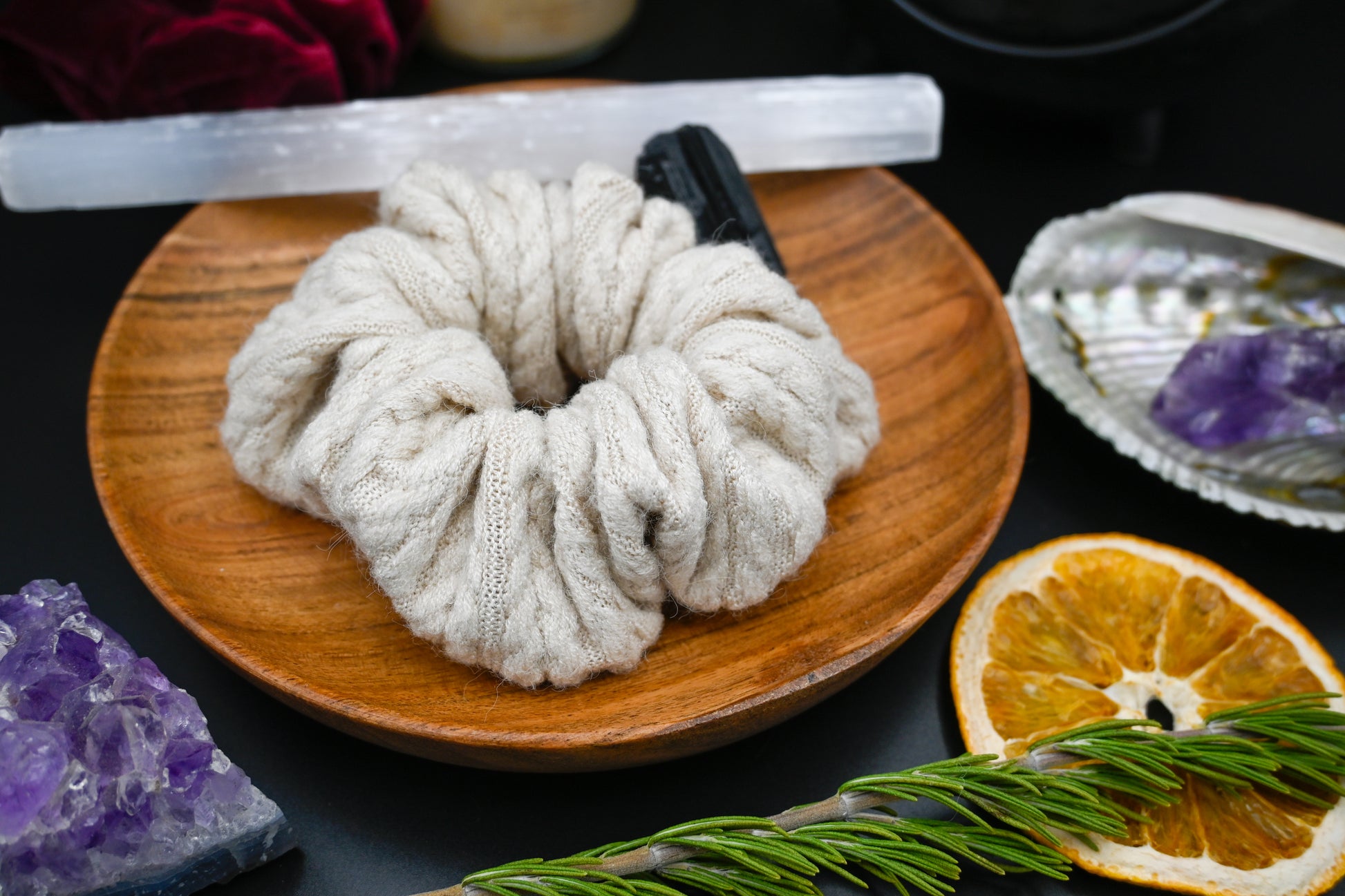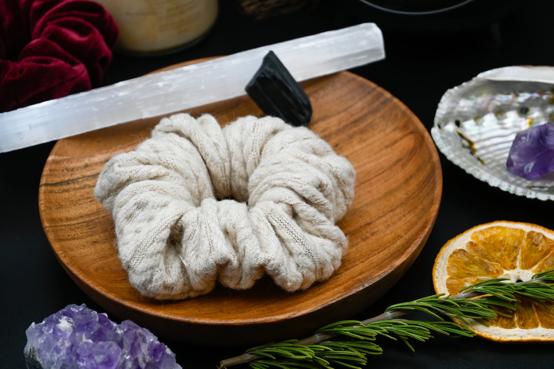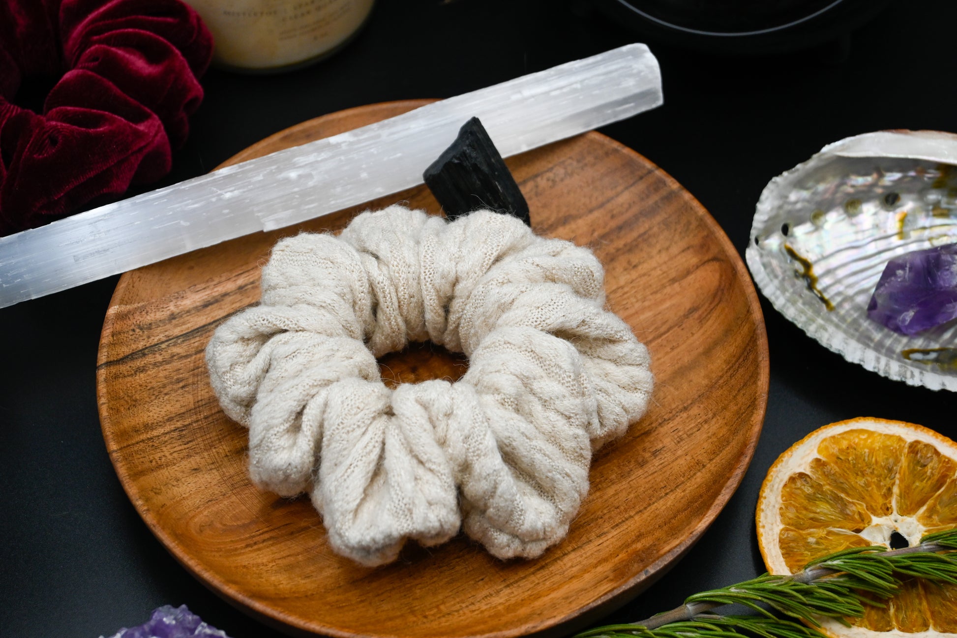 Wrap your hair up in a cozy, comfy style with this handmade scrunchie and step into ultimate coziness and comfort! This unique hair tie featuring sweater knit fabric in a light khaki cream coloring, makes you feel like you're wearing your favorite sweater without the worry of spilling your drink all down the front! Perfect for winter snuggles by the fireplace, shopping outings, playing boardgames, or just relaxing. Handcrafted with love and available in two different sizes, it's the perfect accessory for anyone with long hair who loves fashion and comfort wrapped up into one item.