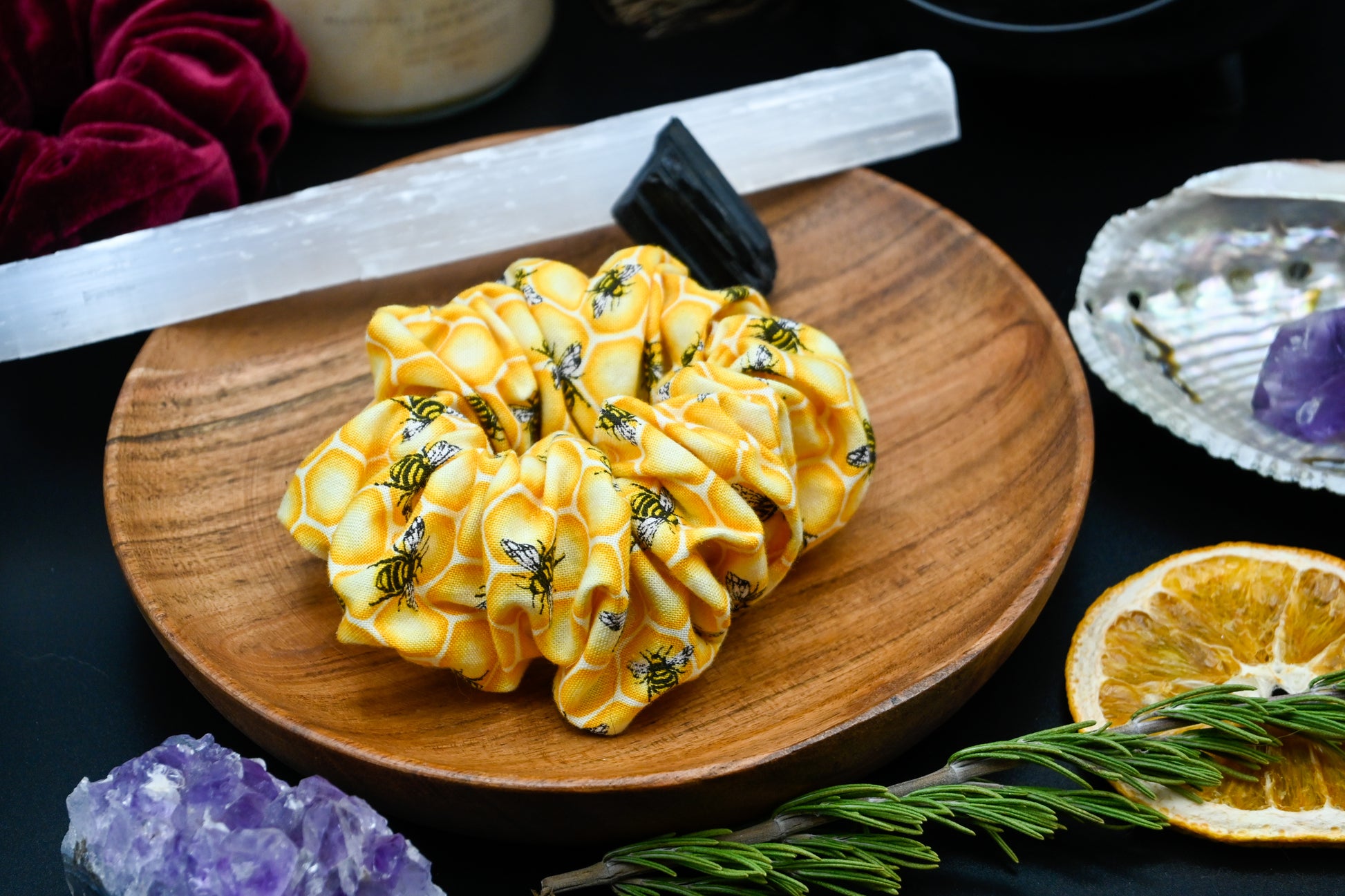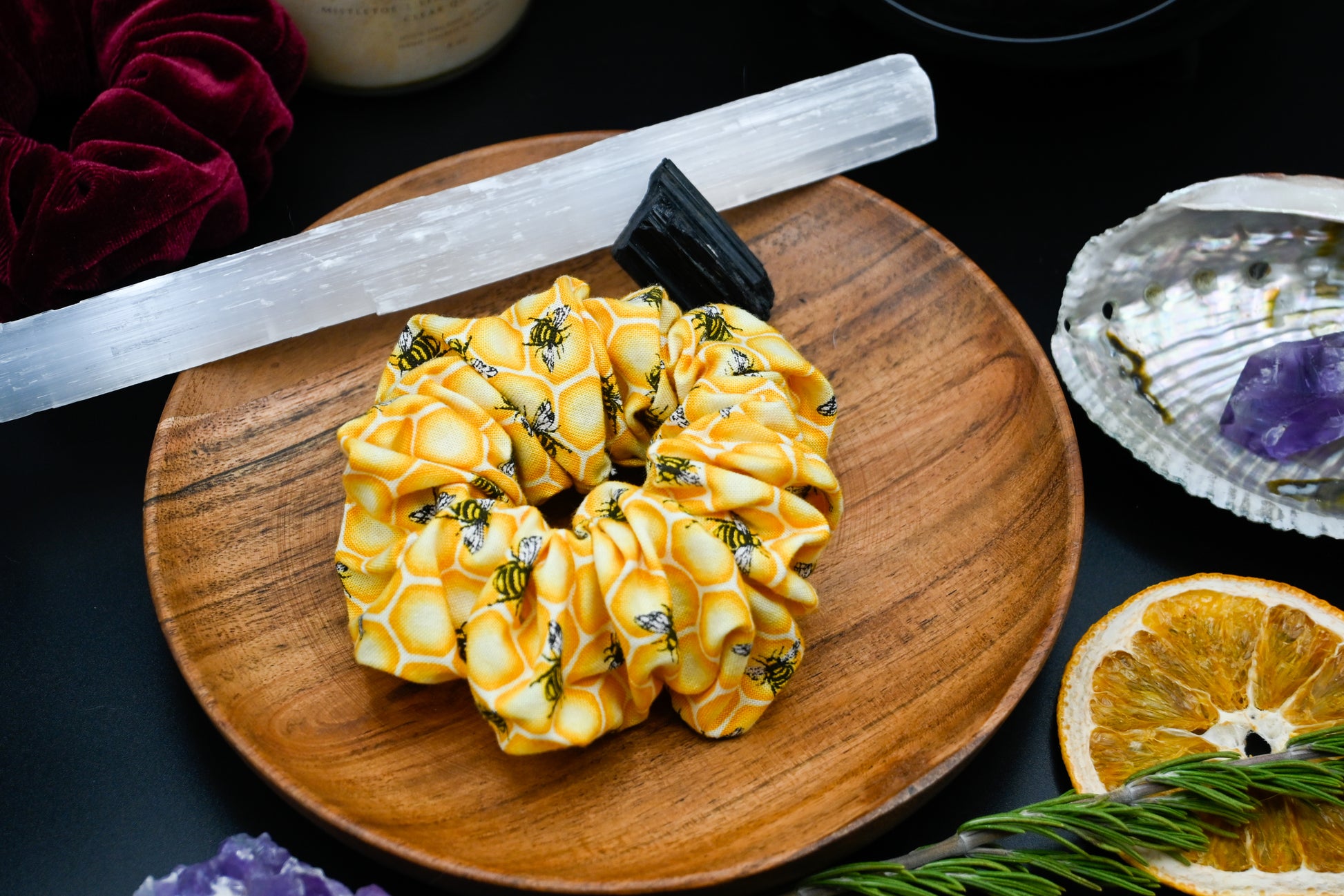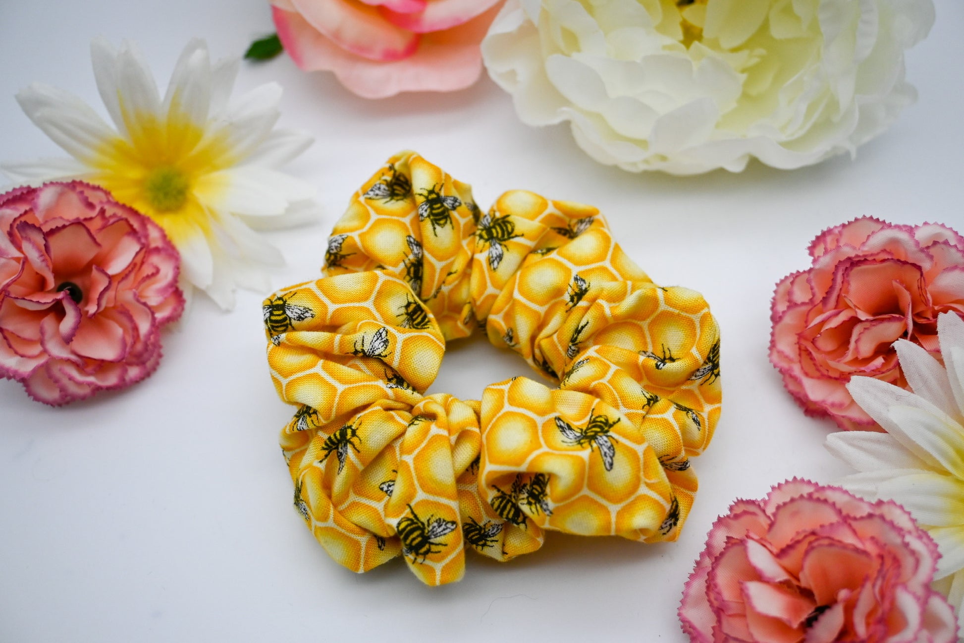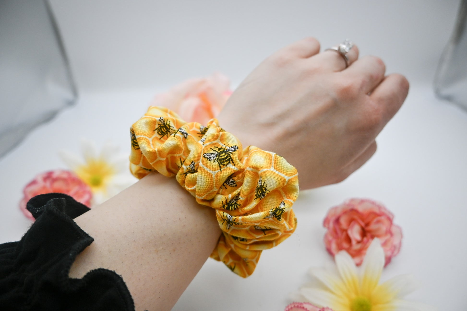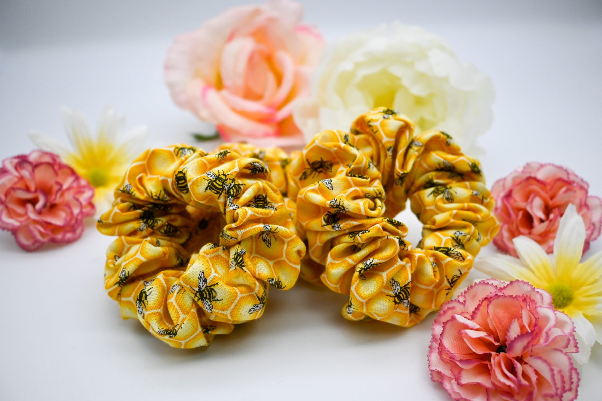 Bee one of a kind with this small batch, limited edition run of scrunchies. Sweet little honeybees in their hive adorn a yellow, gold and cream honeycomb background.