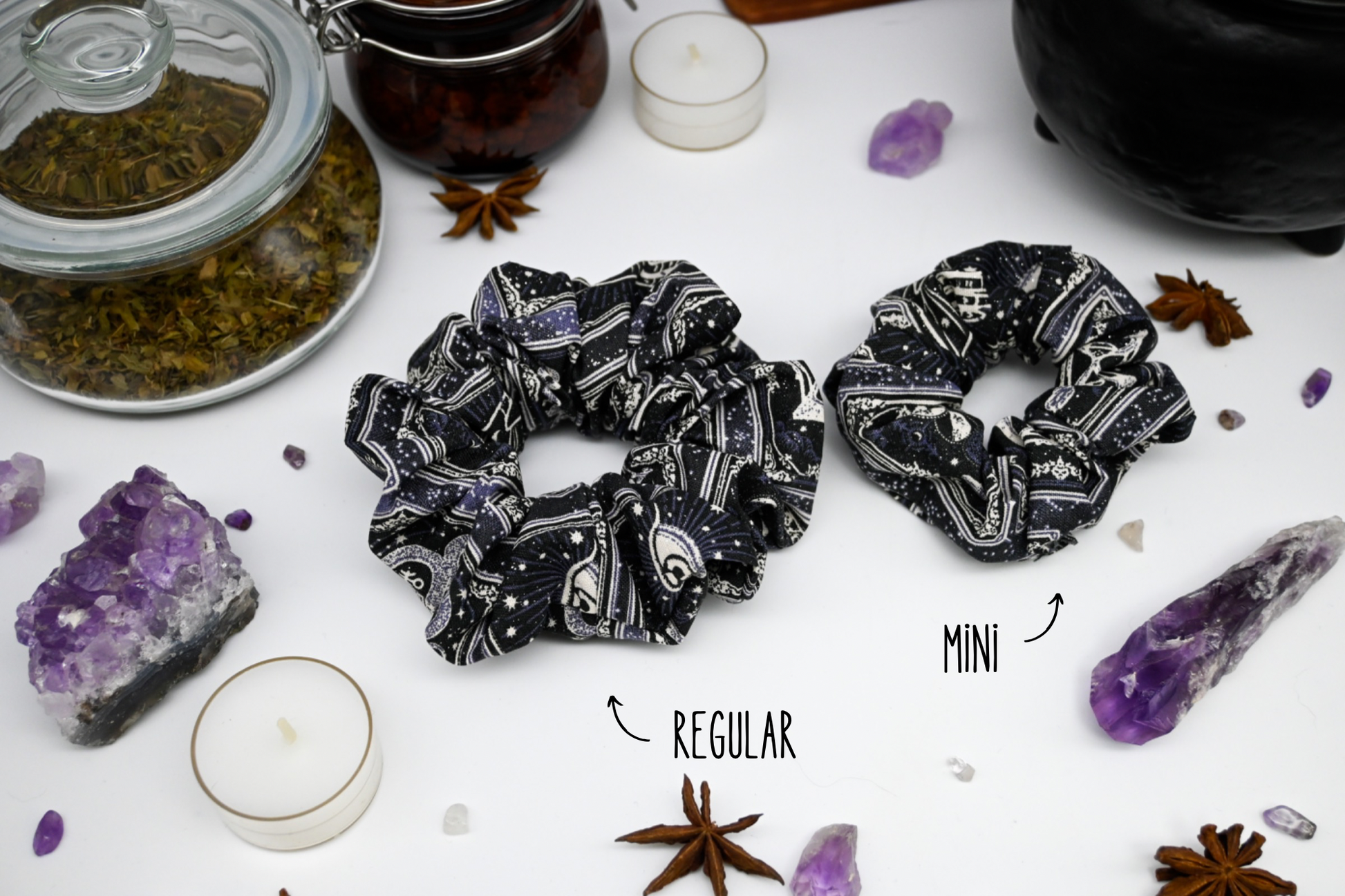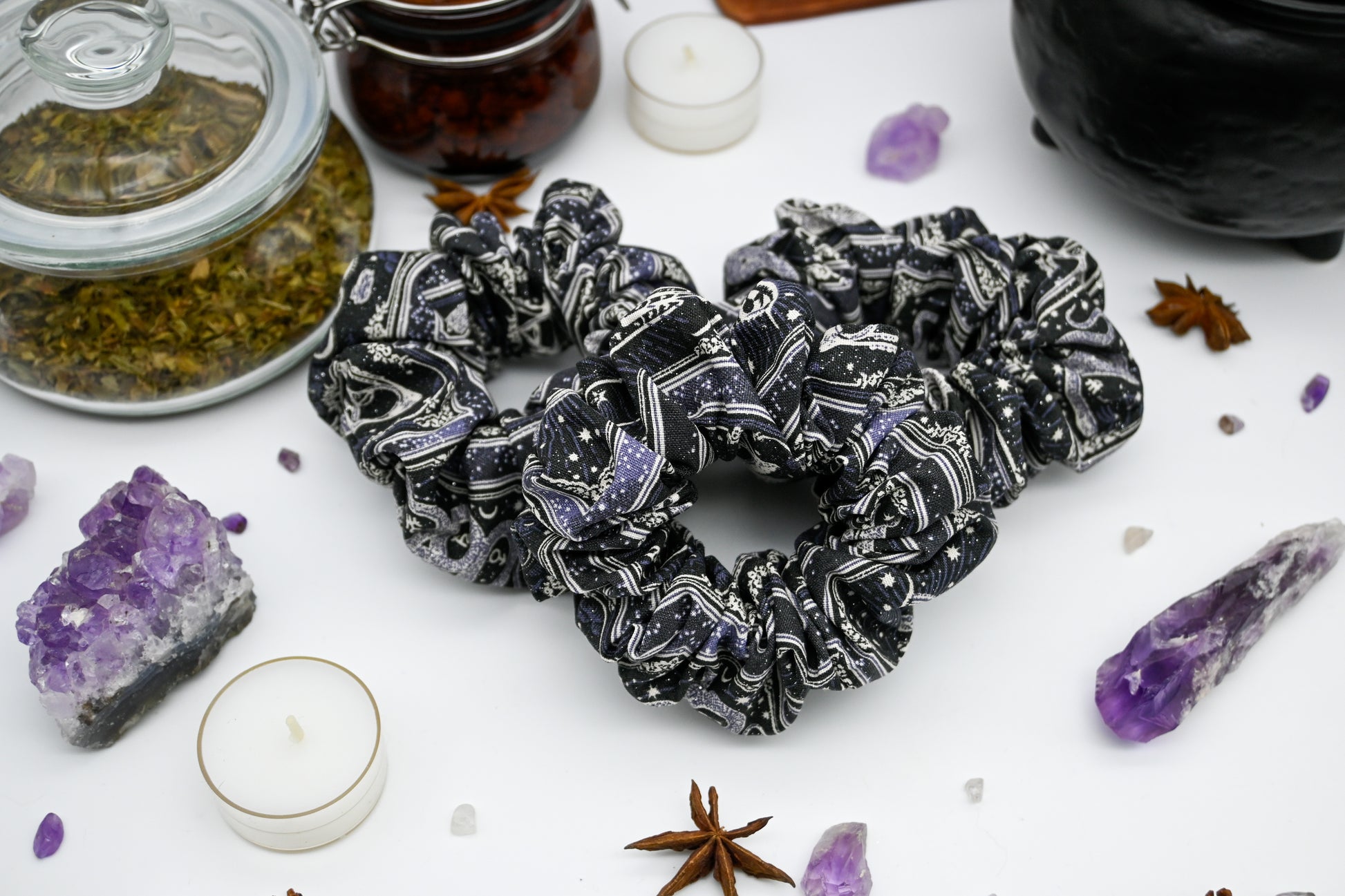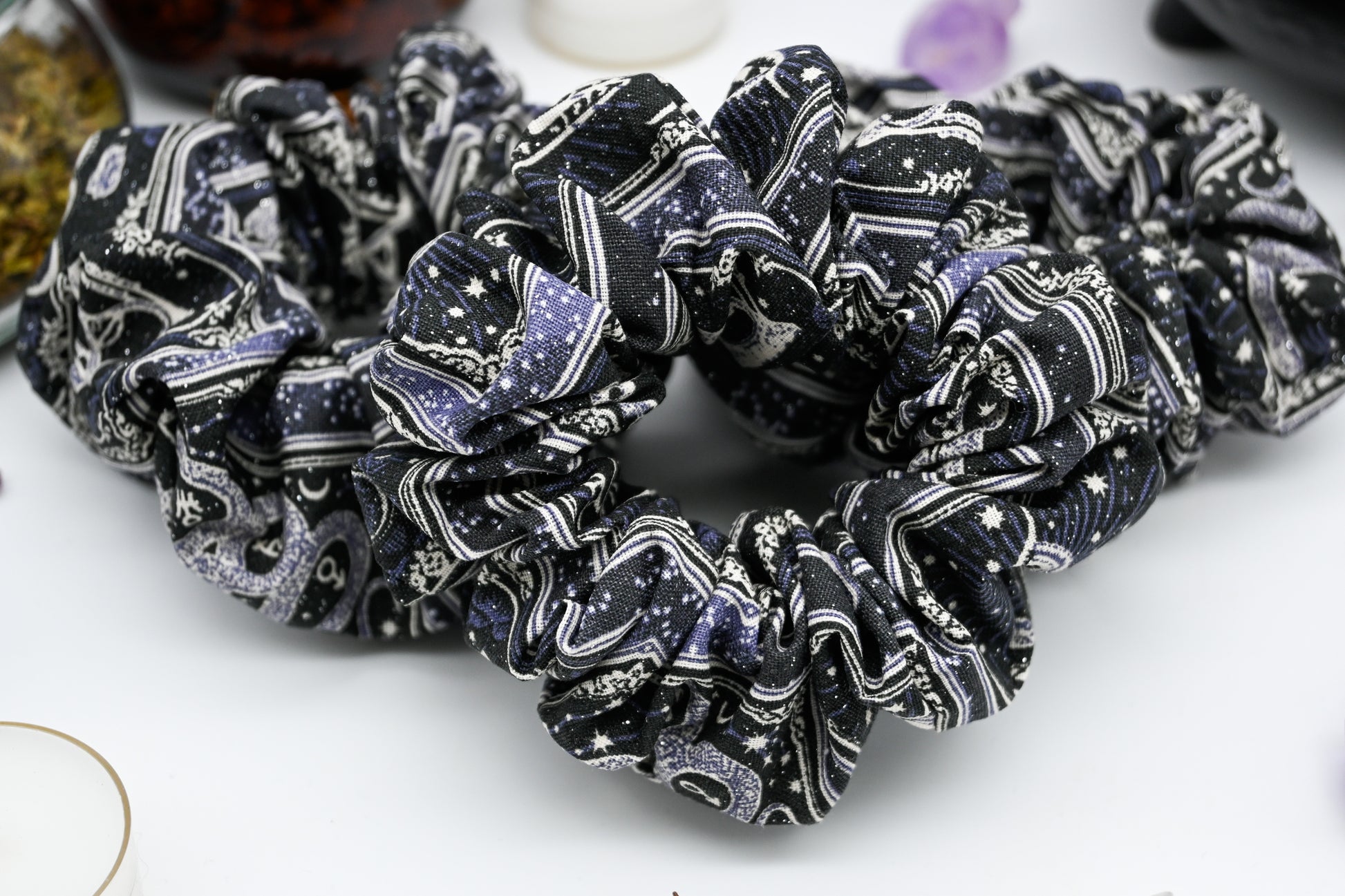 Lets glimpse into the past, the present, and the future. Is there something in your life that is reversed and you're looking for something to help yourself feel more aligned? Something to lift your spirits and sprinkle a little bit of glitter that doesn't rain on anything in your life. These scrunchies show 5 different tarot cards in stunning shades of royal purples, dusty lavenders, greys, charcoals and blacks.