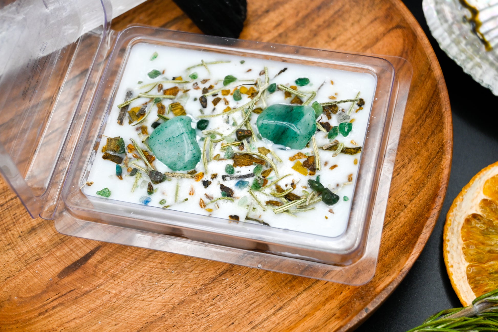Bring all of the things you want into your life, be abundant in all you do and all you receive, feel abundant in all things you do and are in life. When melting your new intention wax melts, simply clear your mind and imagine all the things you want in life coming to you with ease. Things you desire flow to you freely. Take a nice deep breath, feel the calming aromas of our Washington pine tree, sweet and tart cranberry swirled with crisp apple orchards fill your senses, exhale deeply and feel negativity flow out of your life. Feel yourself in a forest of inspiration, sprinkled with star anise, mistletoe and rosemary. Each clamshell has your choice of green aventurine stones and chips or green apatite stones and chips.