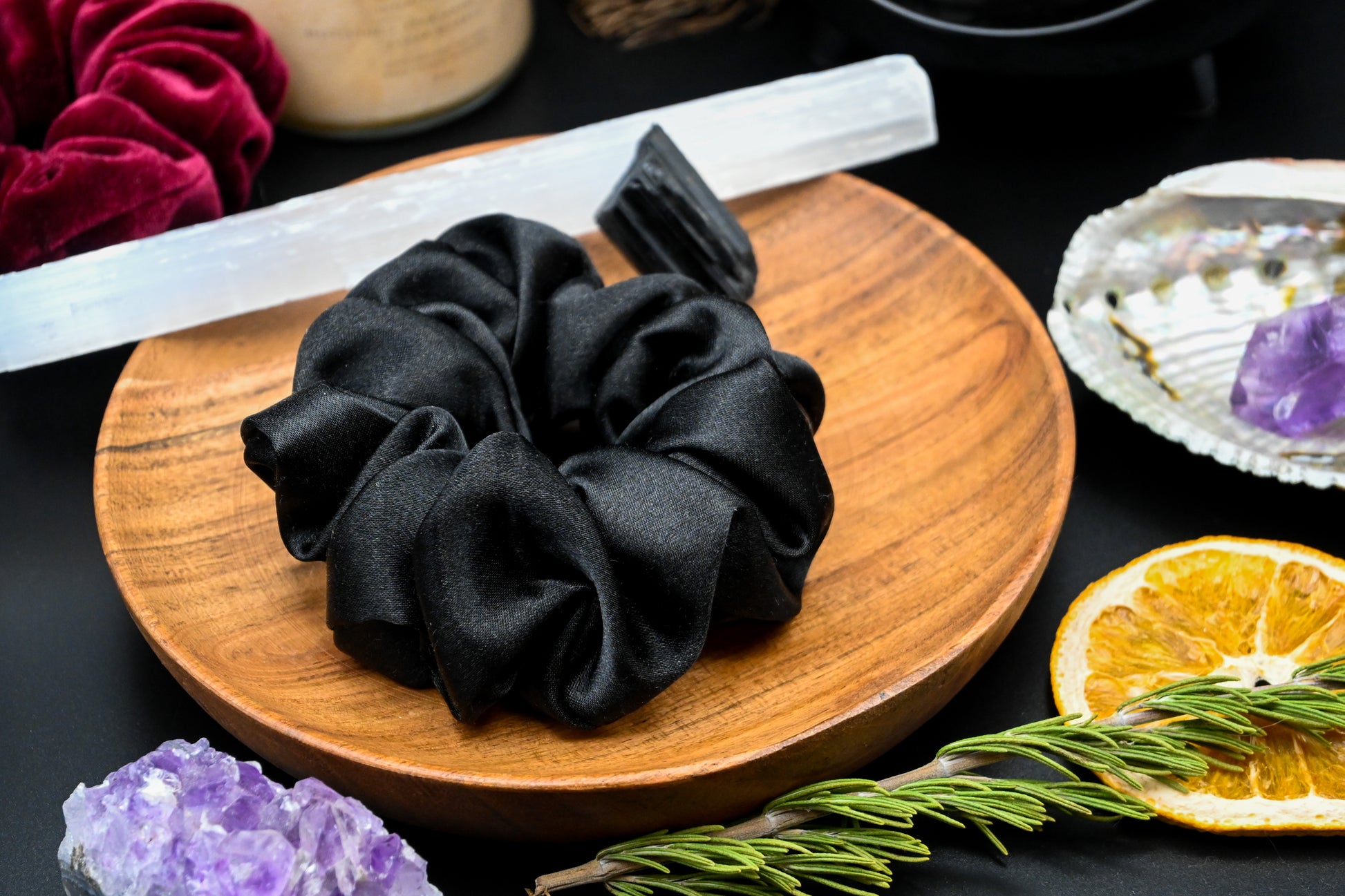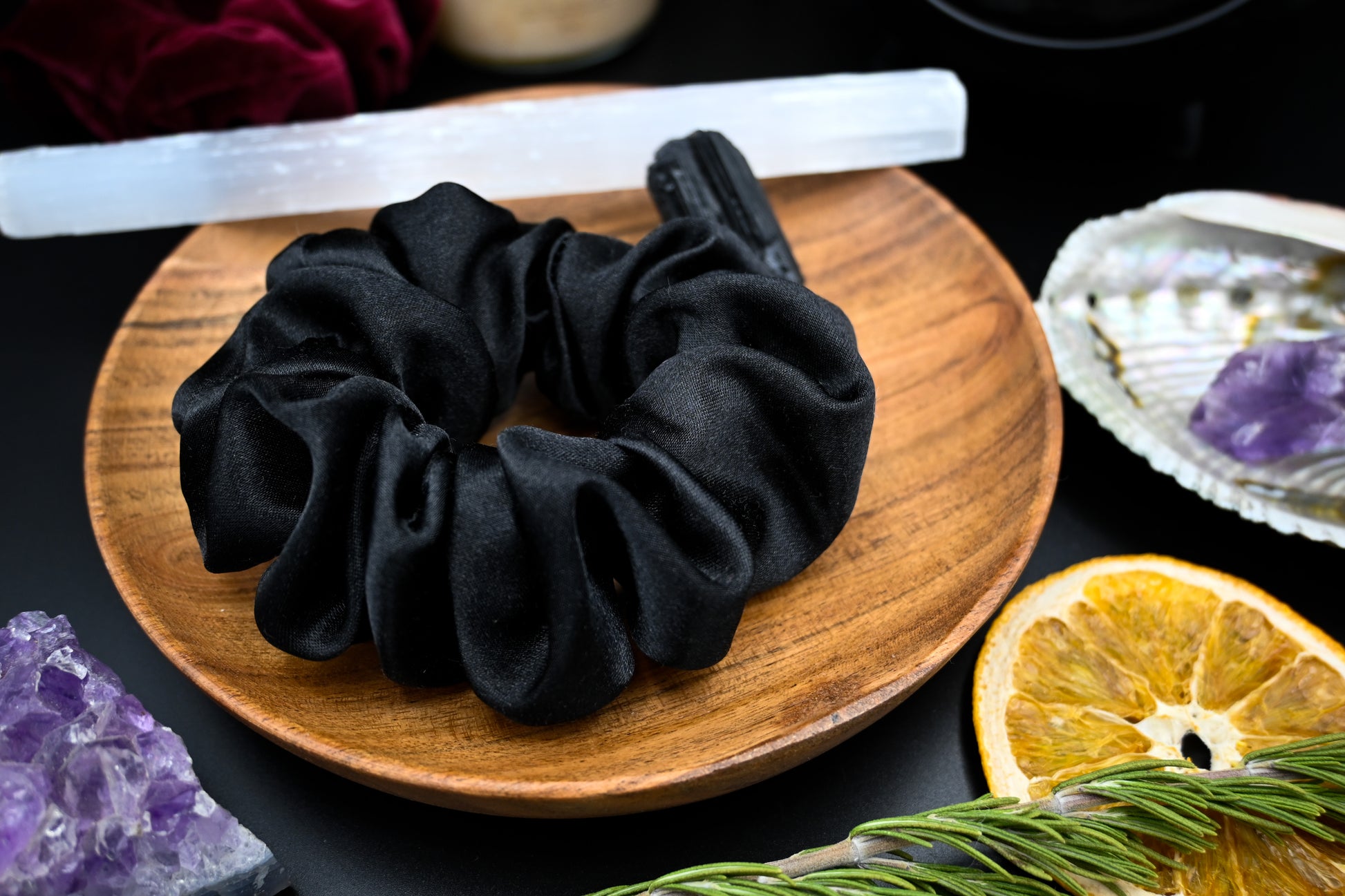 Smooth, elegant, sexy and sleek, these beautiful midnight black scrunchies add a bit of class and mystery to any outfit you wear them with.