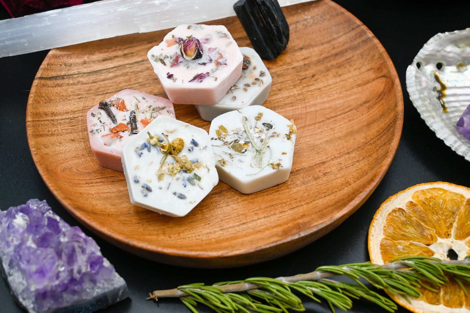 Our intention wax melts are hand poured in the cozy of our home, to gift your own with the feeling of cozy comfort when enjoyed. Each beautiful tart is made with 100% soy wax, and is totally paraben and phthalate-free.