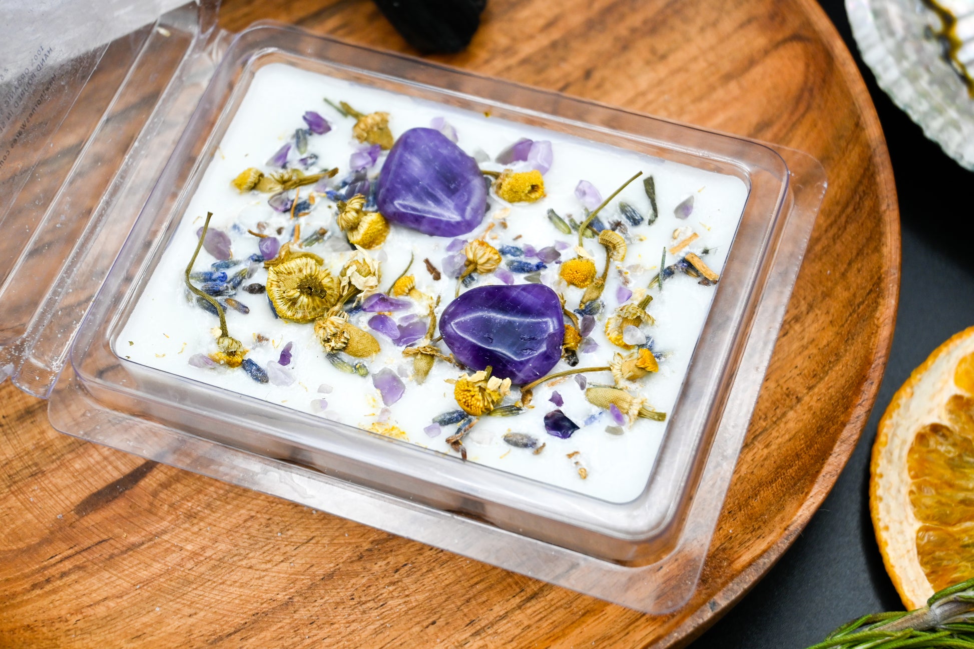 Feel your anxiety, tension, and stress melt away as your body becomes less wired and more grounded. Inhale the light and relaxing lavender chamomile floral blend this new scented wax brings you. Please un-clench your jaw, lower your shoulders, and rest your anxious hands with us. You are safe and sound within your soul, and with us always. Each tartlette is sprinkled with lavender, valerian root, and chamomile to promote sleep and anxiety relief. Each clamshell includes tumbled amethyst for you to keep in your collection!